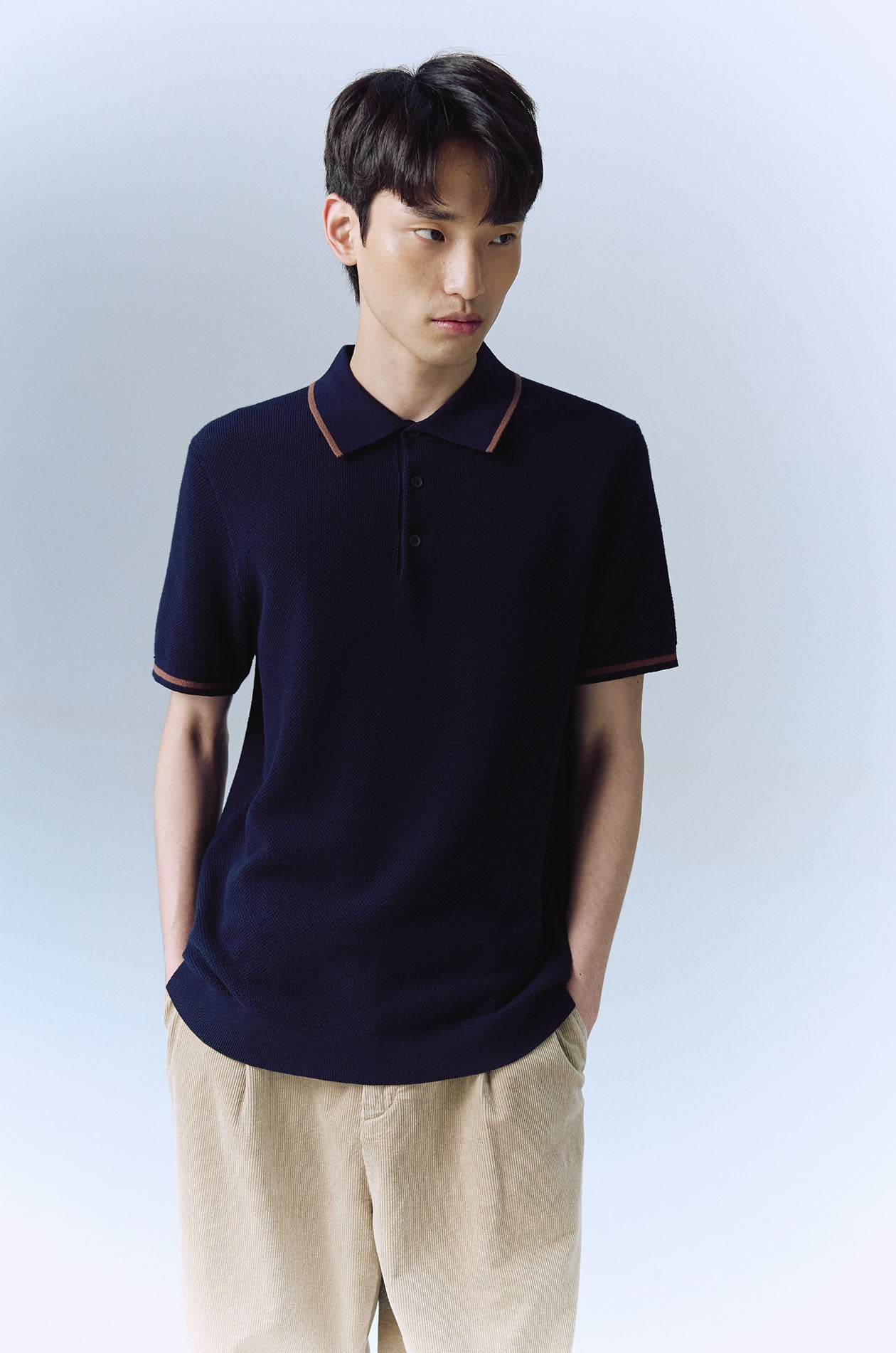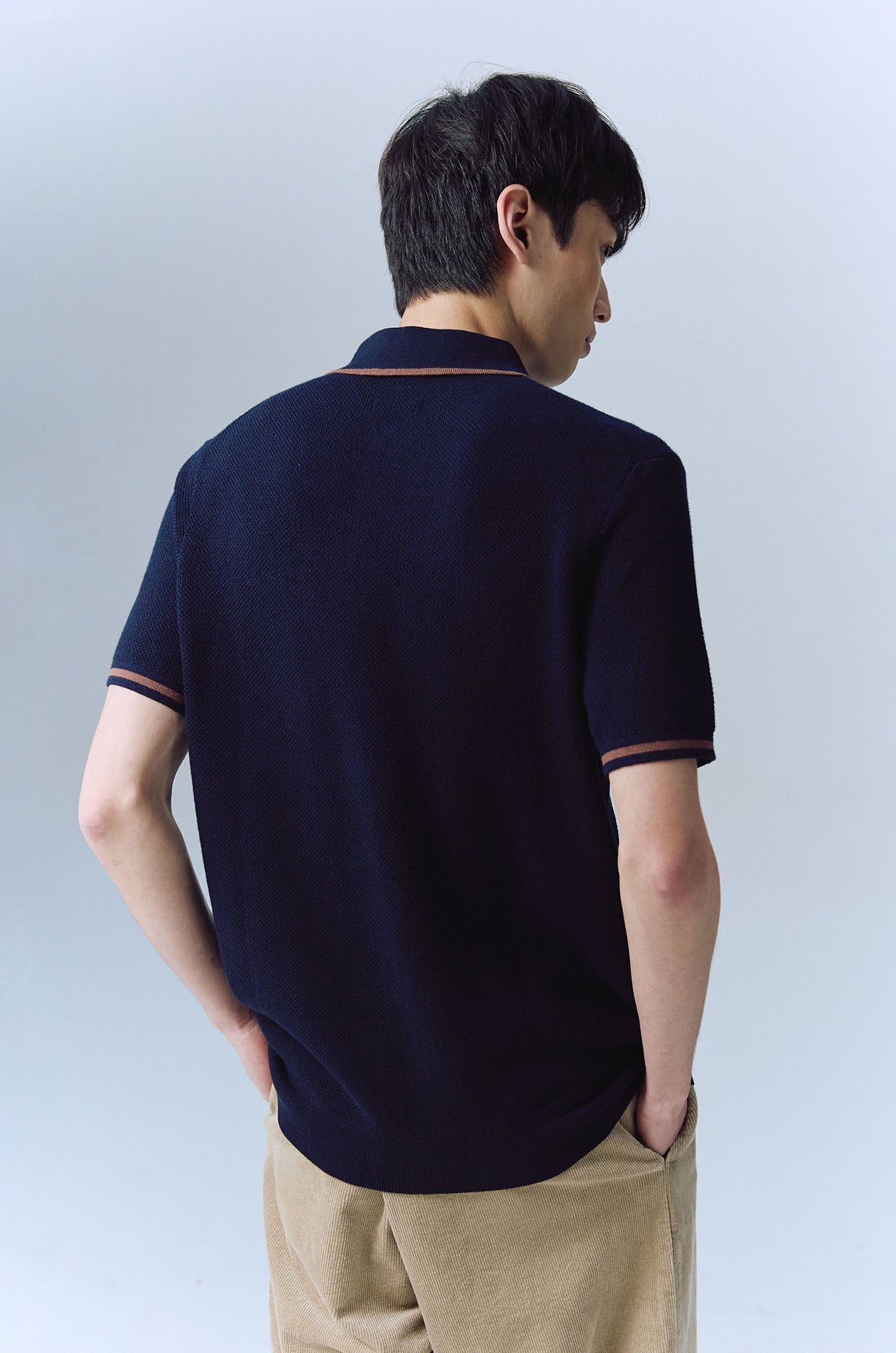 Short-sleeved polo shirt in knitted cotton. Regular fit with solid collar and striped sleeves. Front button closure. Front button closure. Available in navy.