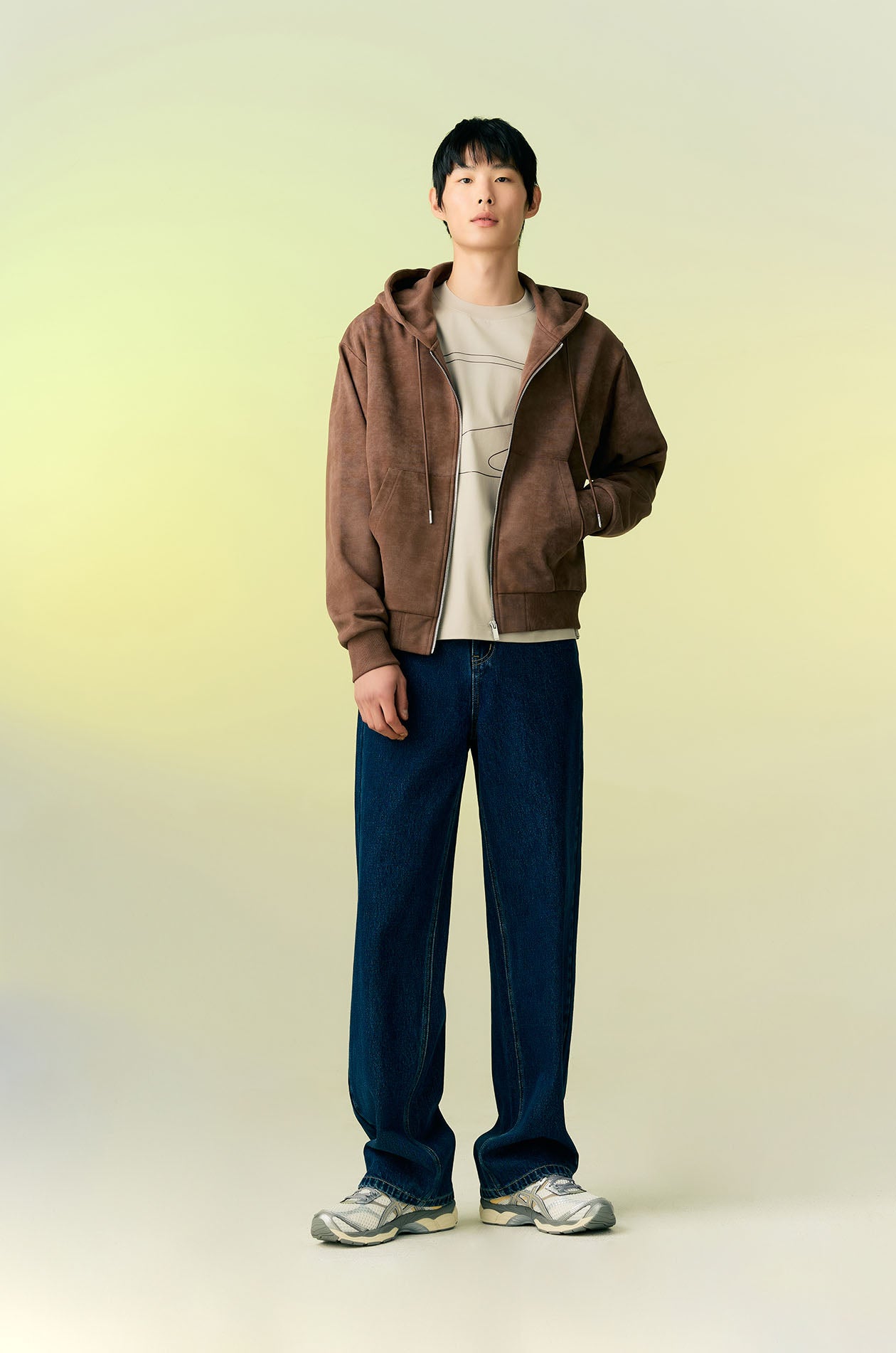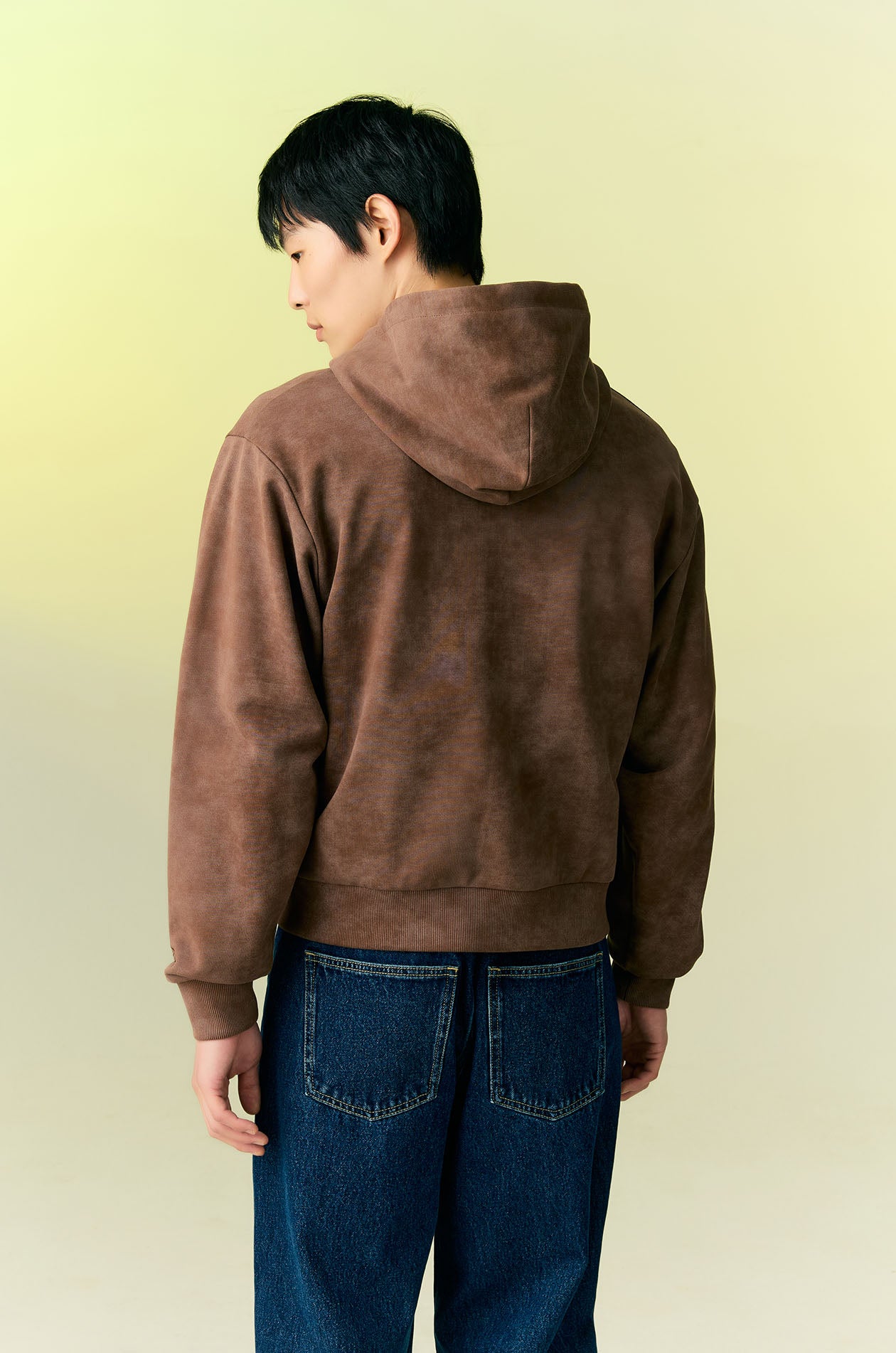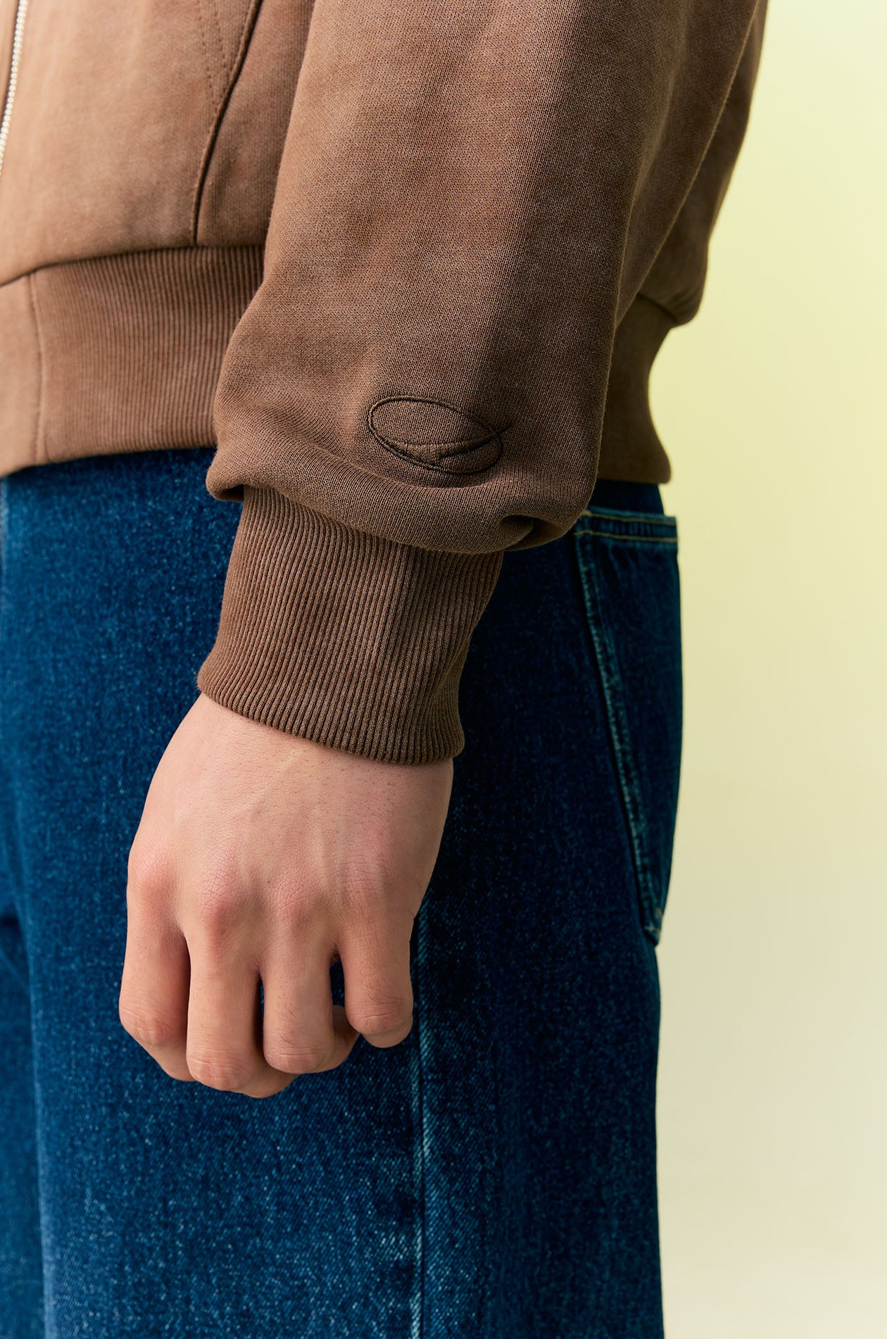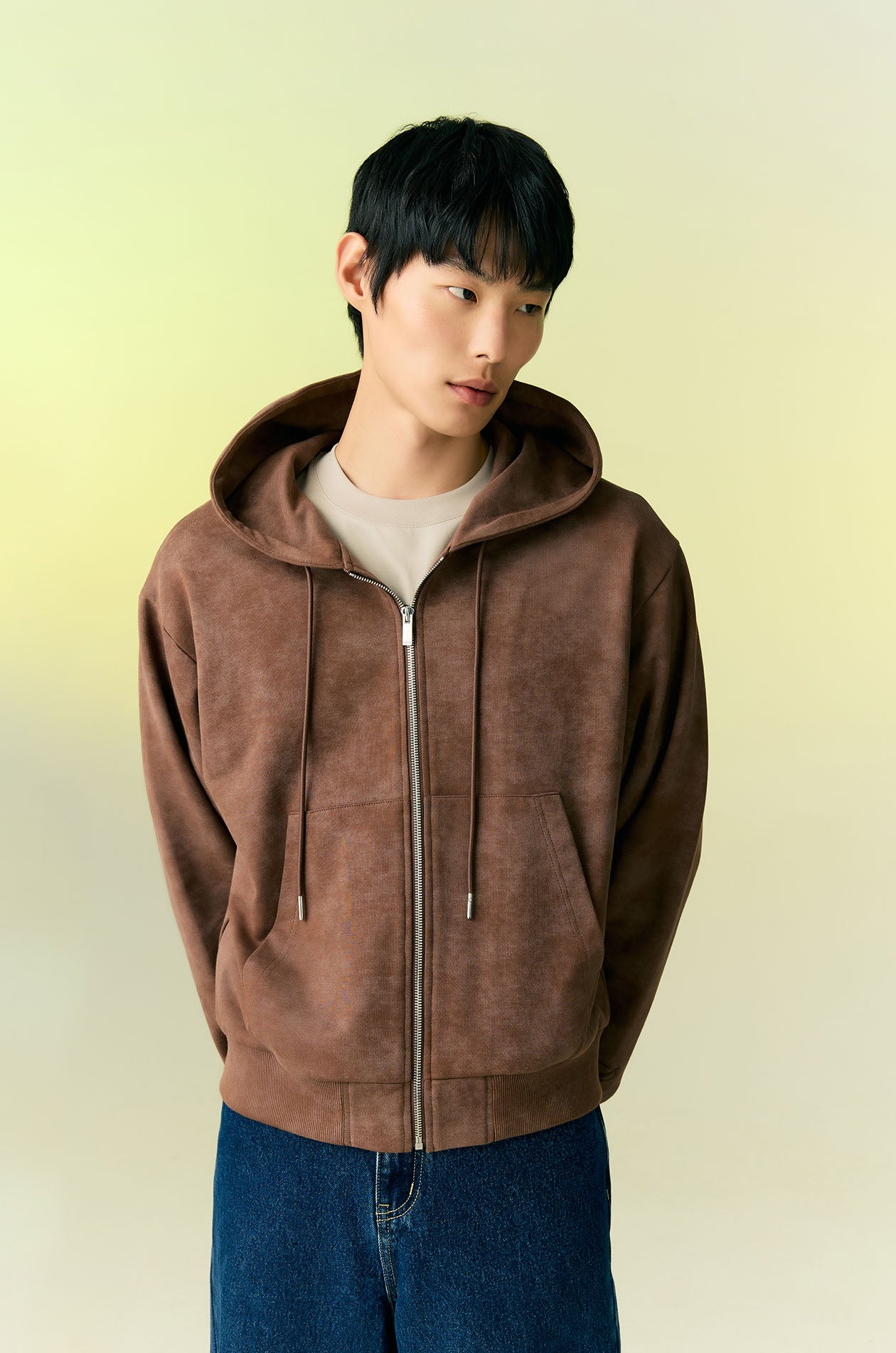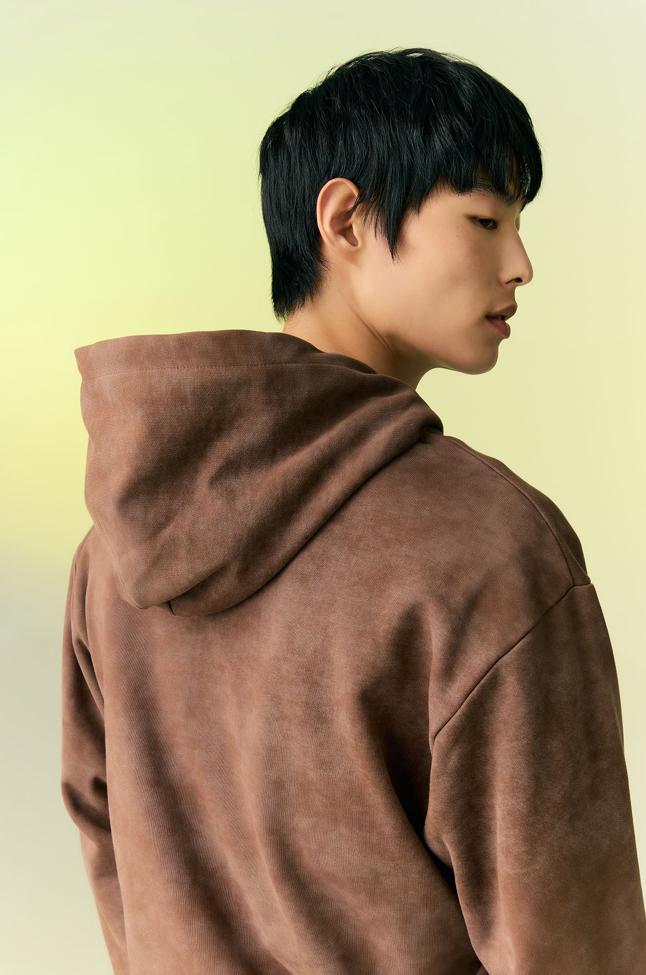 Hoodie in cotton French terry. Faded effect. Relax fit with drawstring hood, kangaroo pocket, and elastic cuffs. Front zip closure. Available in brown.