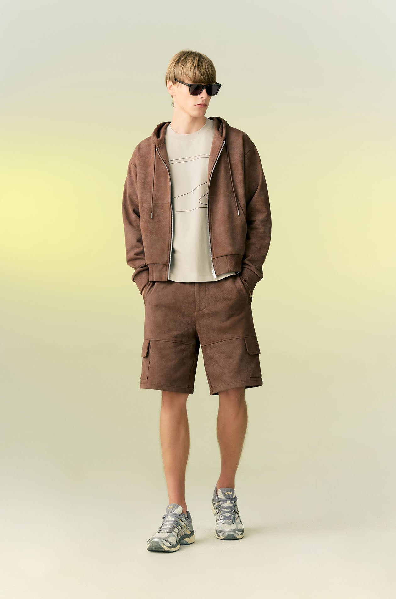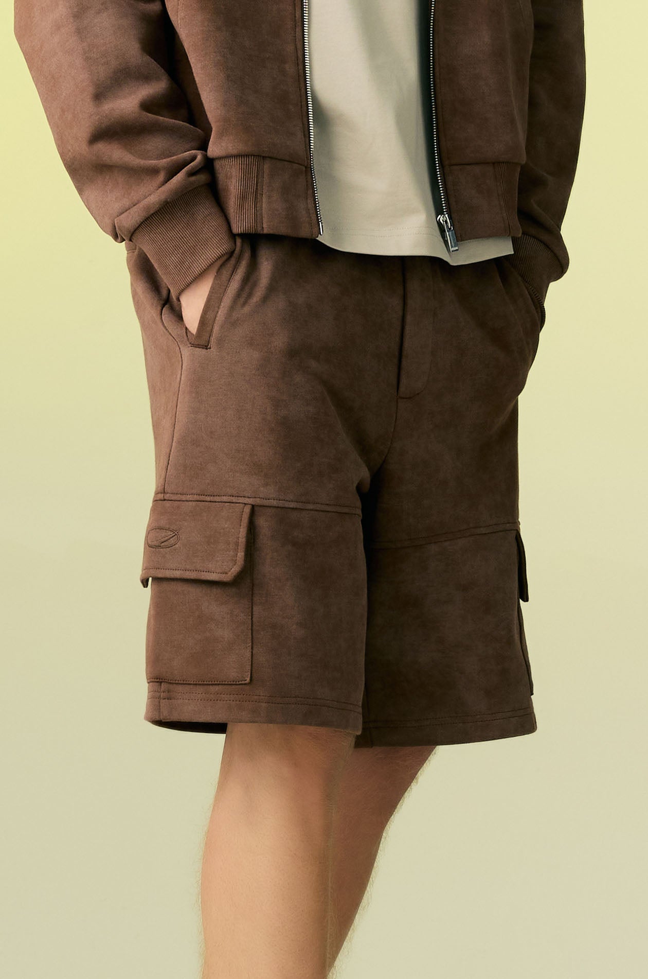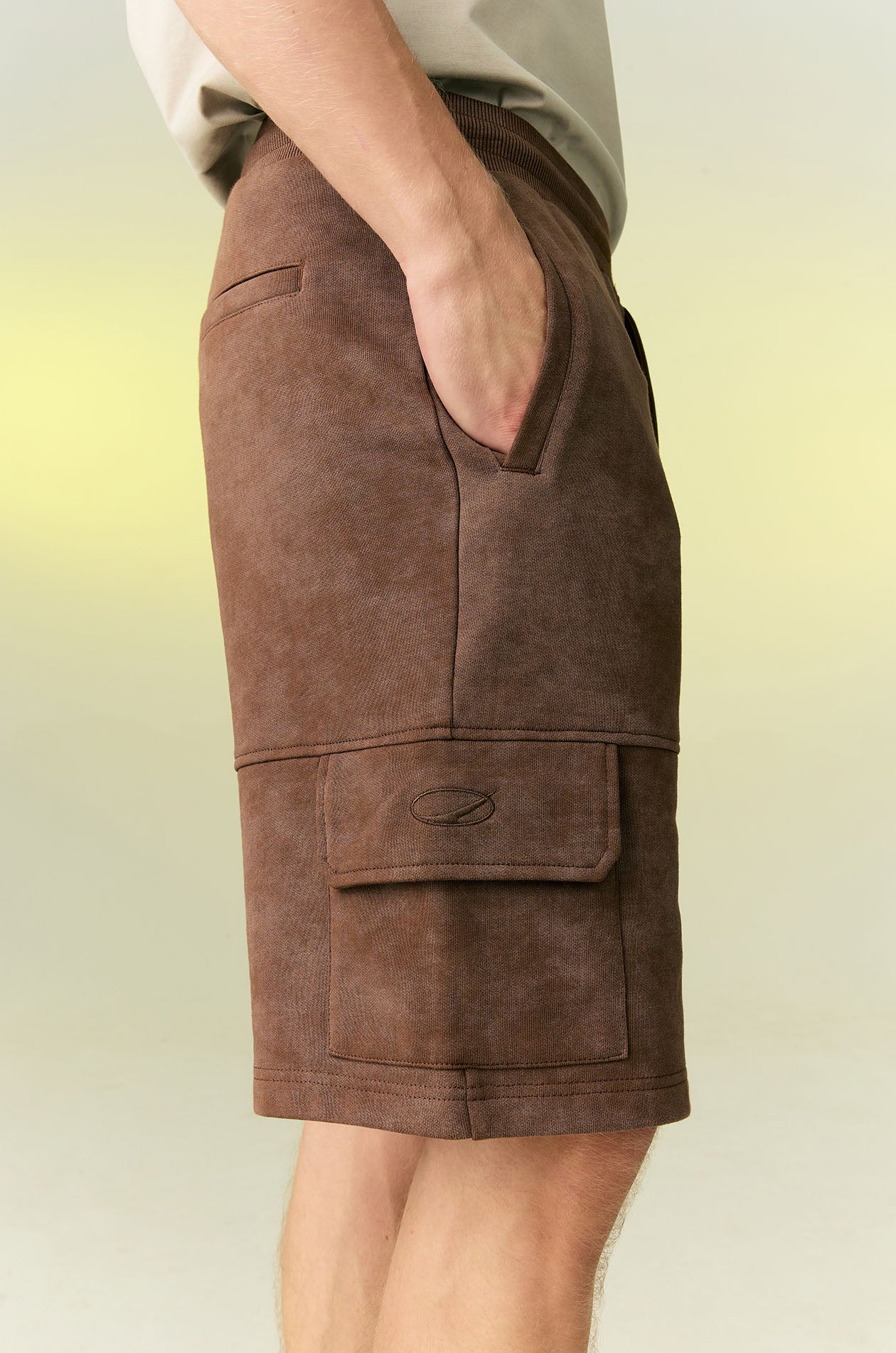 Mid-rise sweatshorts in cotton French terry. Faded effect. Knee length with side and back pockets. Small cargo pockets with sporty logo. Elastic drawstring waistband. Front zip closure. Available in brown and dark grey.
