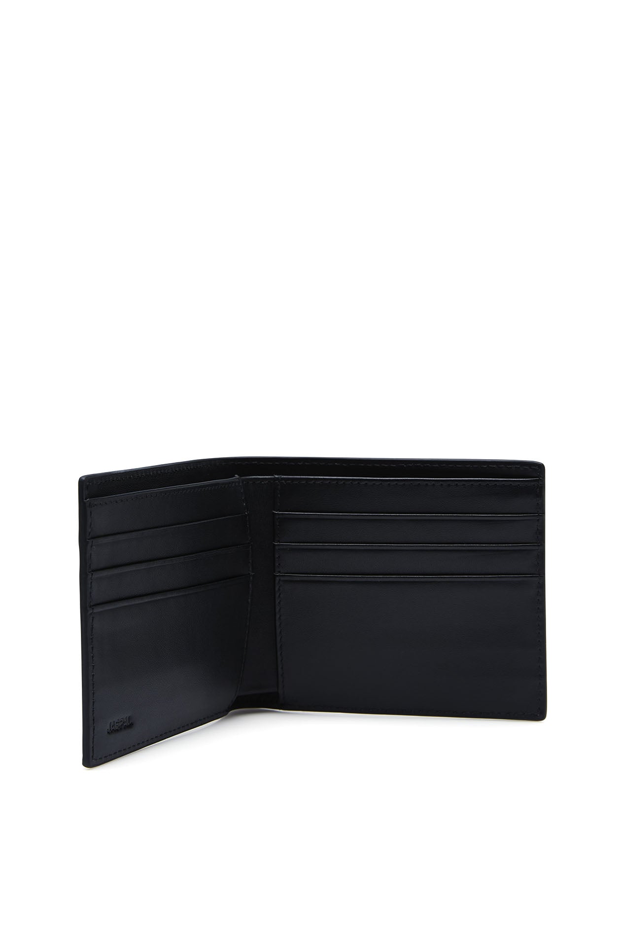 Bifold wallet in cow leather with embossed JJ-monogram motif. One main compartment and card slots. Available in black.