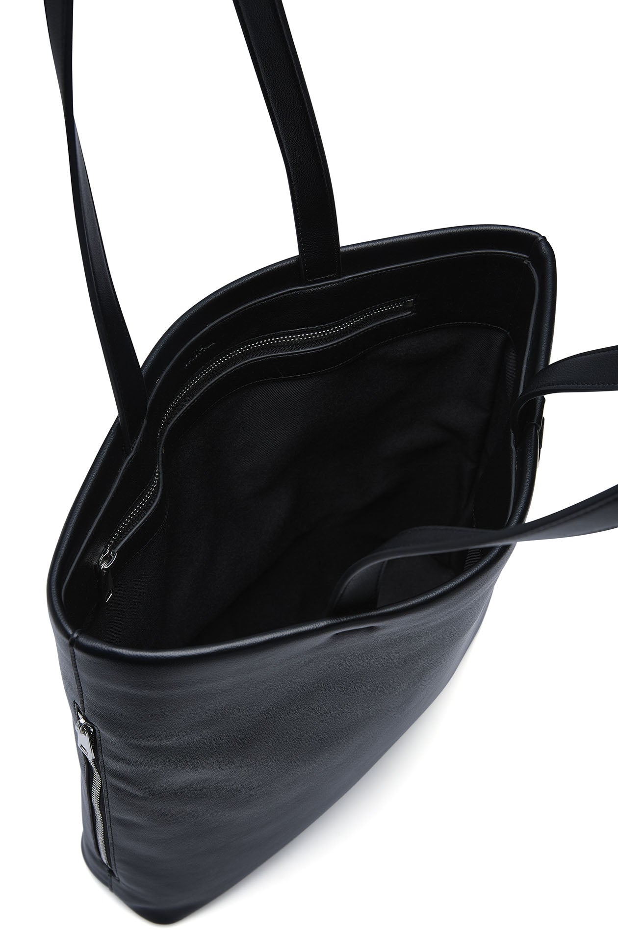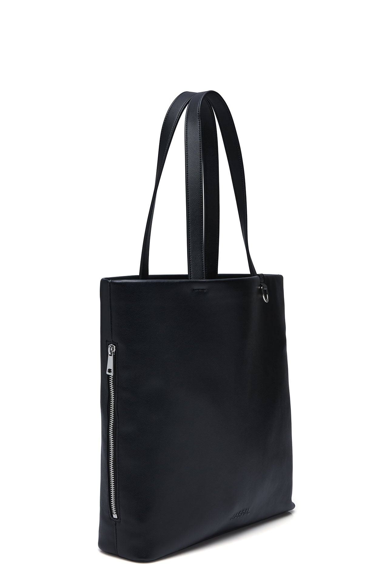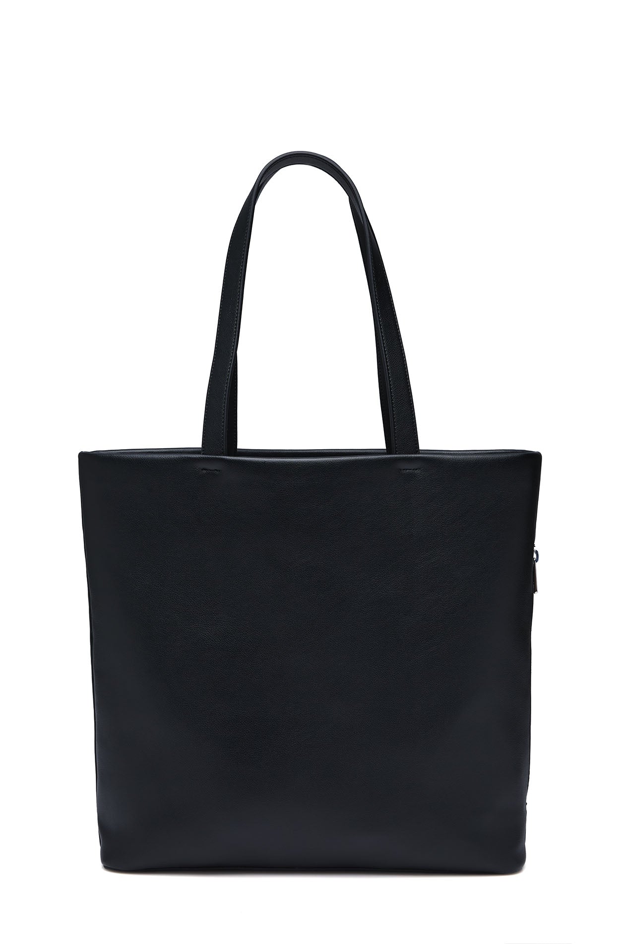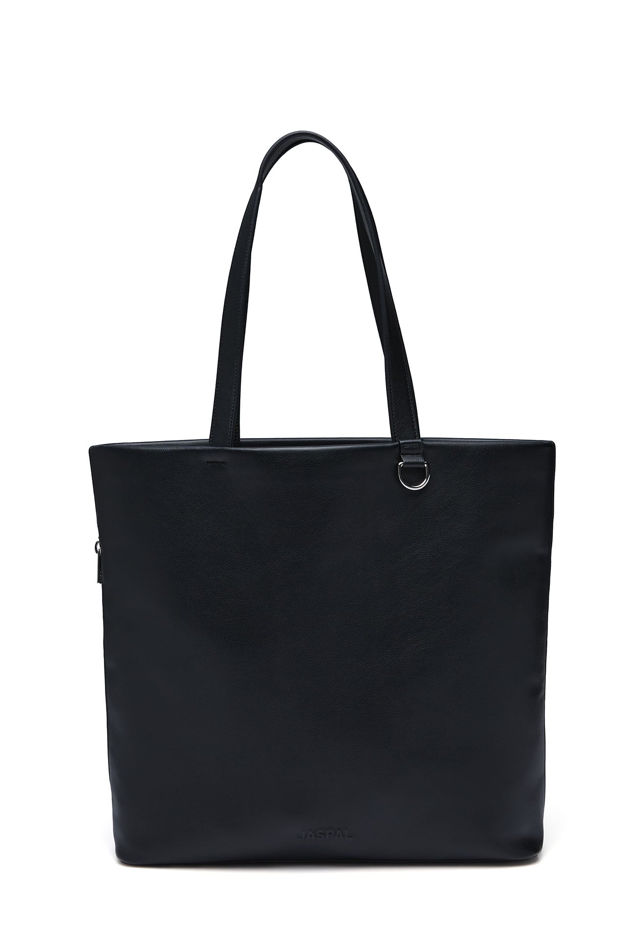 Tote bag in faux leather. One main compartment, non-adjustable top handles, and a D-ring for a keychain. Available in black.
