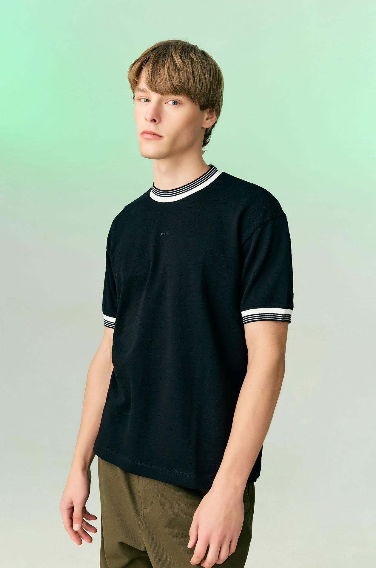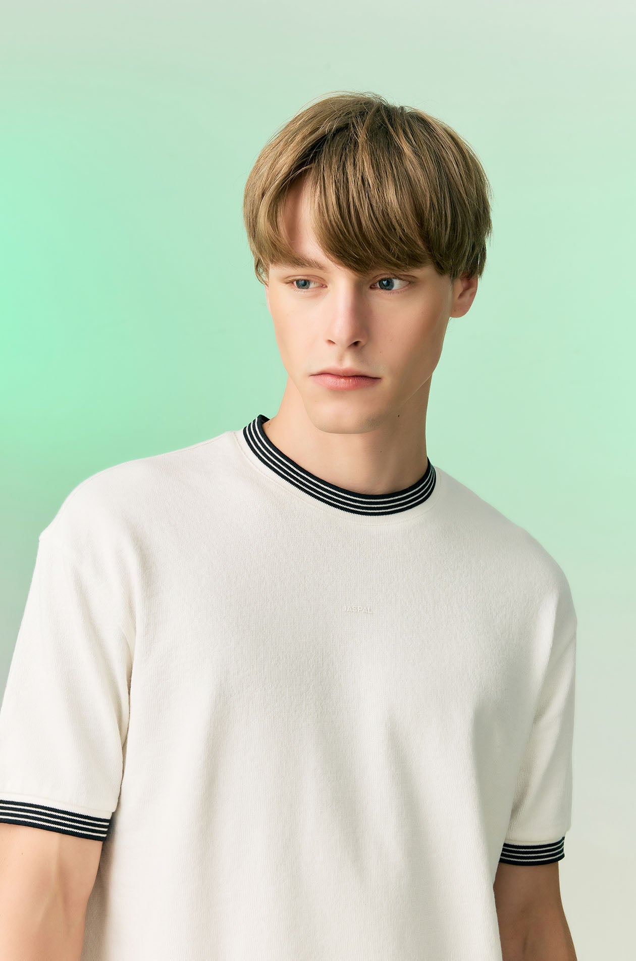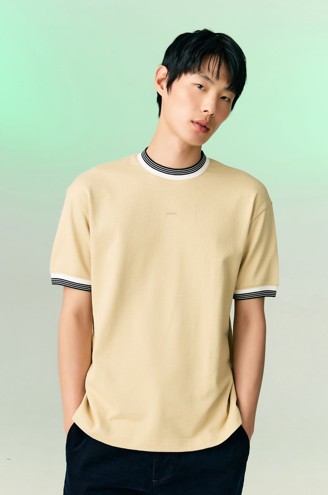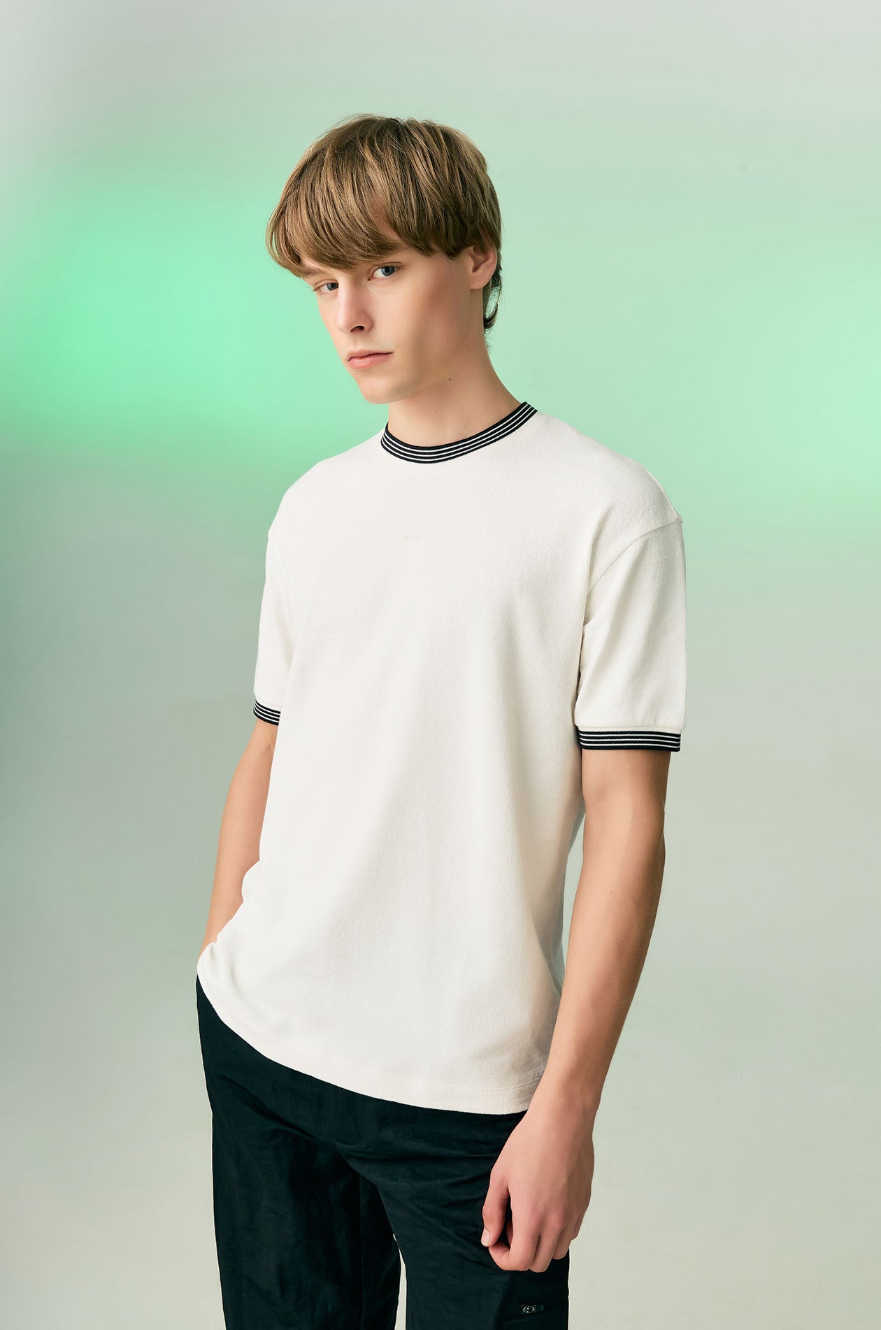 Short-sleeved T-shirt in 100% cotton. Relaxed fit with round neck and minimal lettering logo at the front. Two tone trimmed edges. Available in black, white, and light brown.