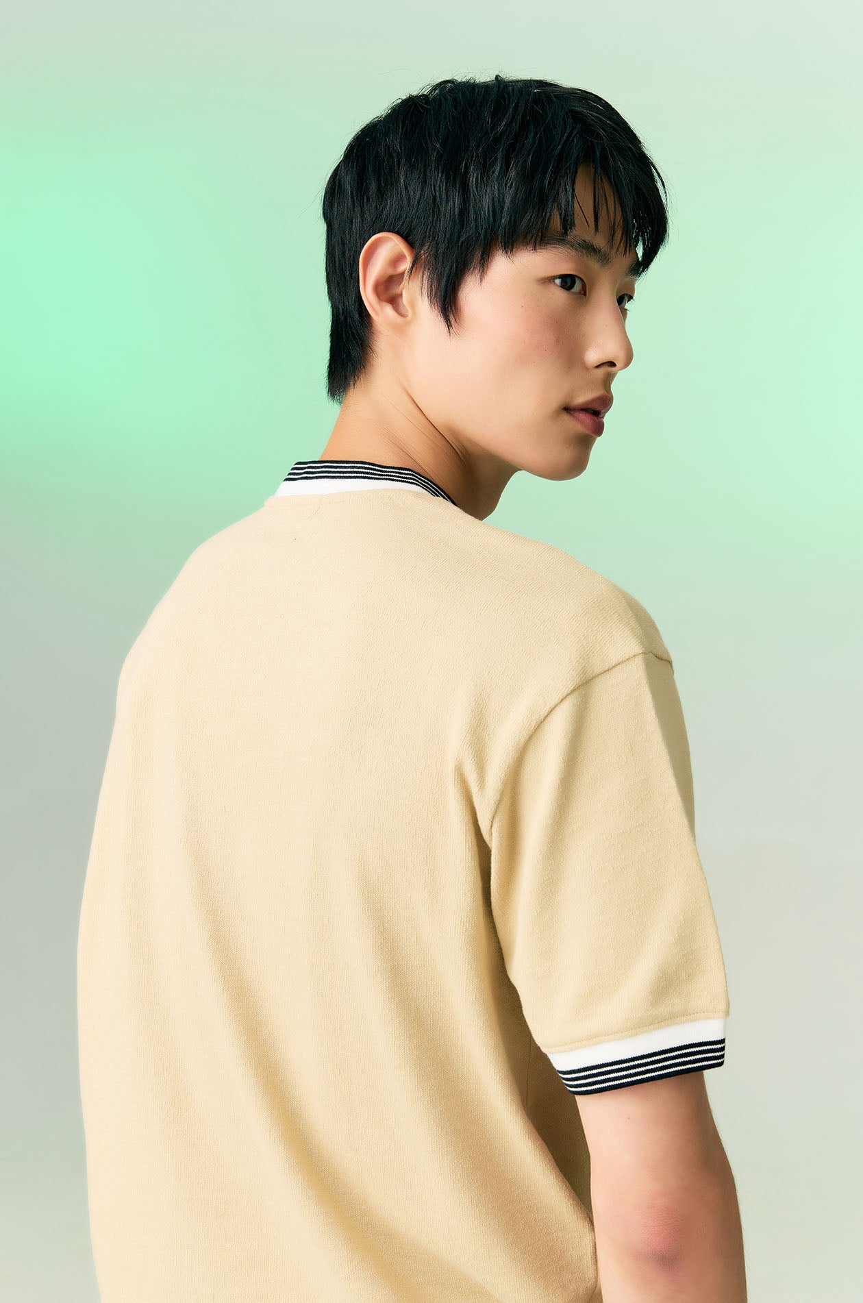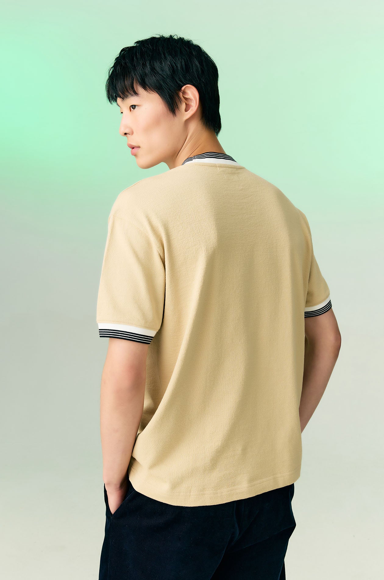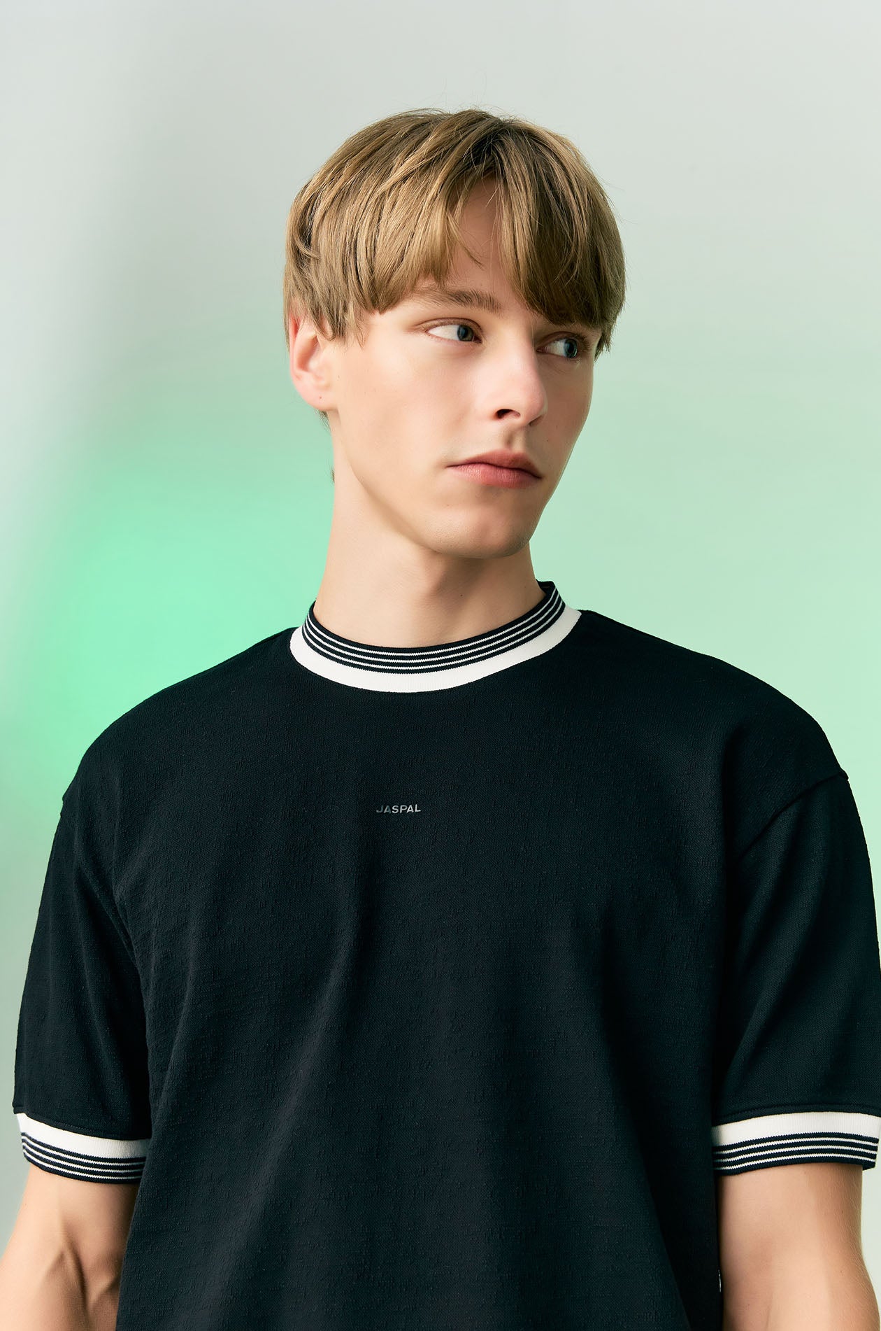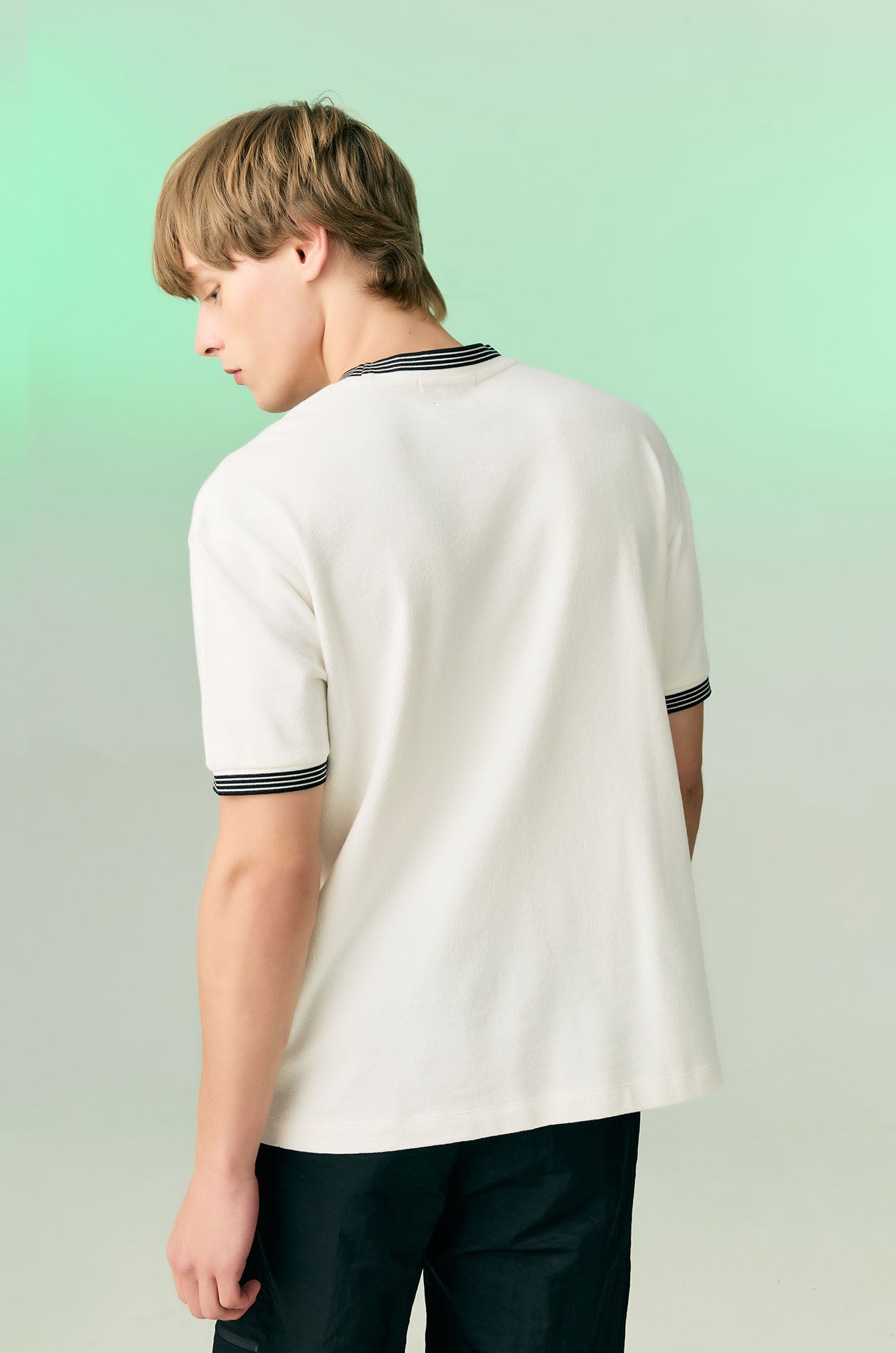 Short-sleeved T-shirt in 100% cotton. Relaxed fit with round neck and minimal lettering logo at the front. Two tone trimmed edges. Available in black, white, and light brown.