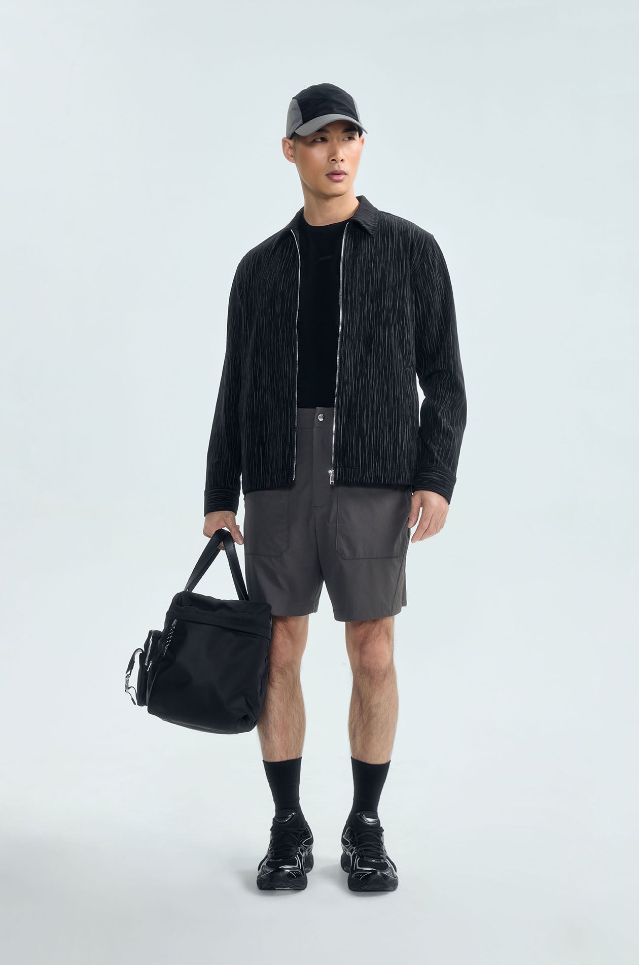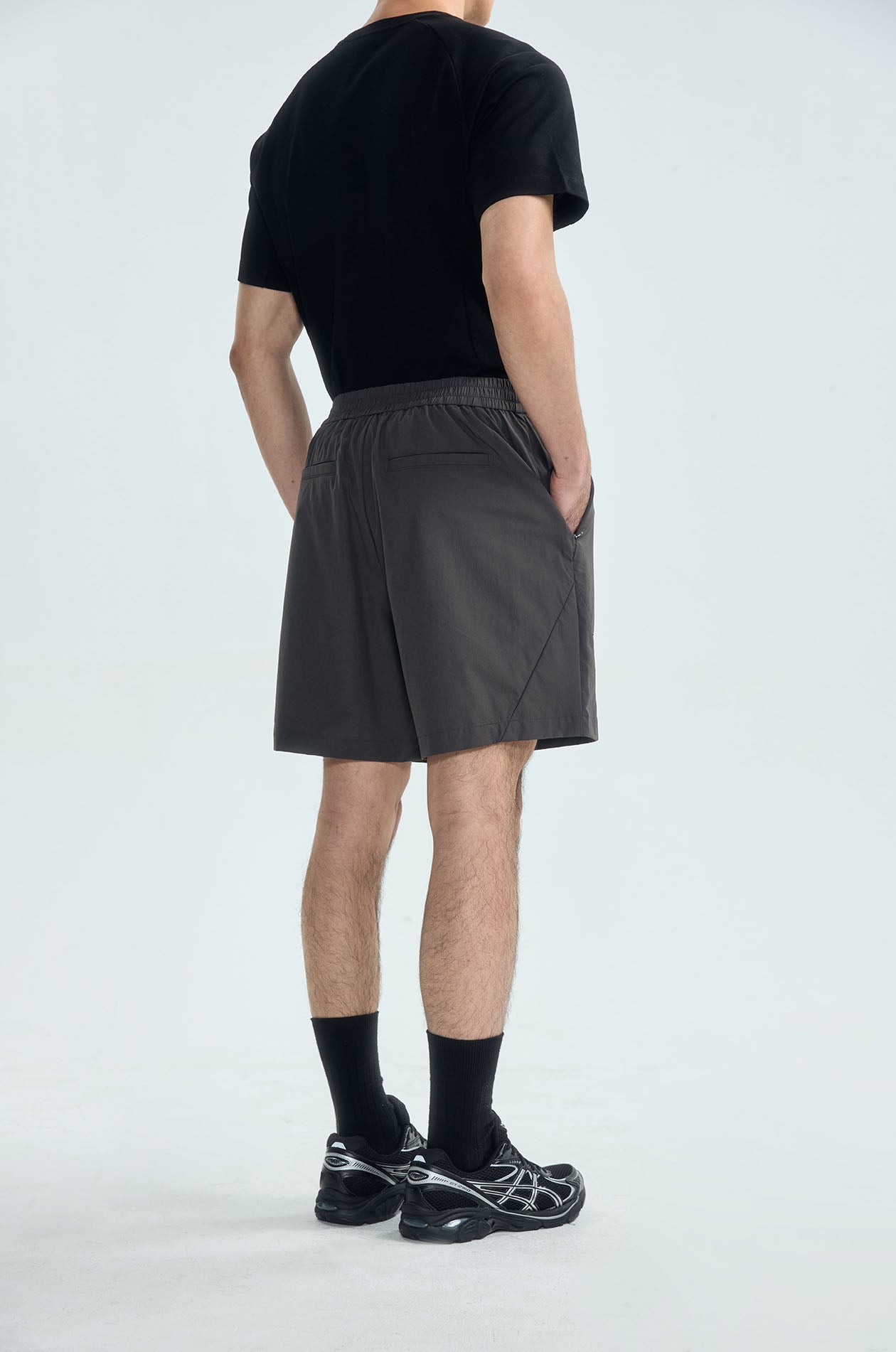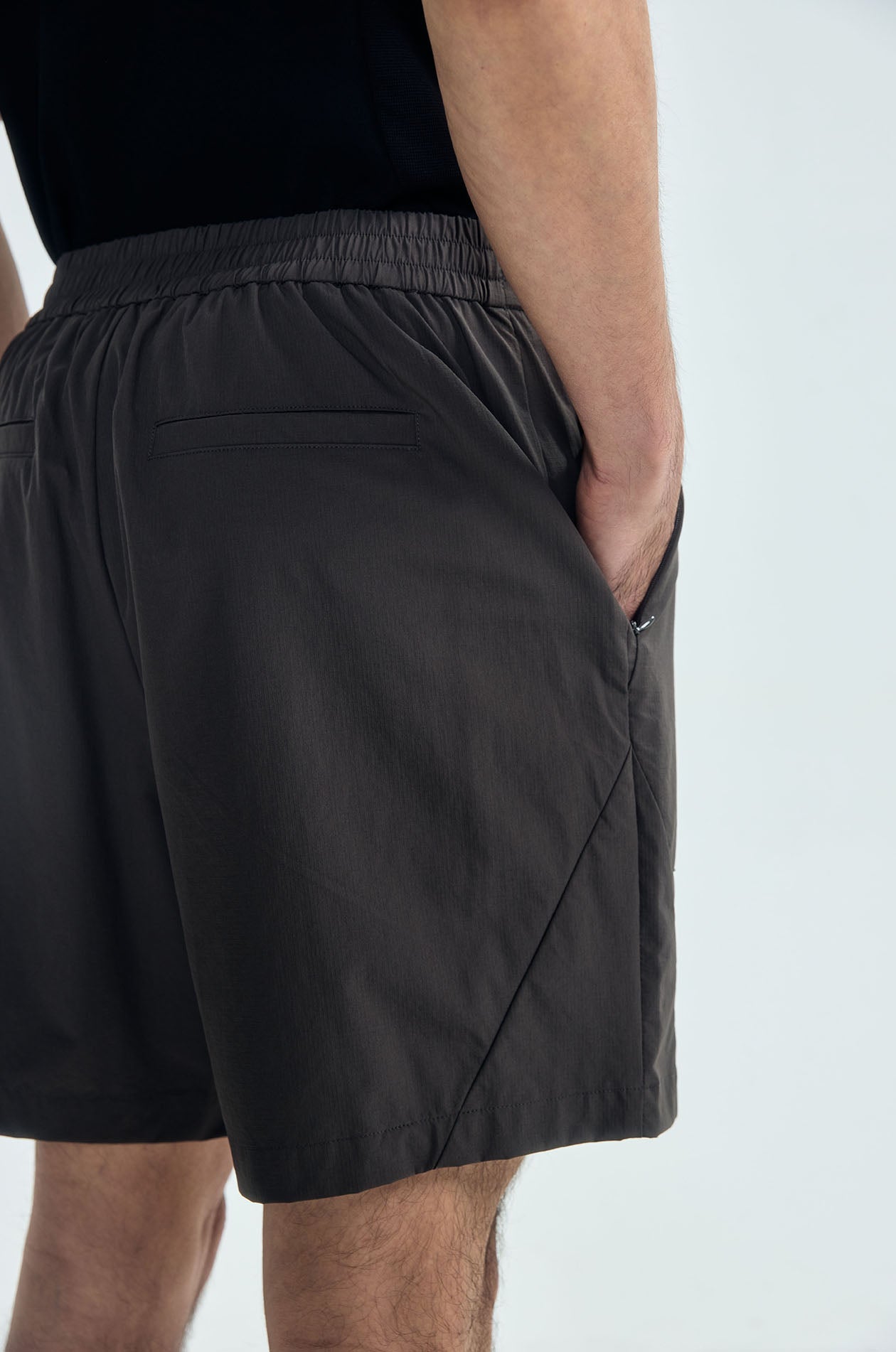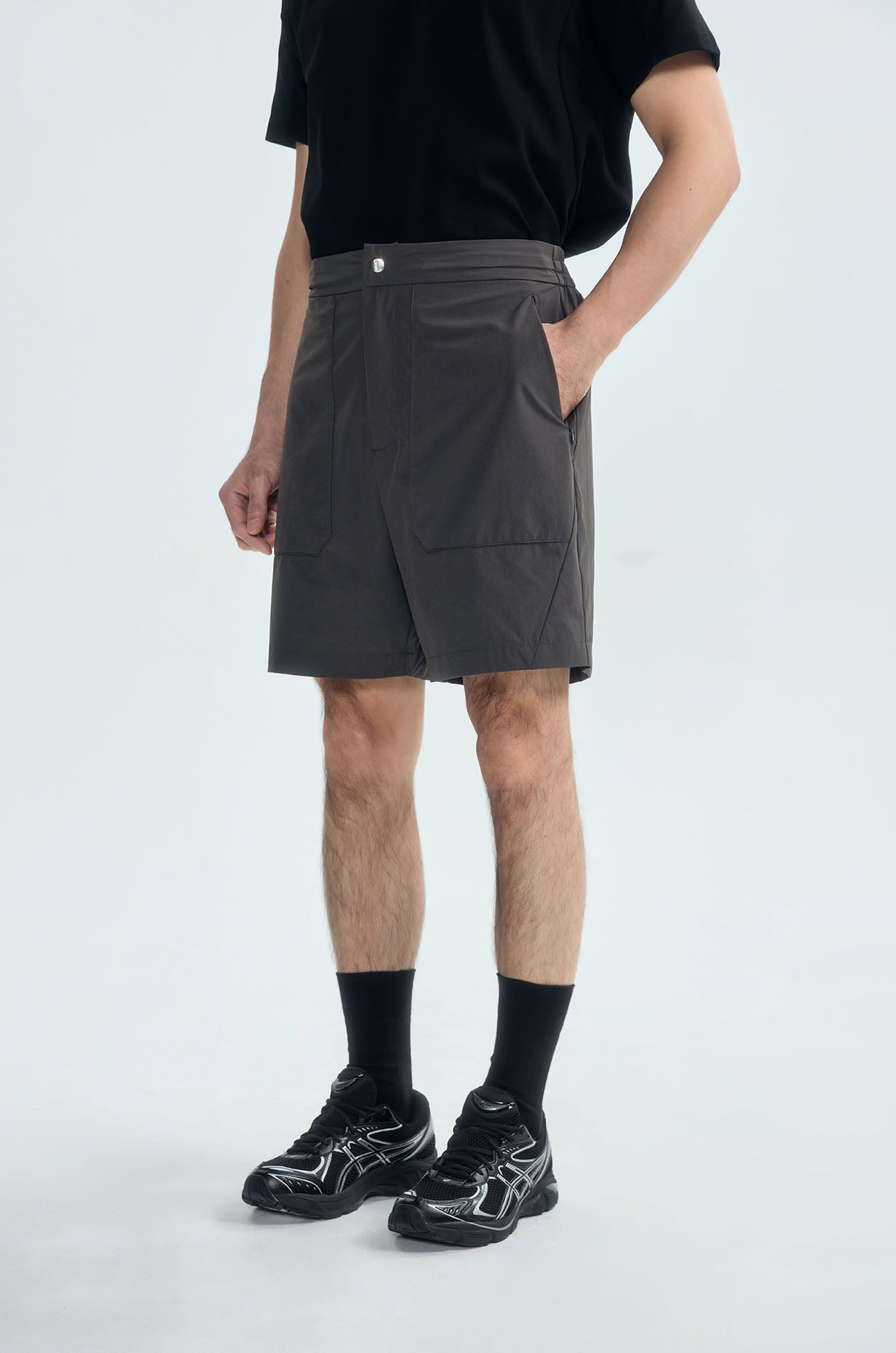 Mid-rise track shorts in stretch ripstop. Above-knee length with side zip pockets and back pockets. Front button and zip closure. Available in light brown and dark grey.