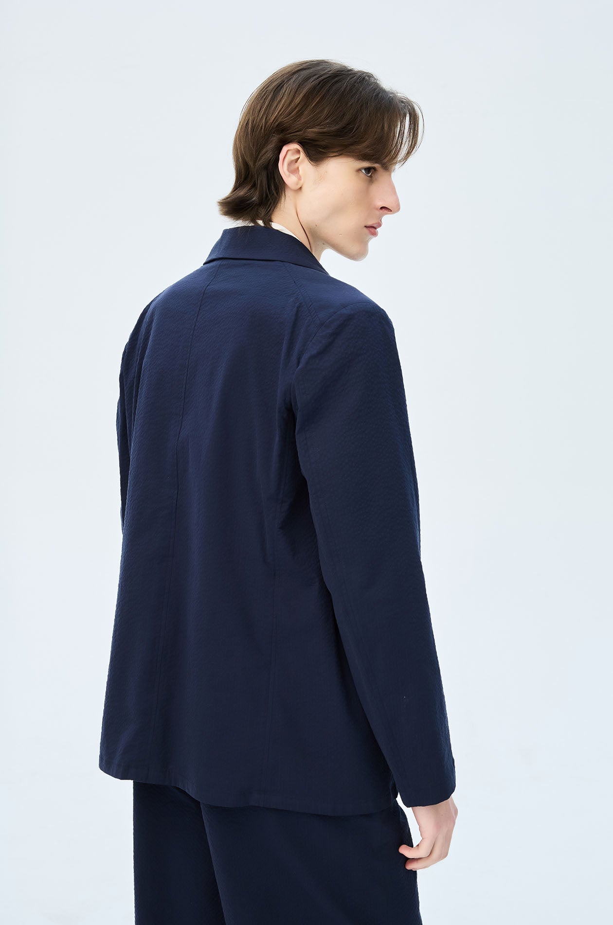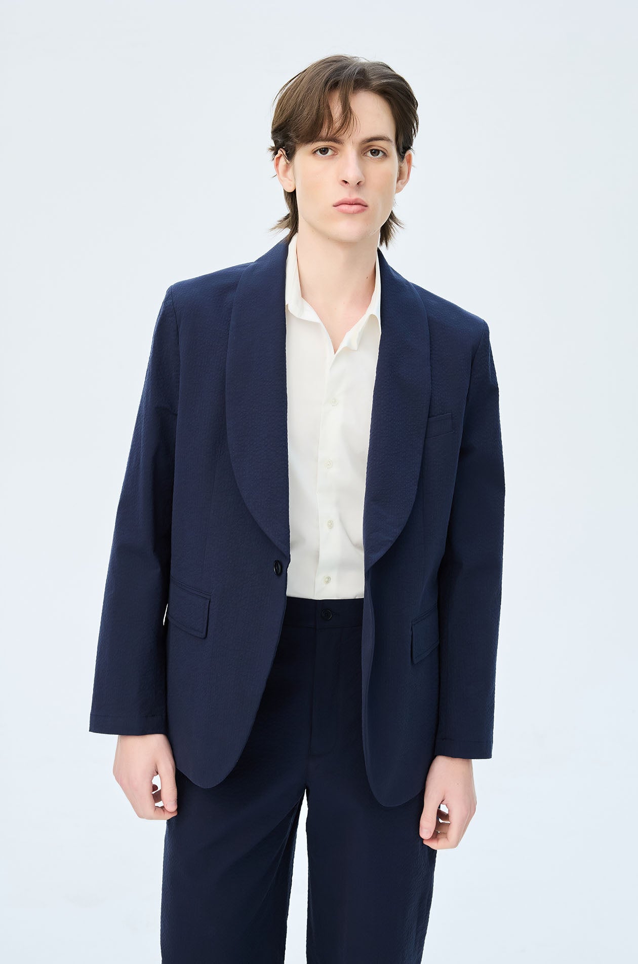 Single-breasted lightweight blazer in seersucker. Regular fit with shawl lapel and front pockets. Front button closure. Available in navy.