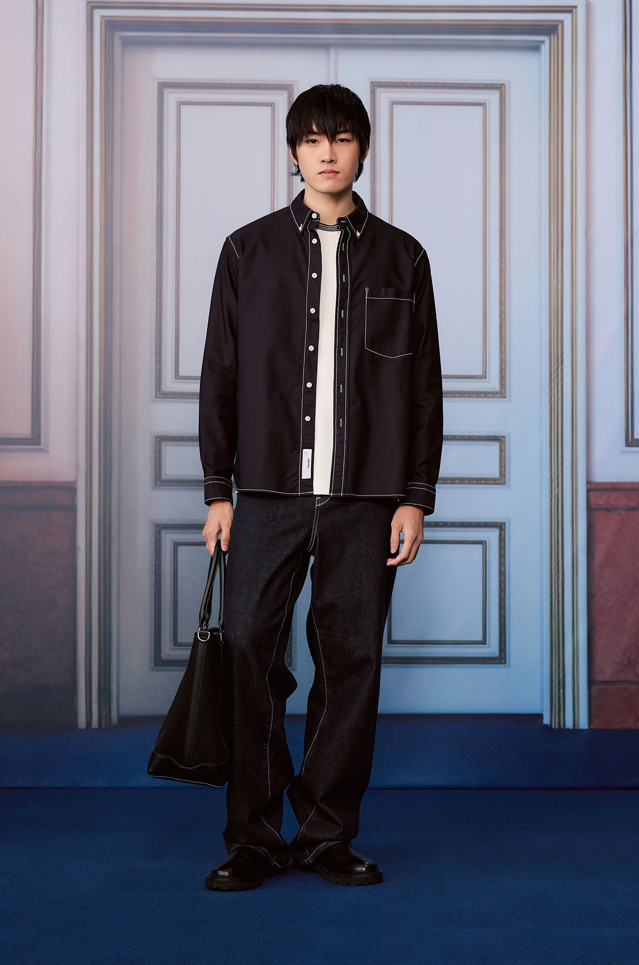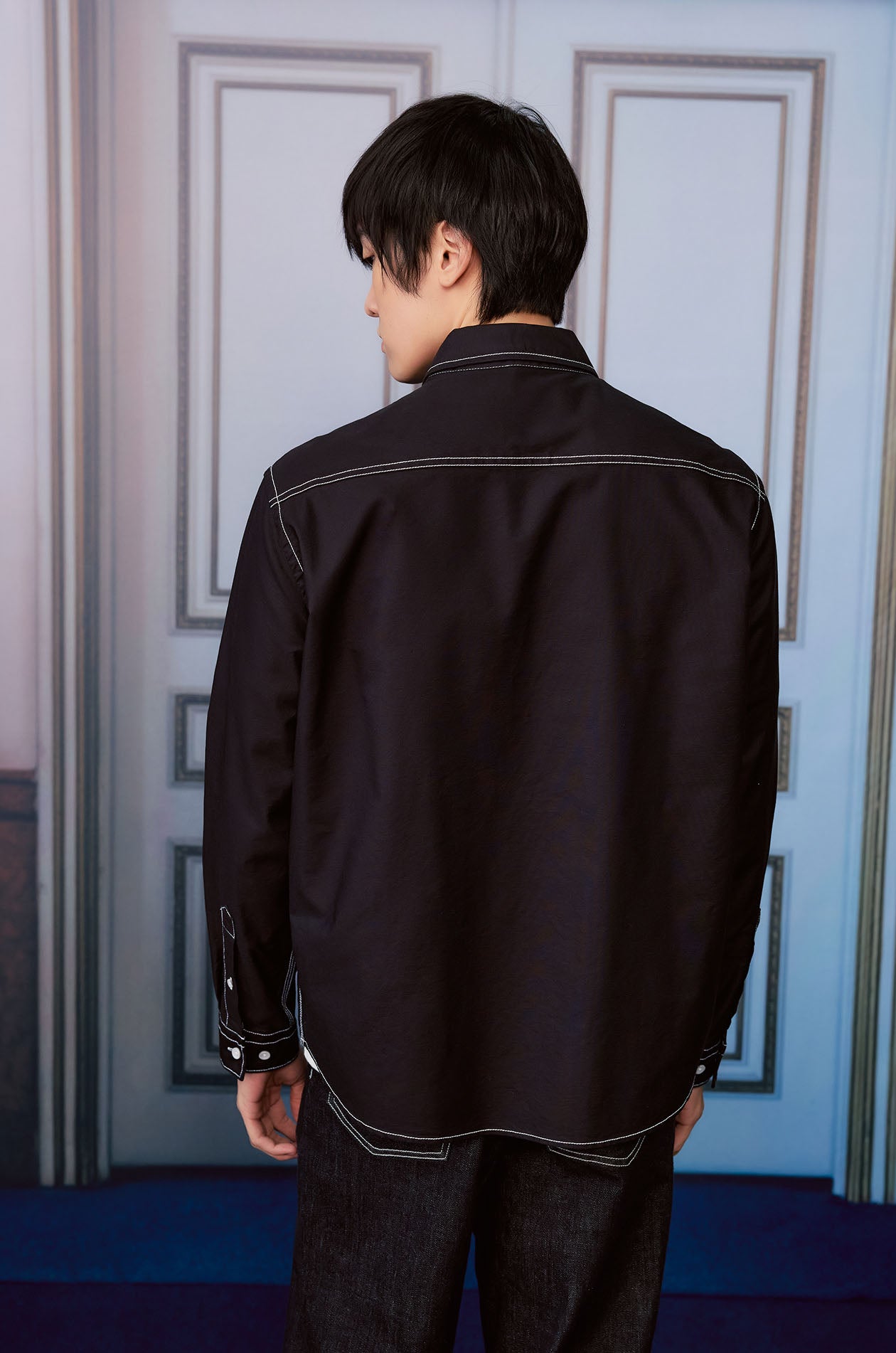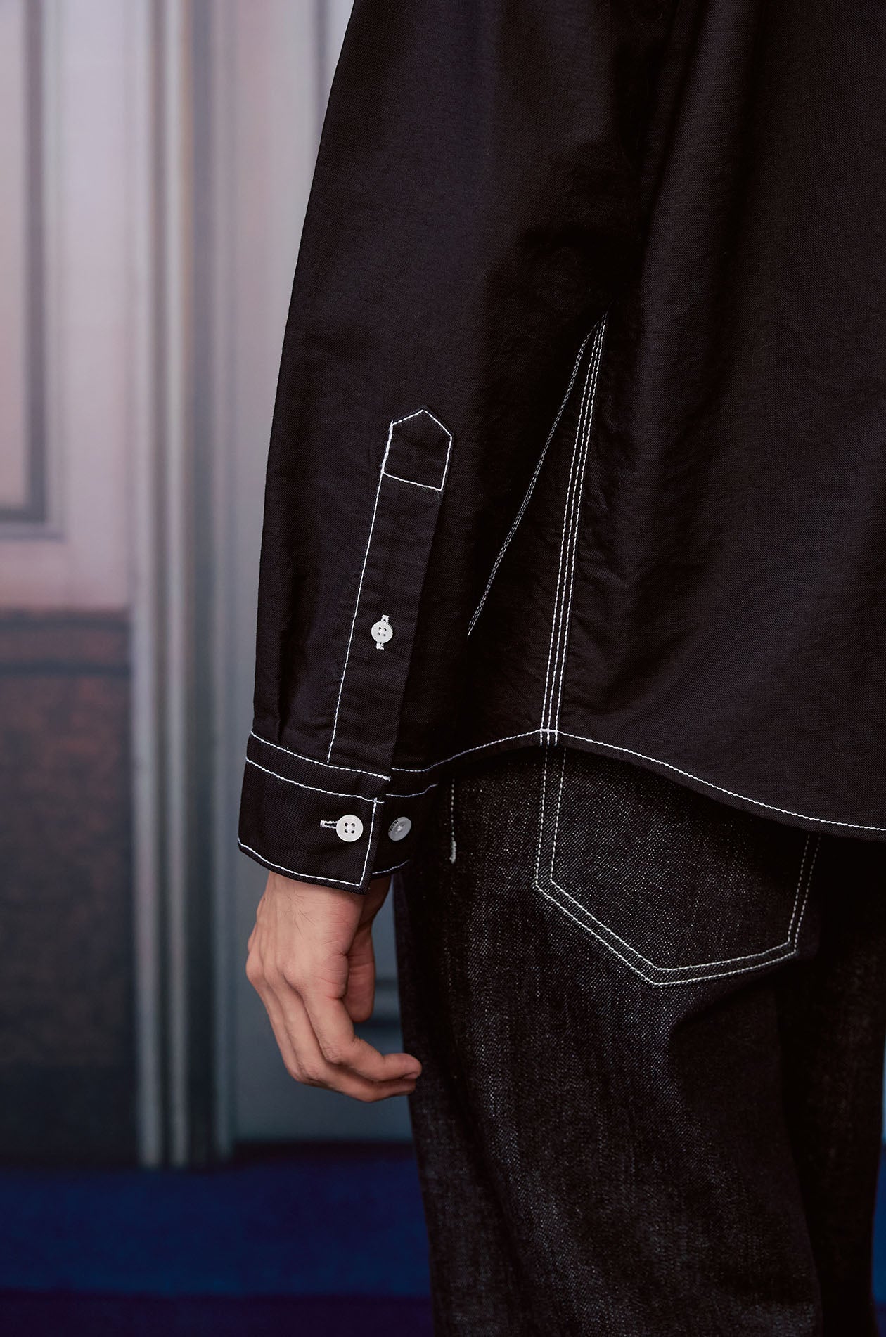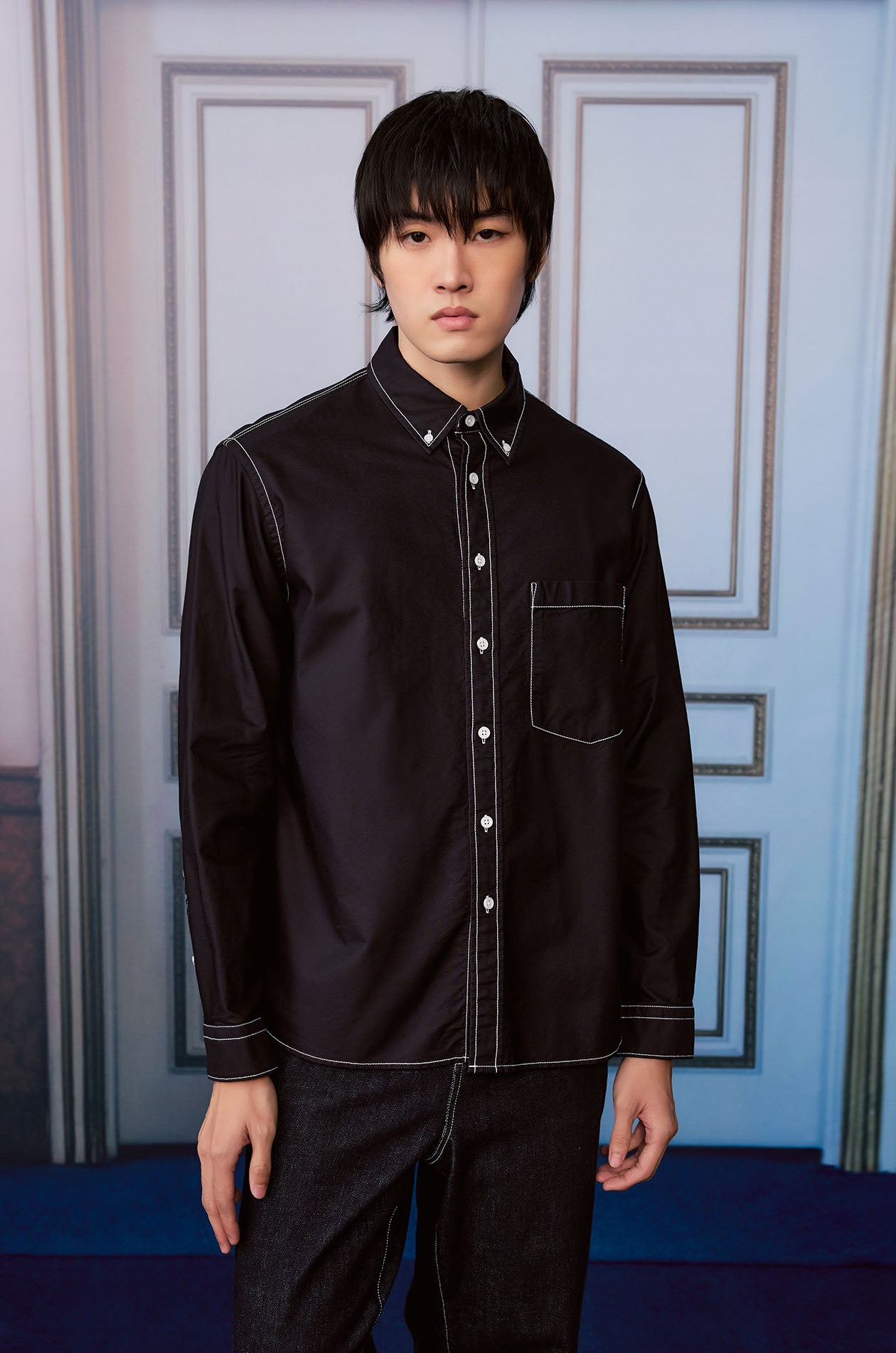 Long-sleeved shirt in cotton oxford. Relaxed fit with classic collar and contrast stitching detail. Front button closure. Available in black.