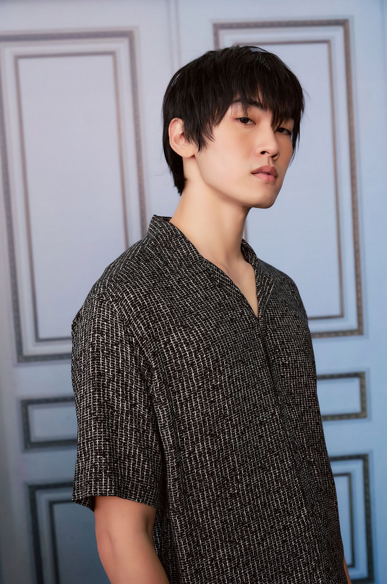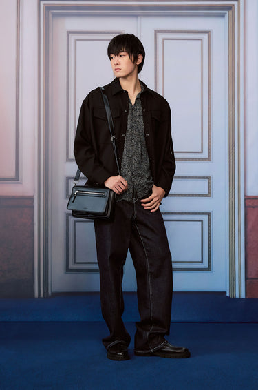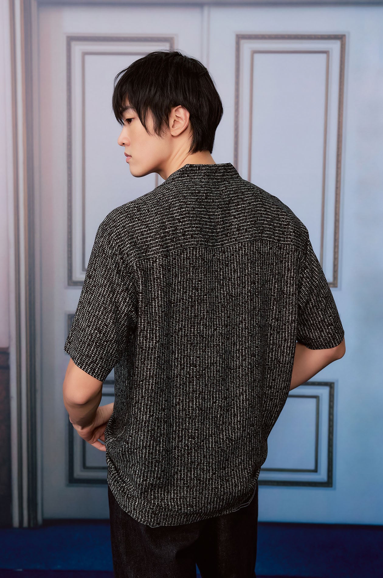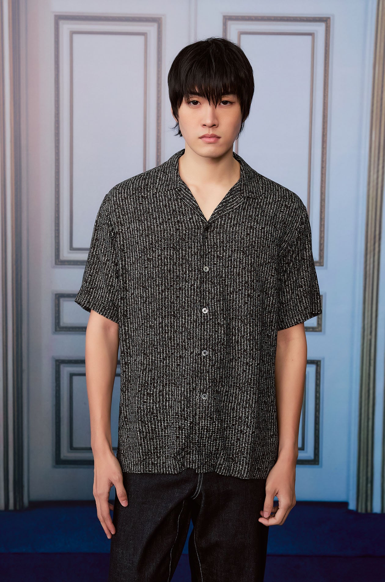 Short-sleeved resort shirt in 100% viscose. Allover abstract monochrome print. Regular fit with camp collar. Front button closure. Available in black.