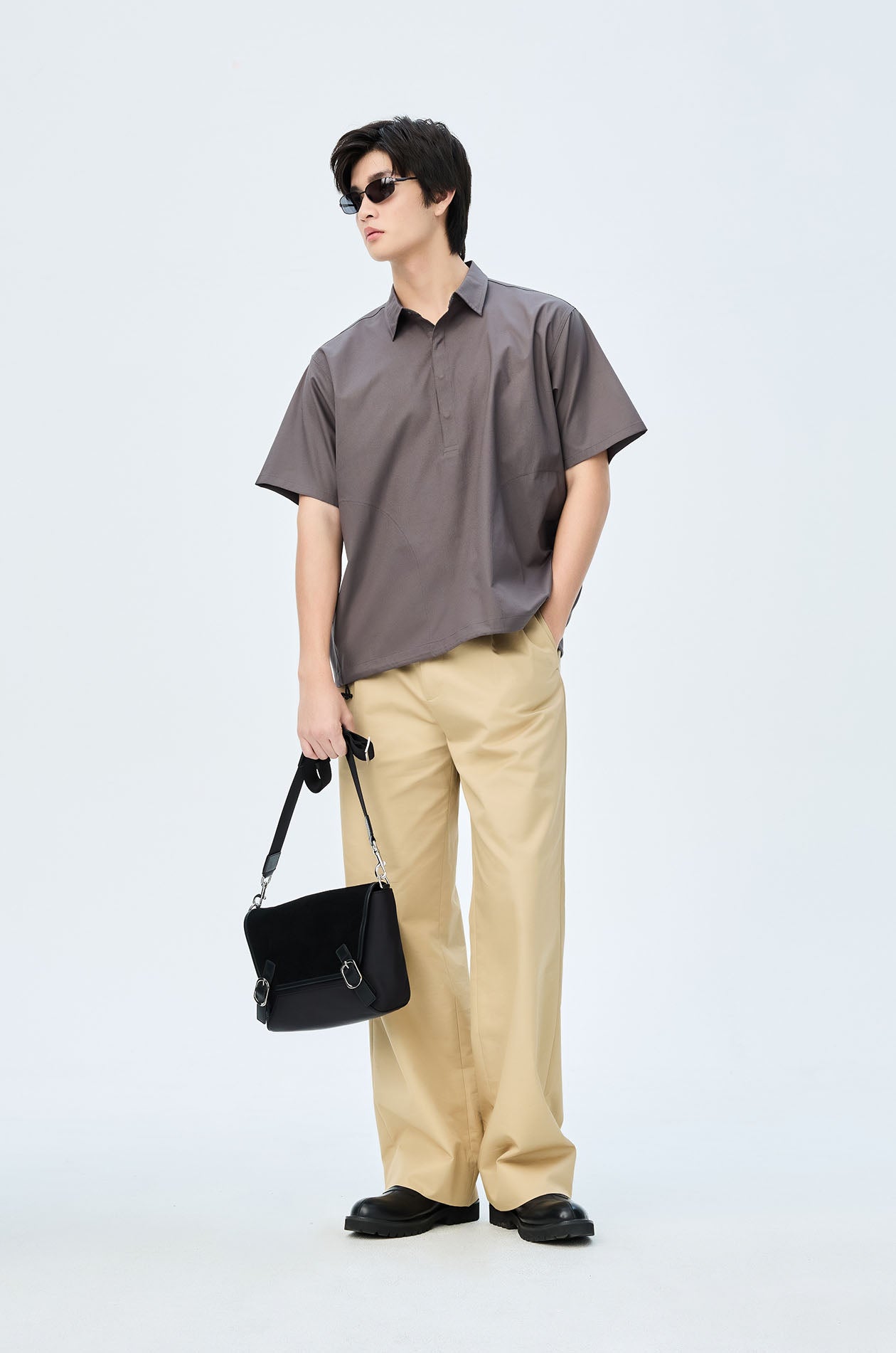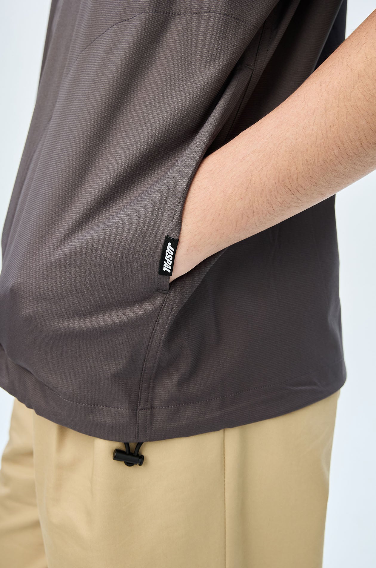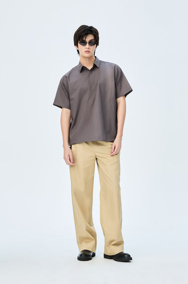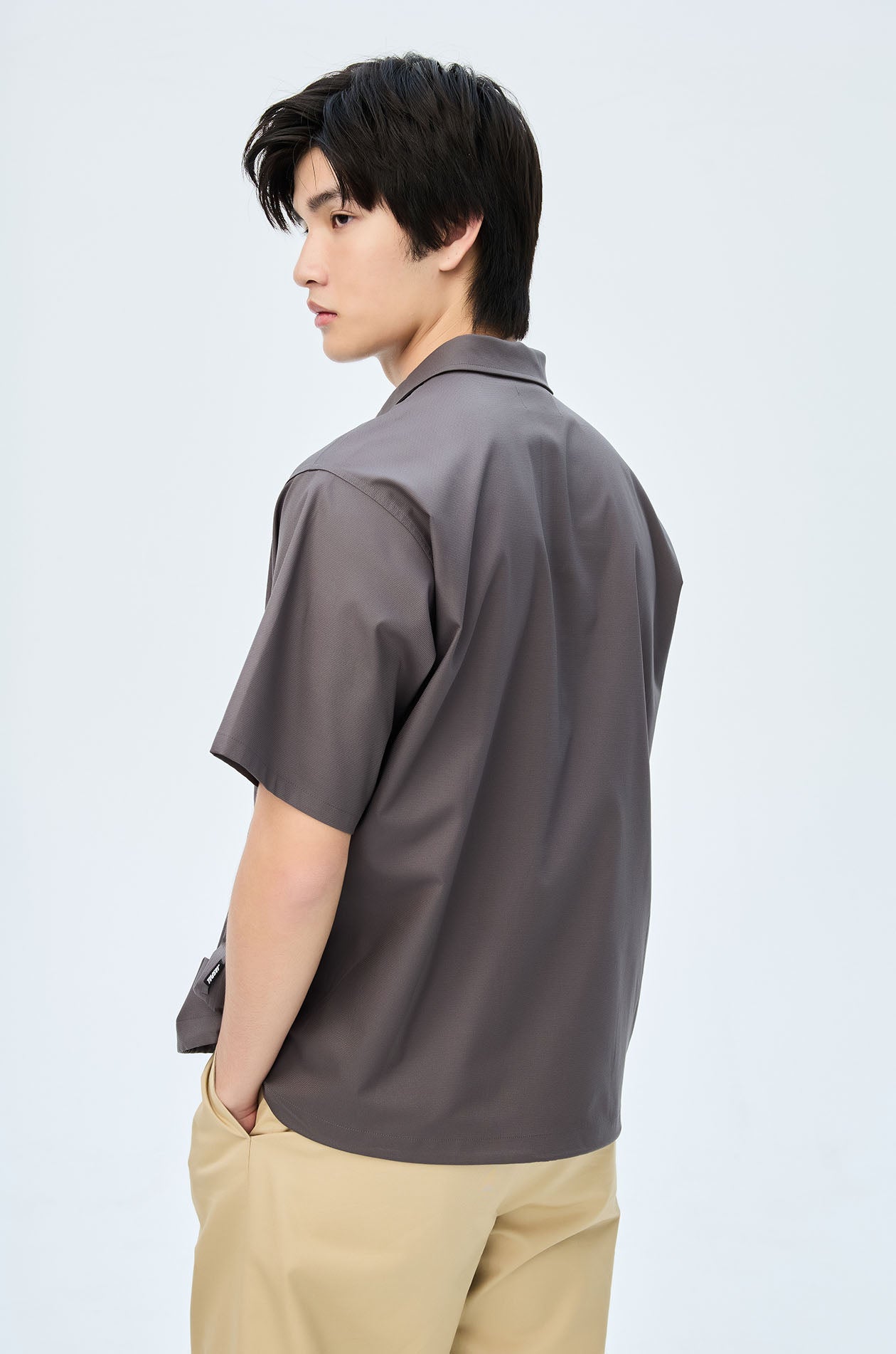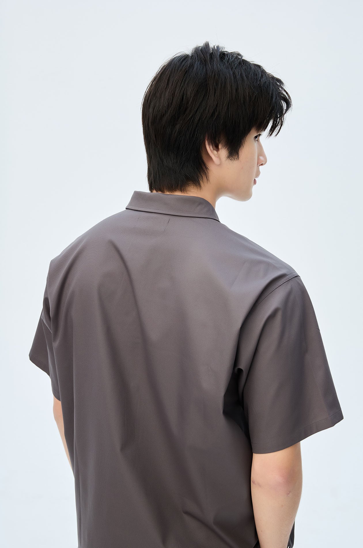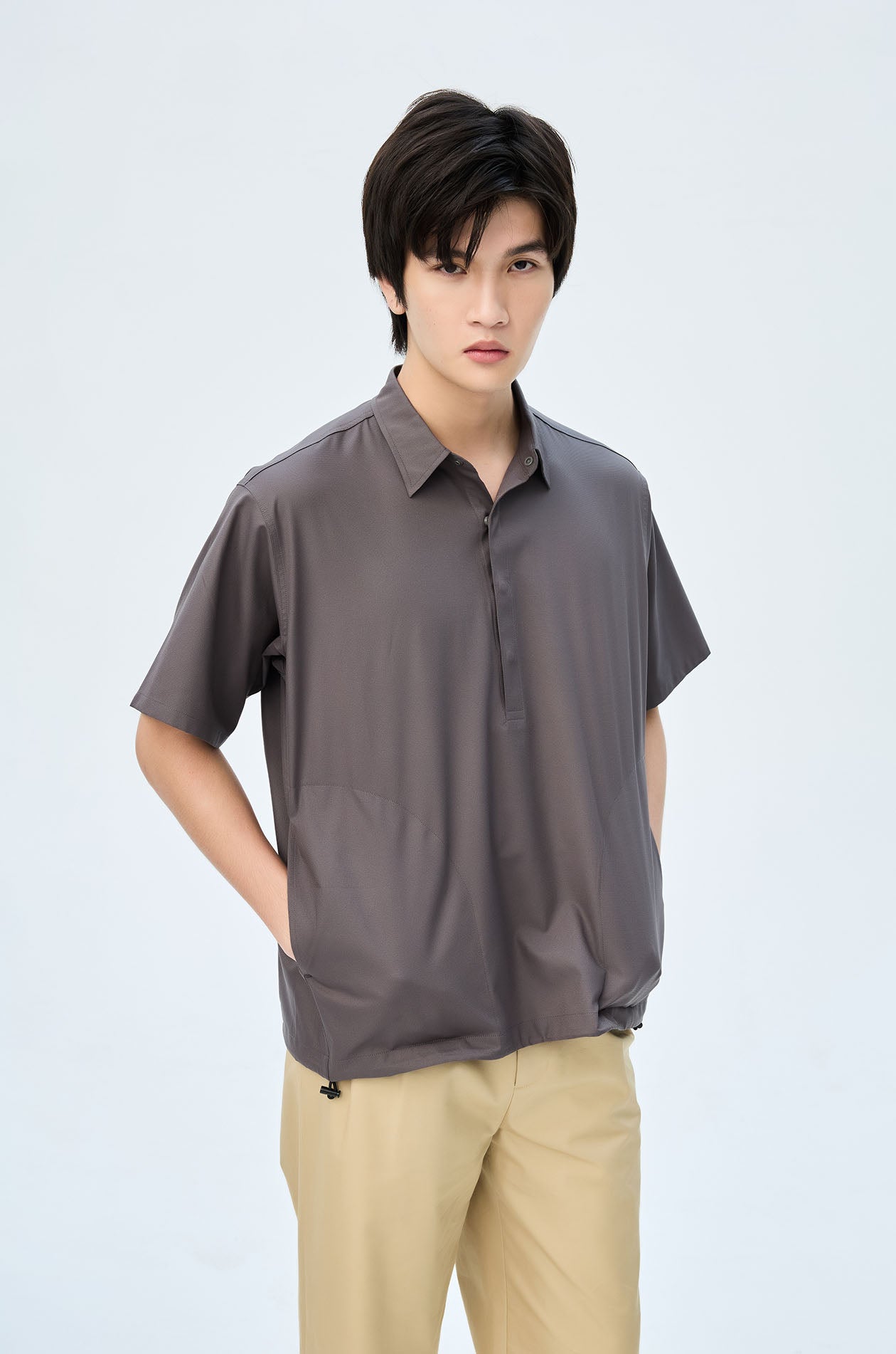 Short-sleeved sports shirt in lightweight fabric. Oversized fit with classic collar and drawstring hem. Half button closure. Available in grey.
