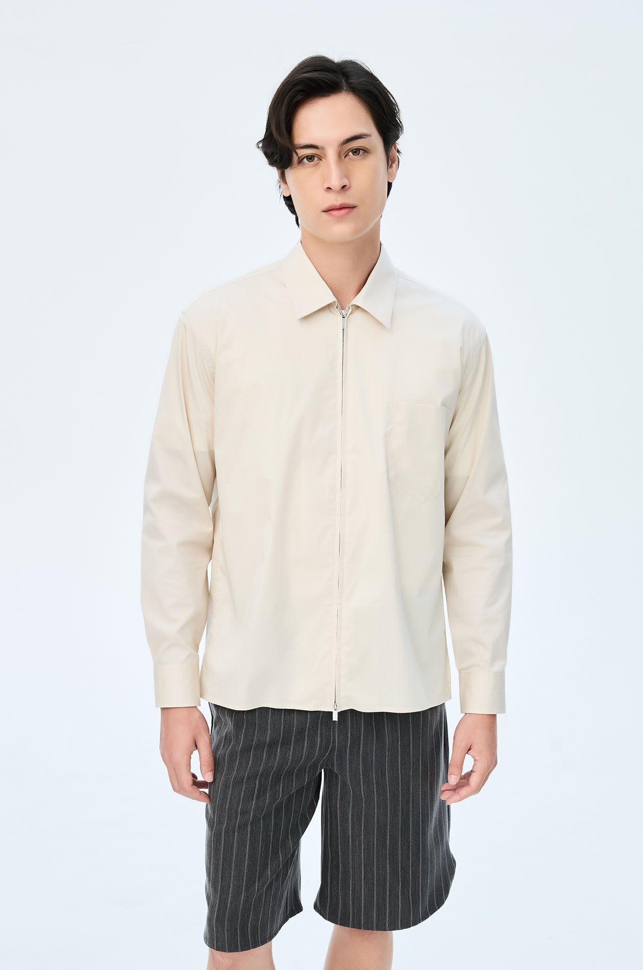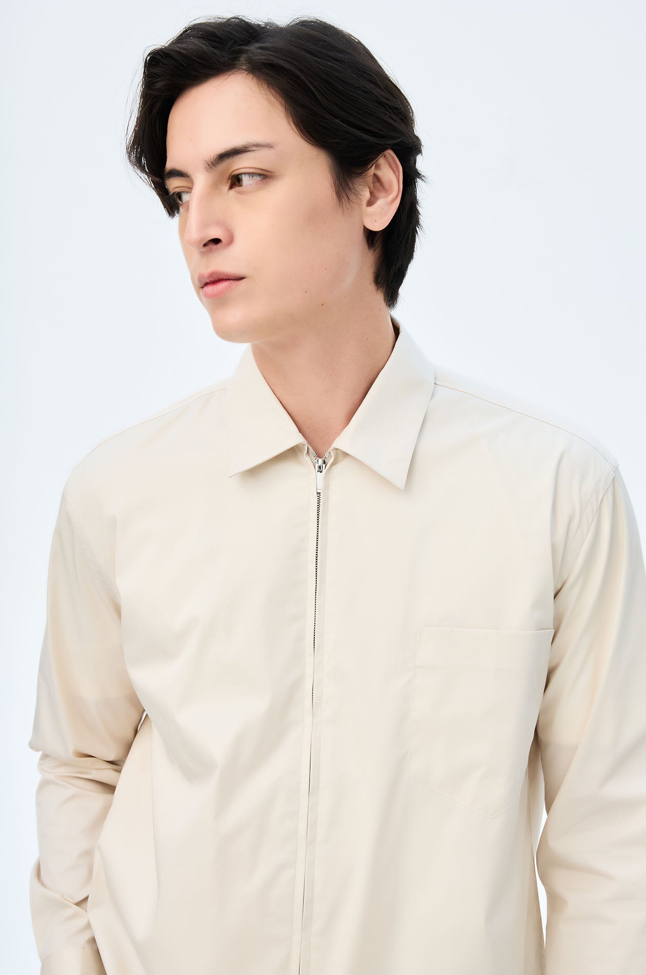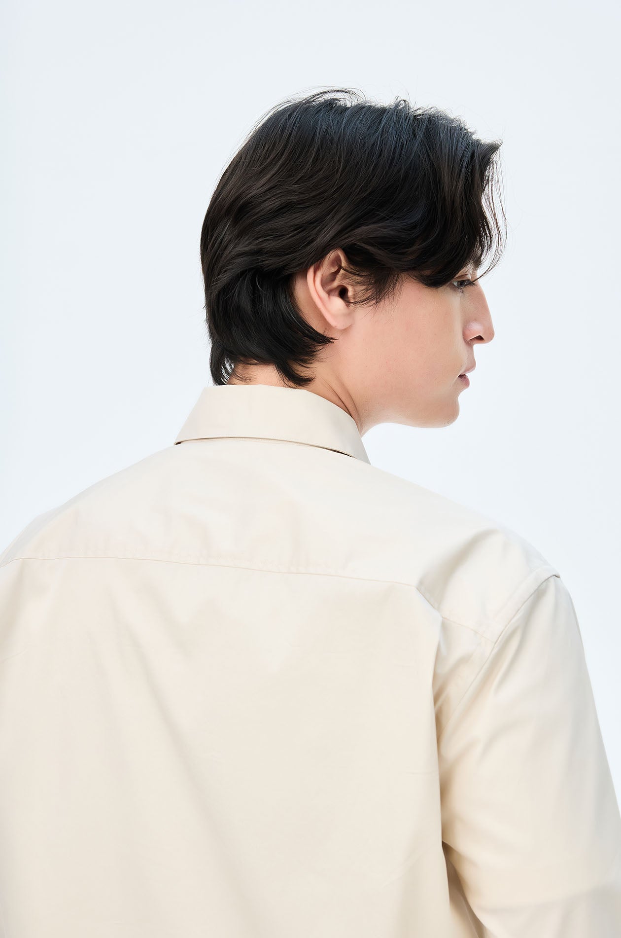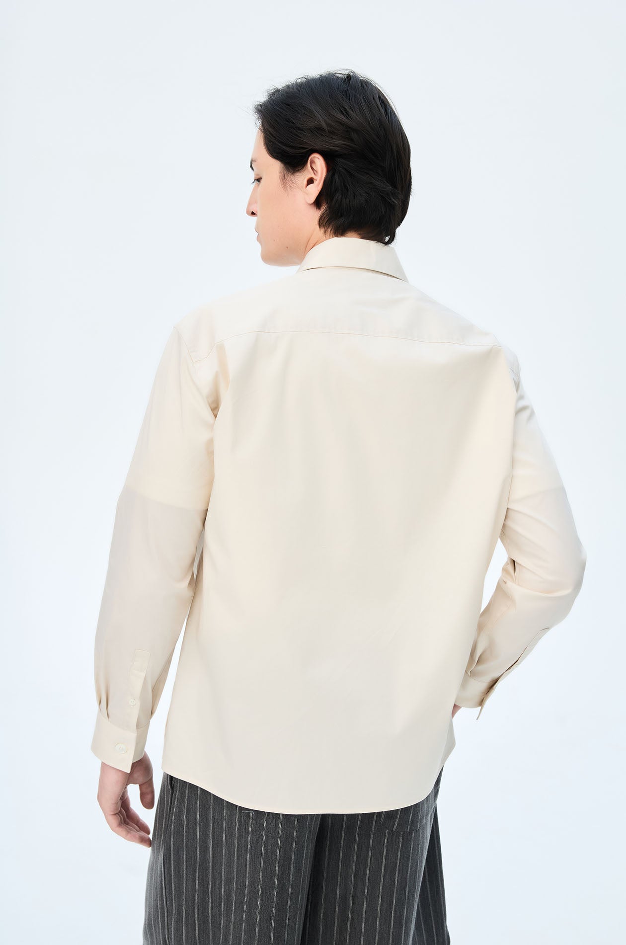 Long-sleeved shirt in poplin. Relaxed fit with classic collar and chest pocket. Front button closure. Available in beige.