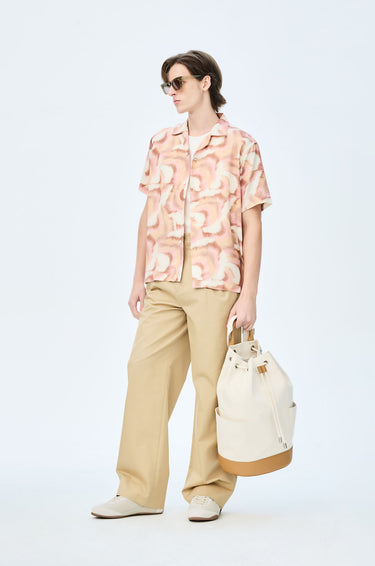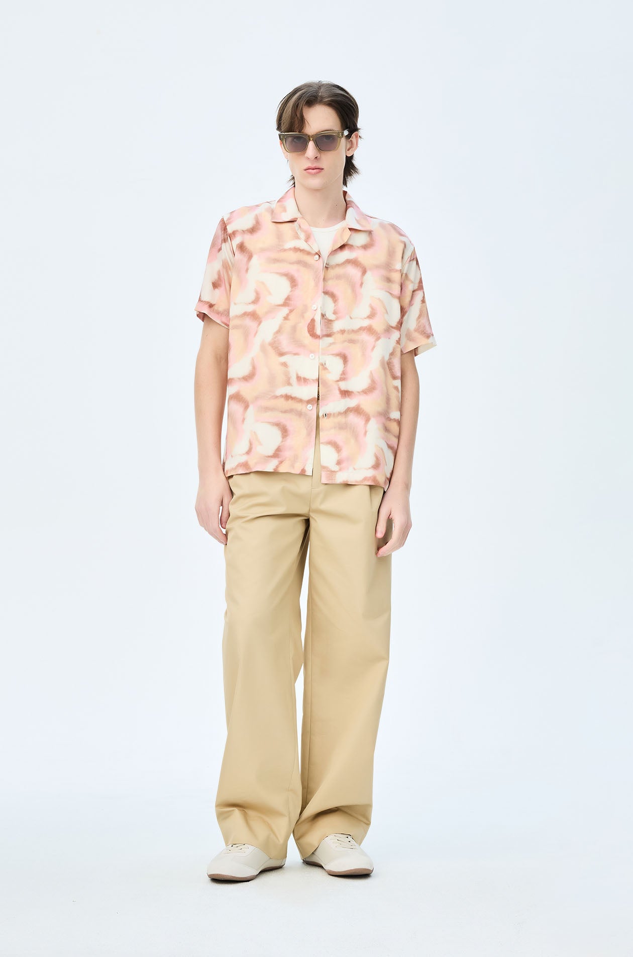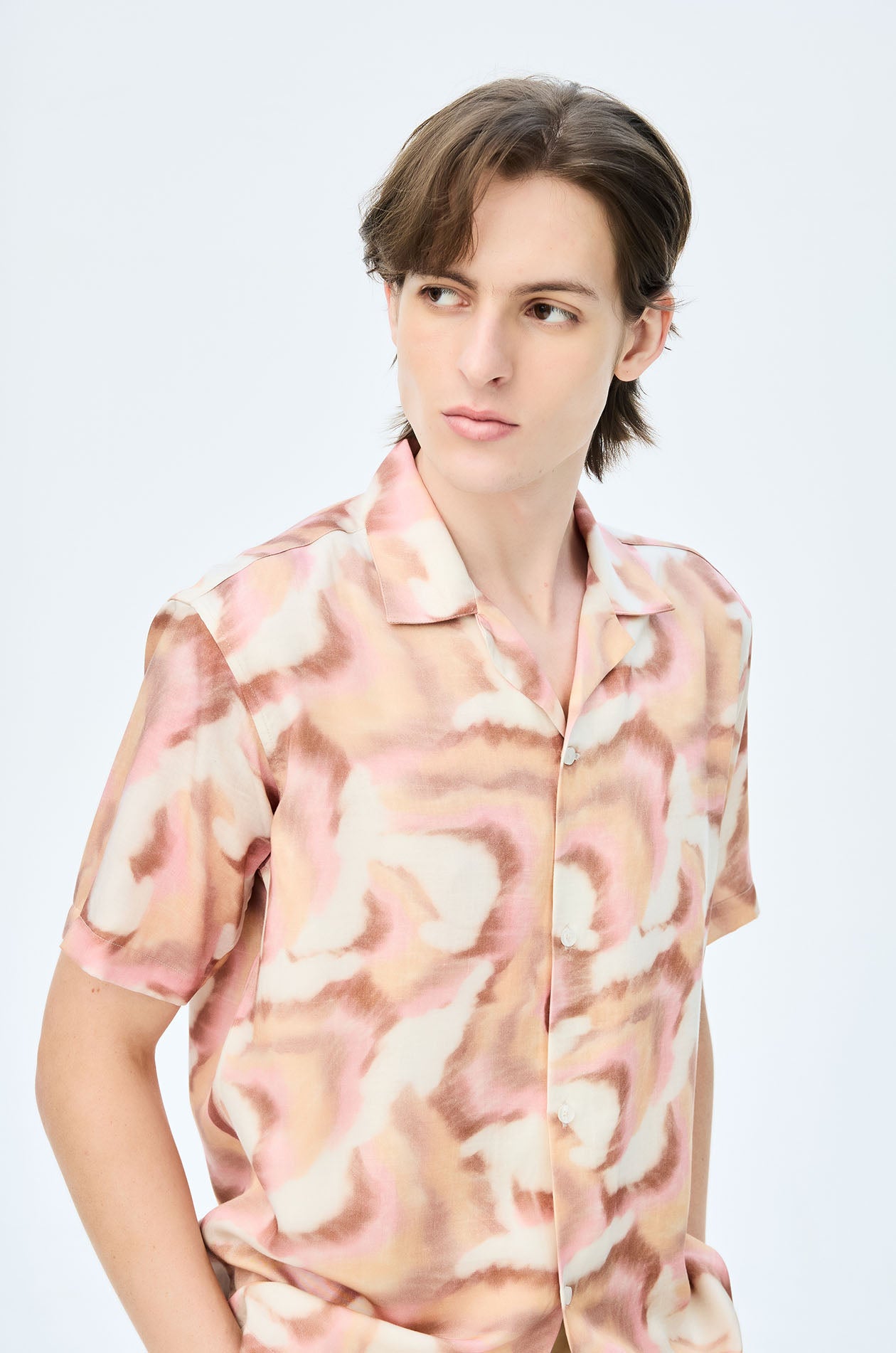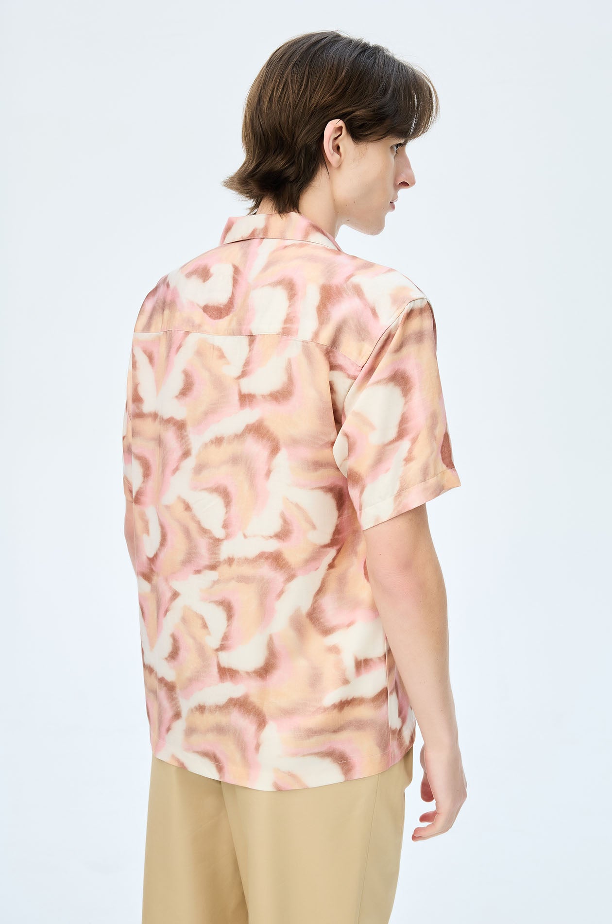 Short-sleeved shirt in TENCEL™ Lyocell and wool blend. Regular fit with allover abstract brushstroke motif print and camp collar. Front button closure. Available in multi-color.