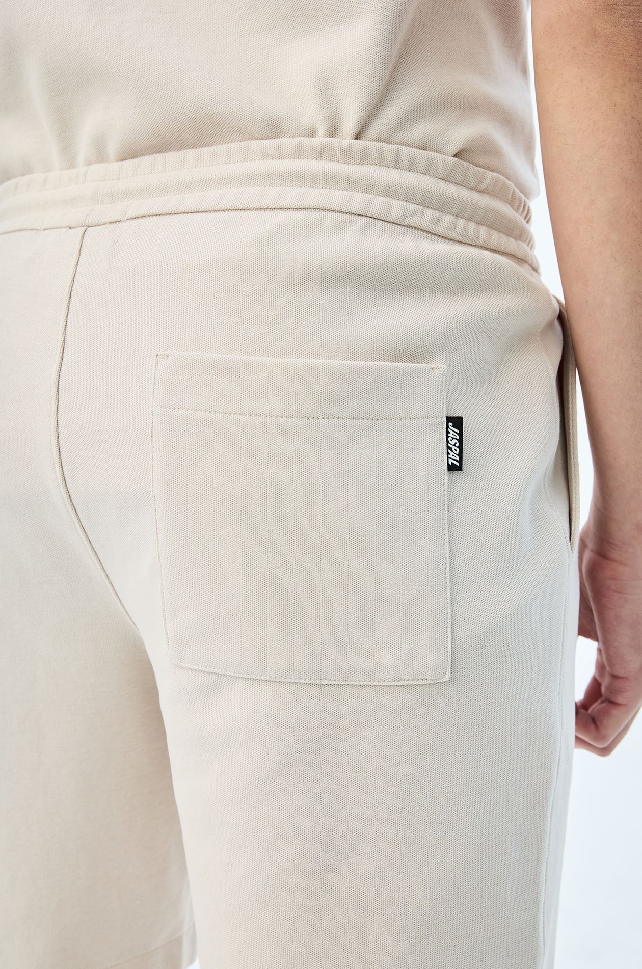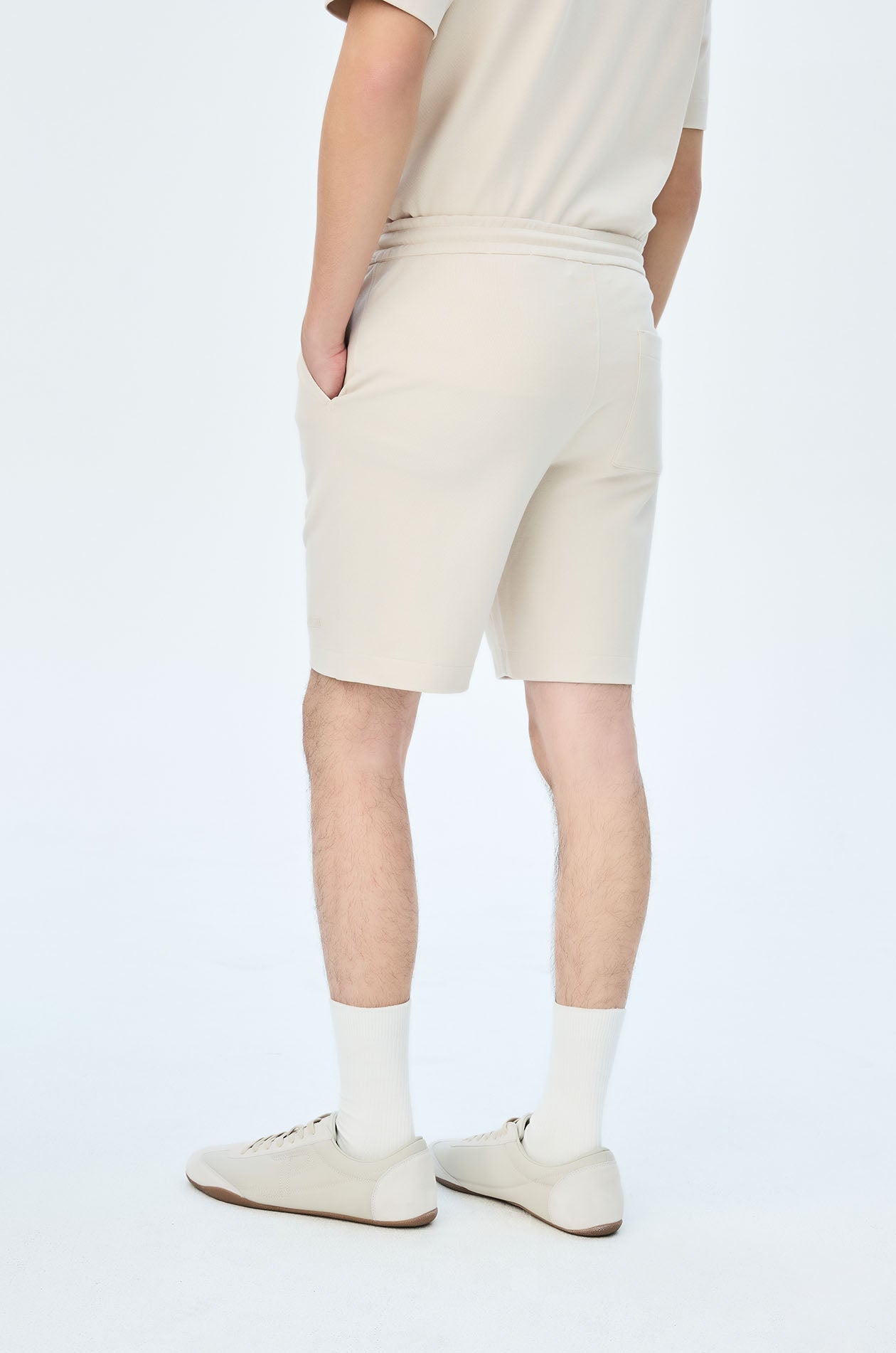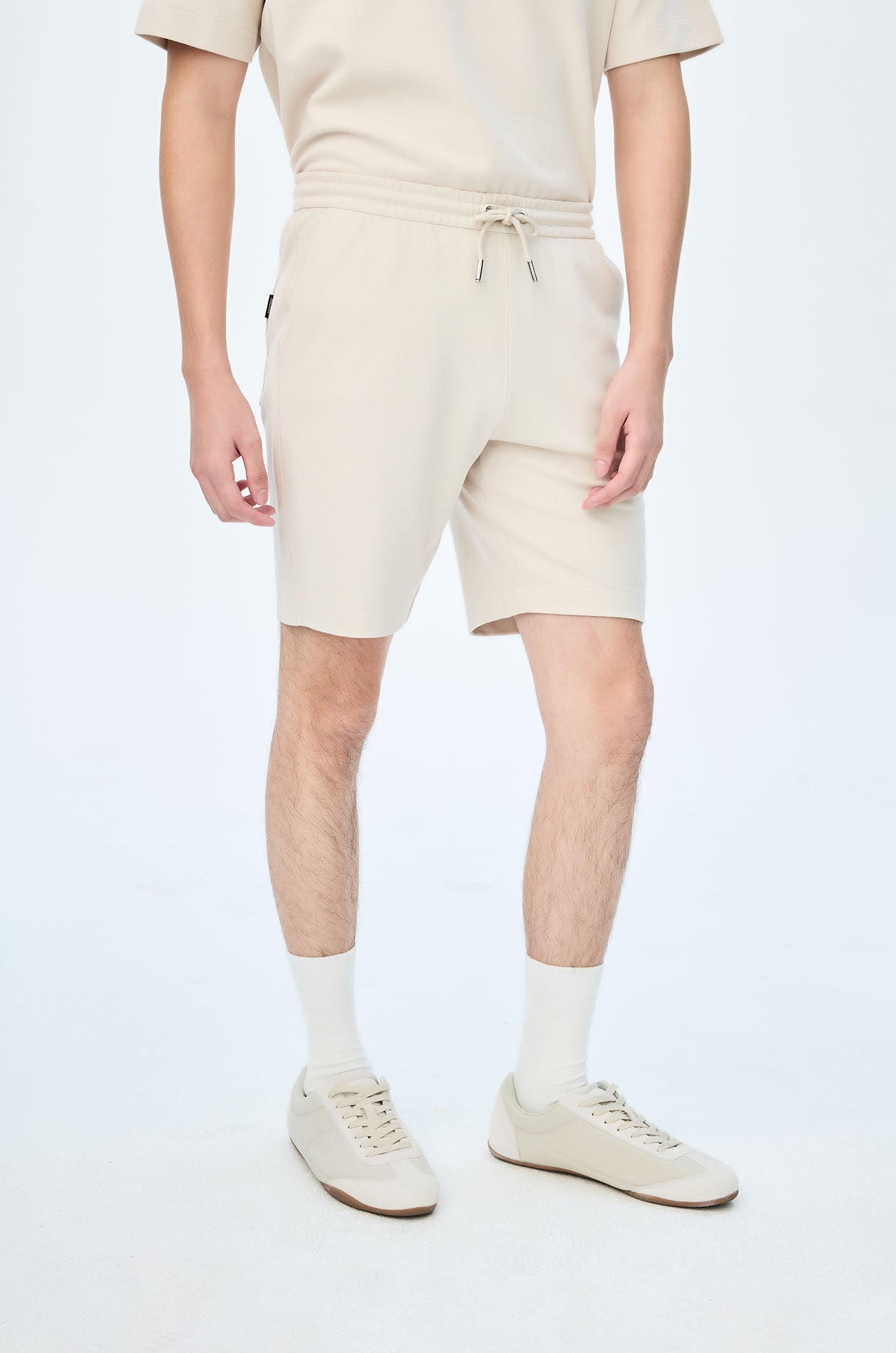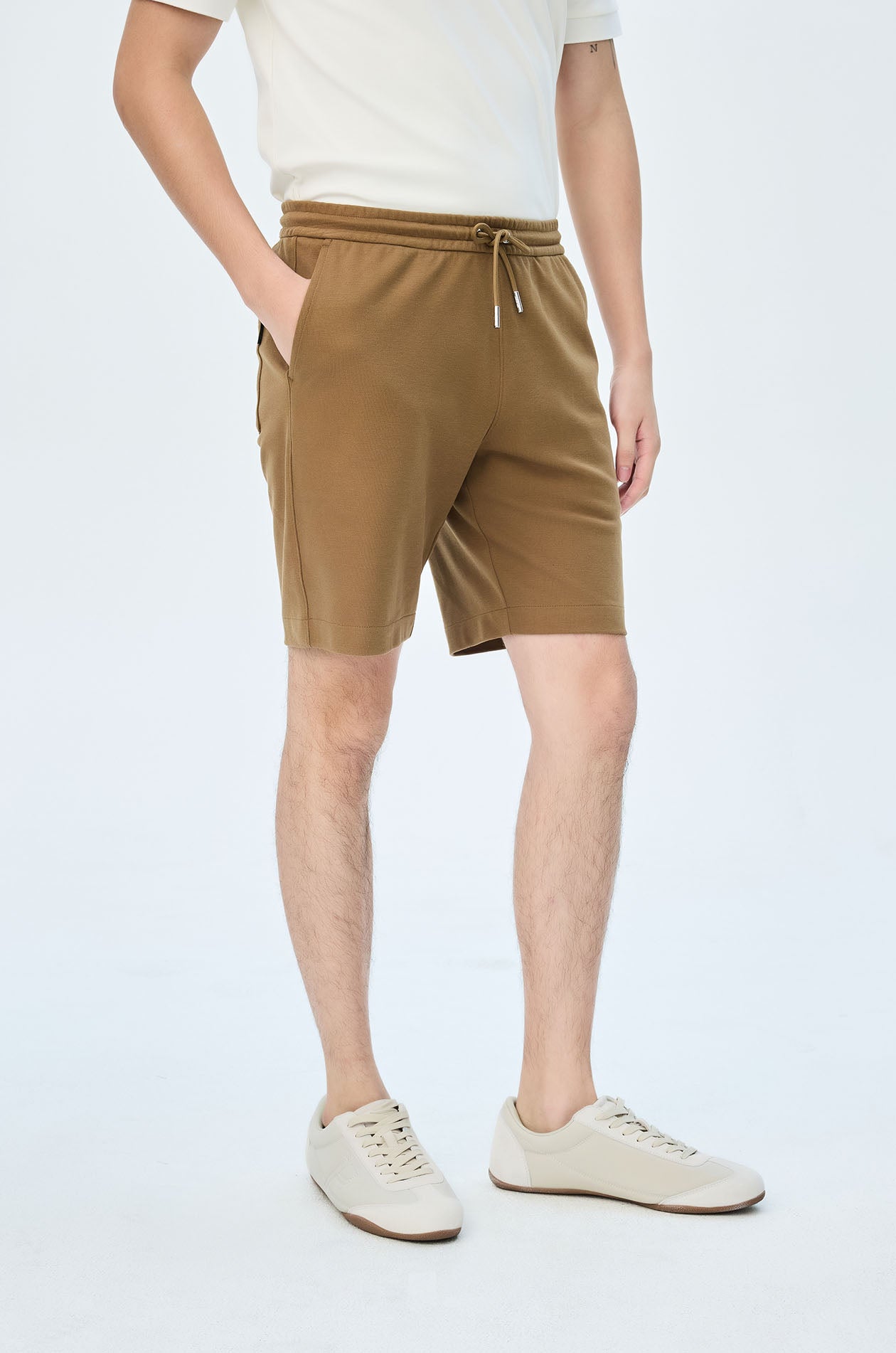 Mid-rise sweatshorts in cotton-blend pique. Above-knee length with side and back pockets. Elastic drawstring waistband. Available in light beige, navy, and olive brown.