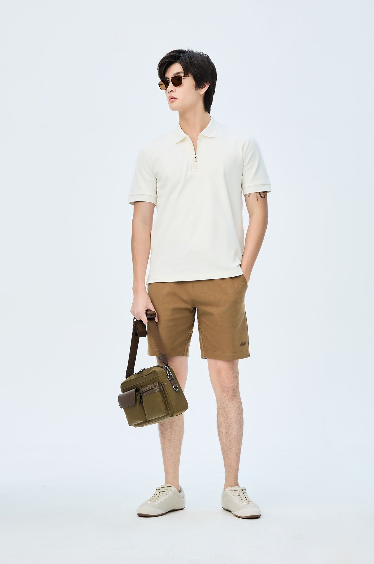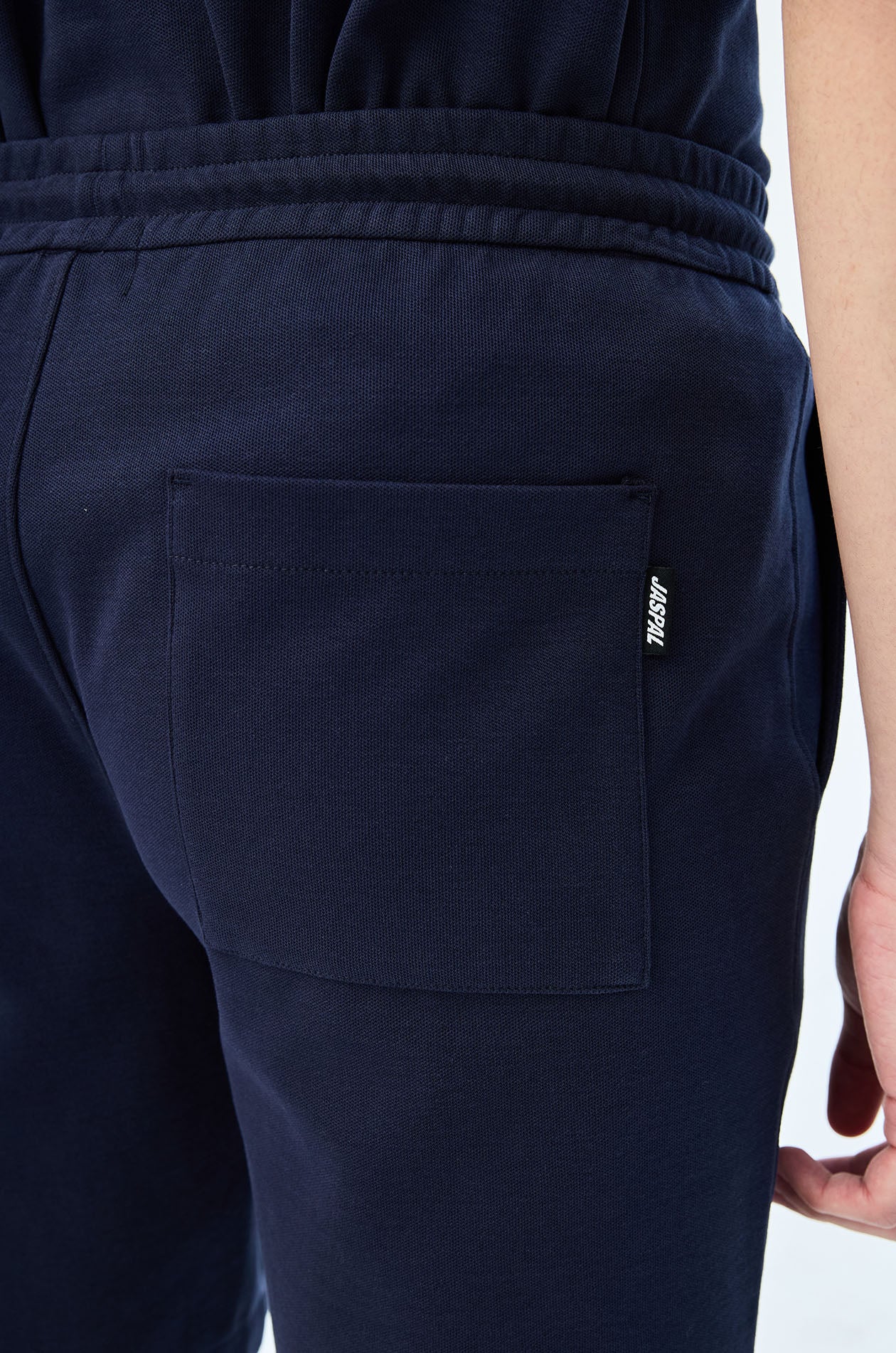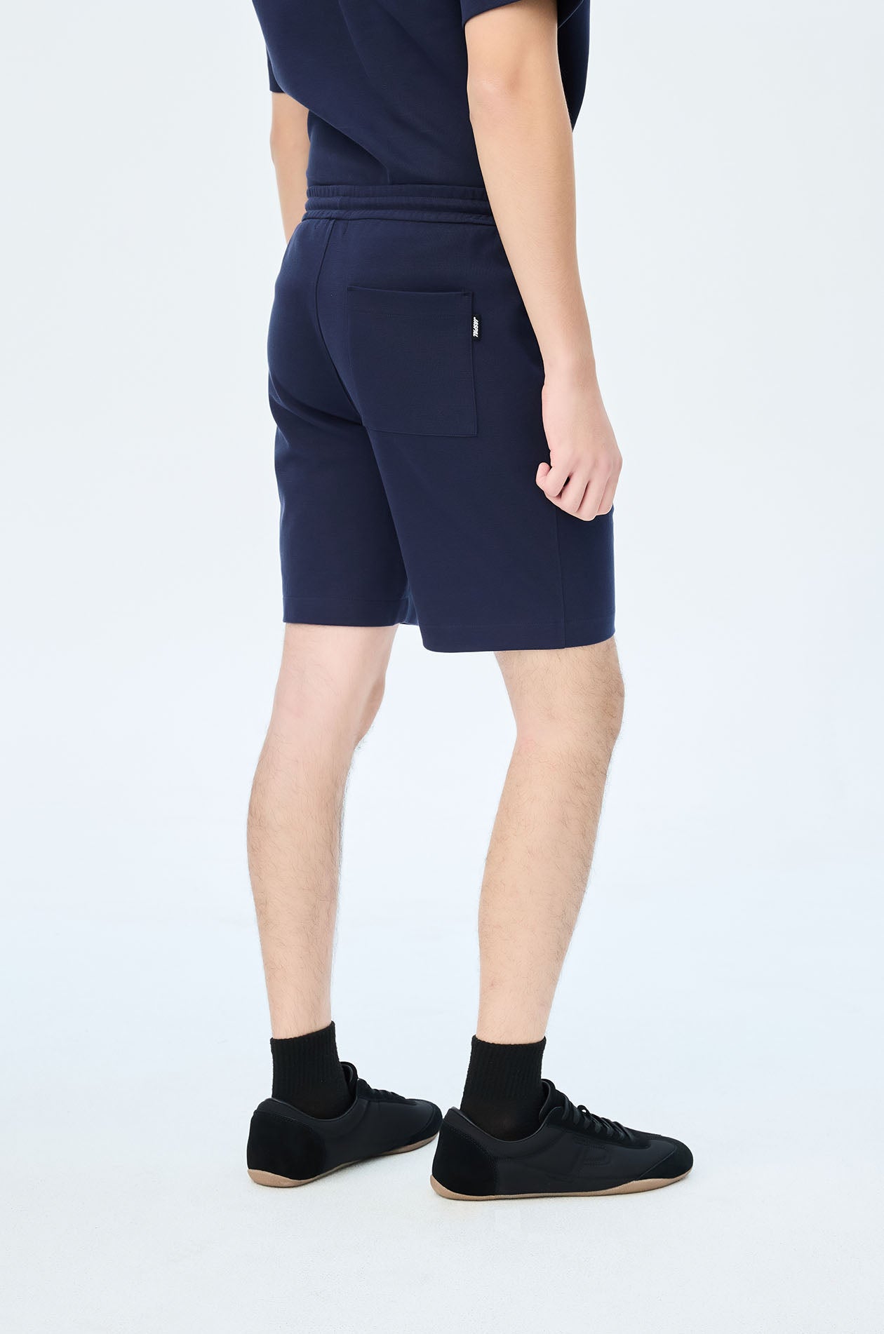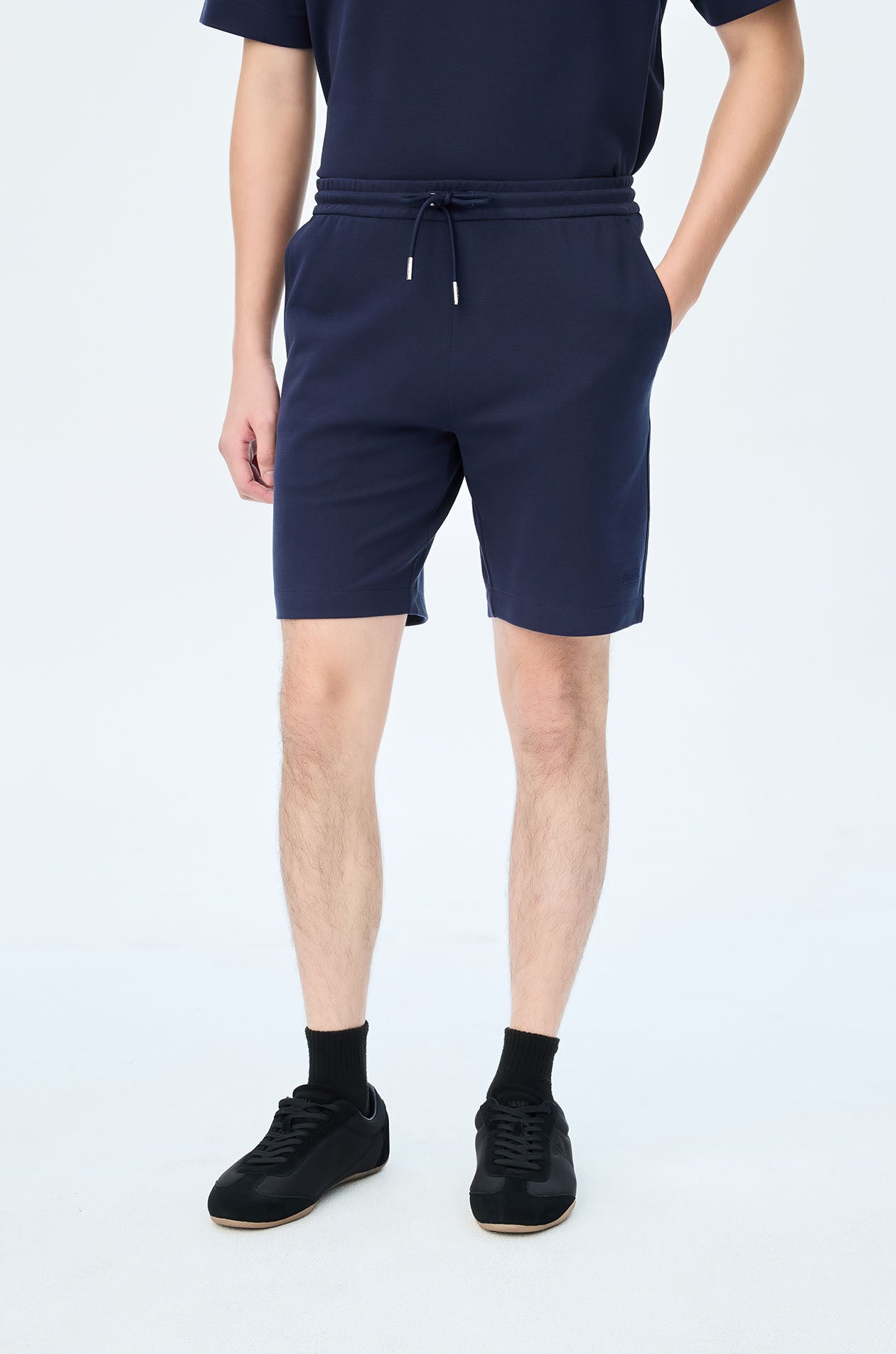 Mid-rise sweatshorts in cotton-blend pique. Above-knee length with side and back pockets. Elastic drawstring waistband. Available in light beige, navy, and olive brown.