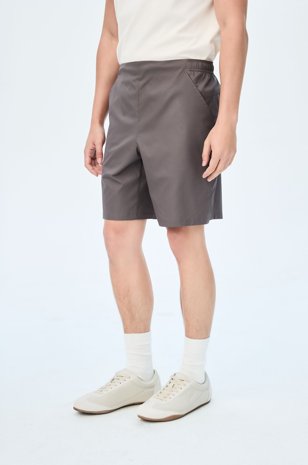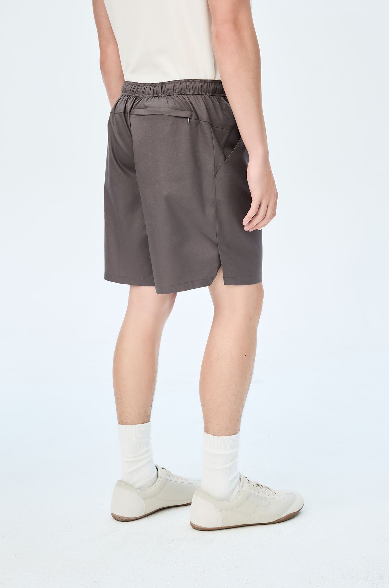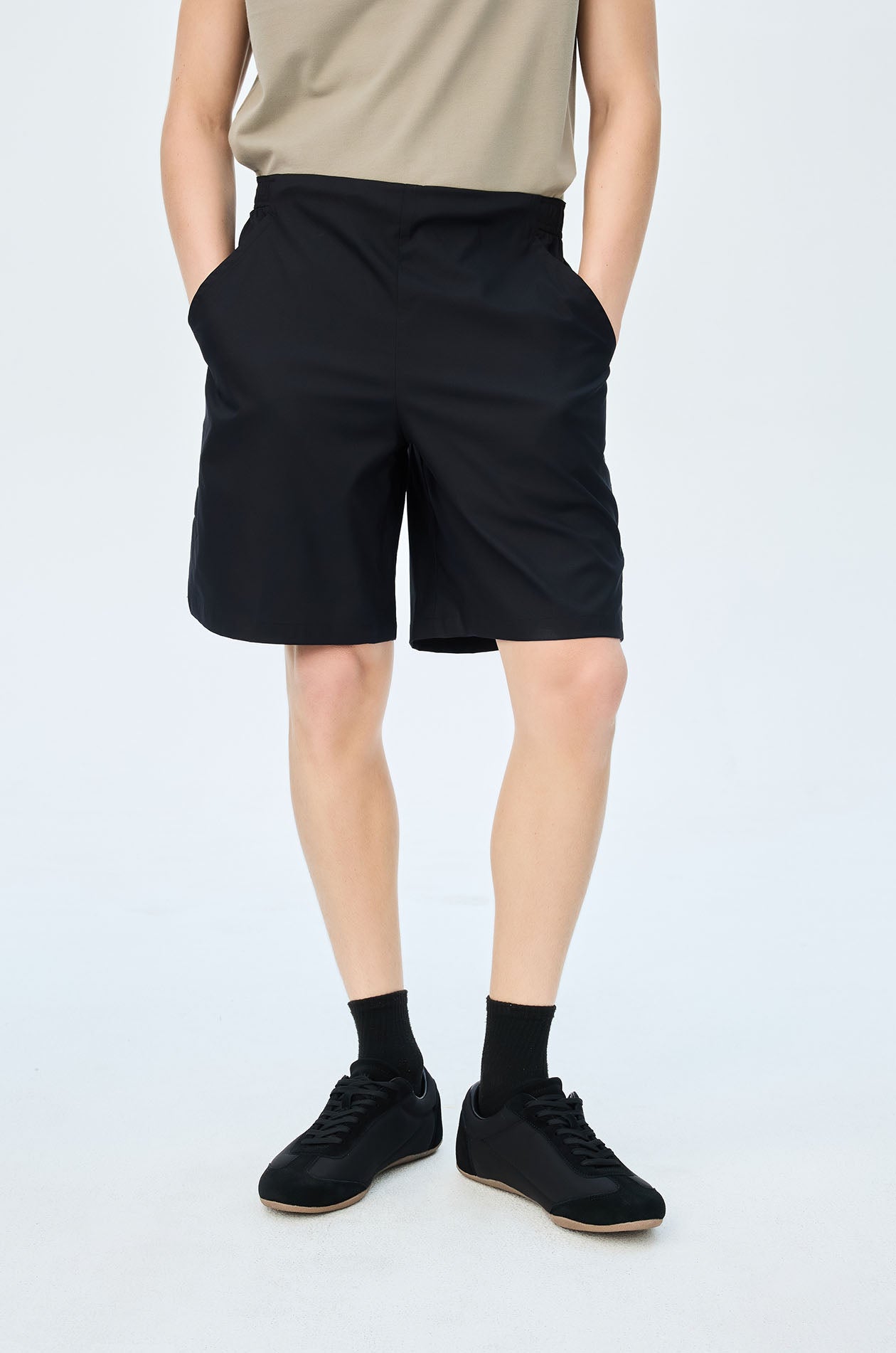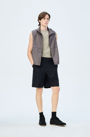 Mid-rise track shorts in lightweight fabric. Above-knee length with side and back pockets. Elastic drawstring waistband and slit hems. Available in black and grey.
