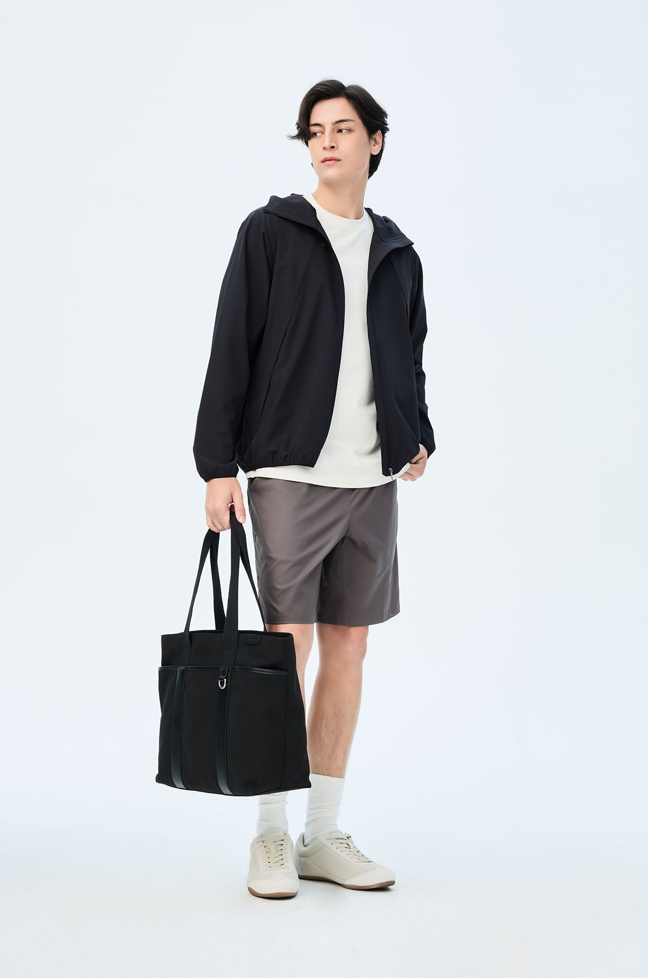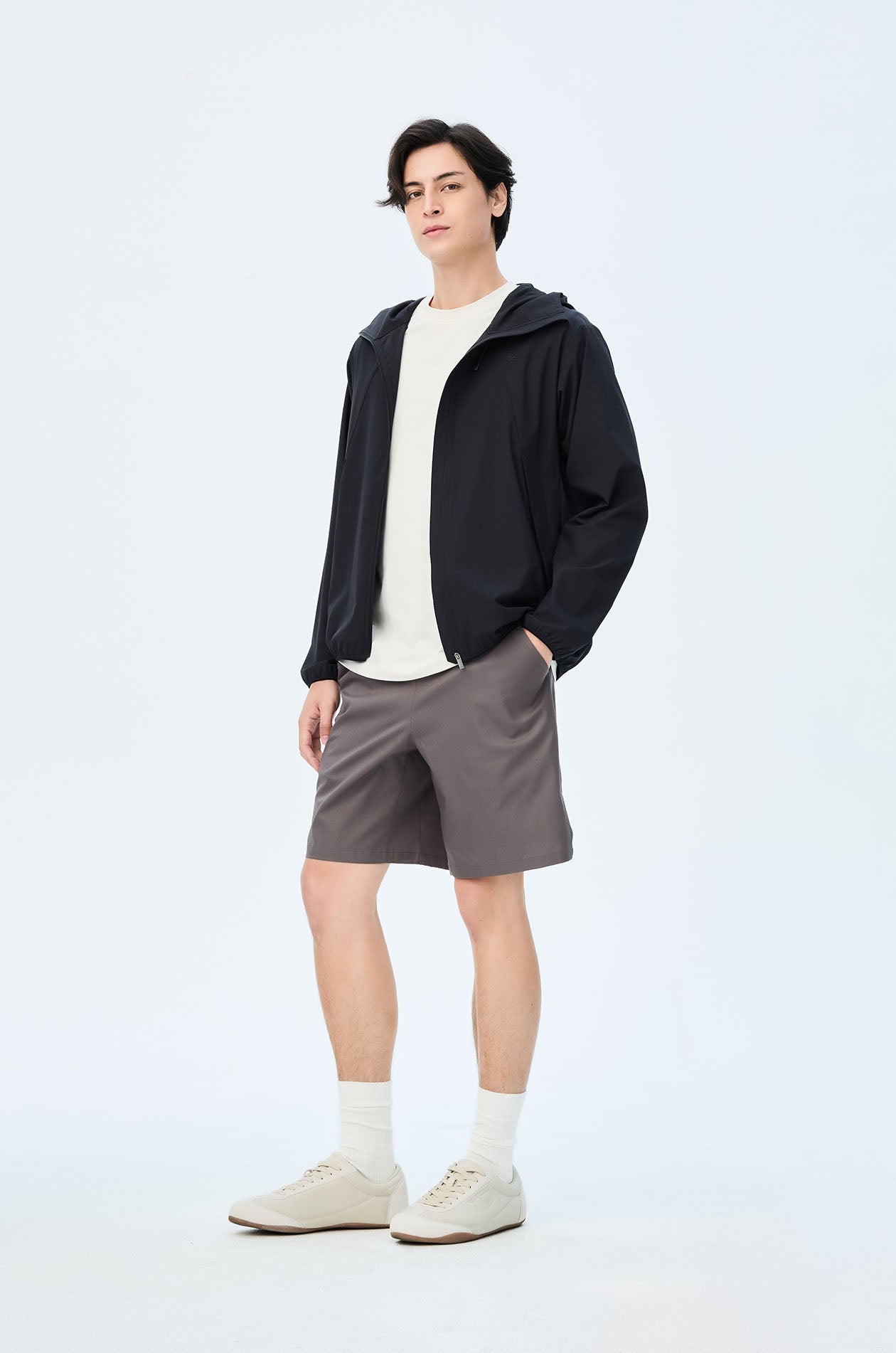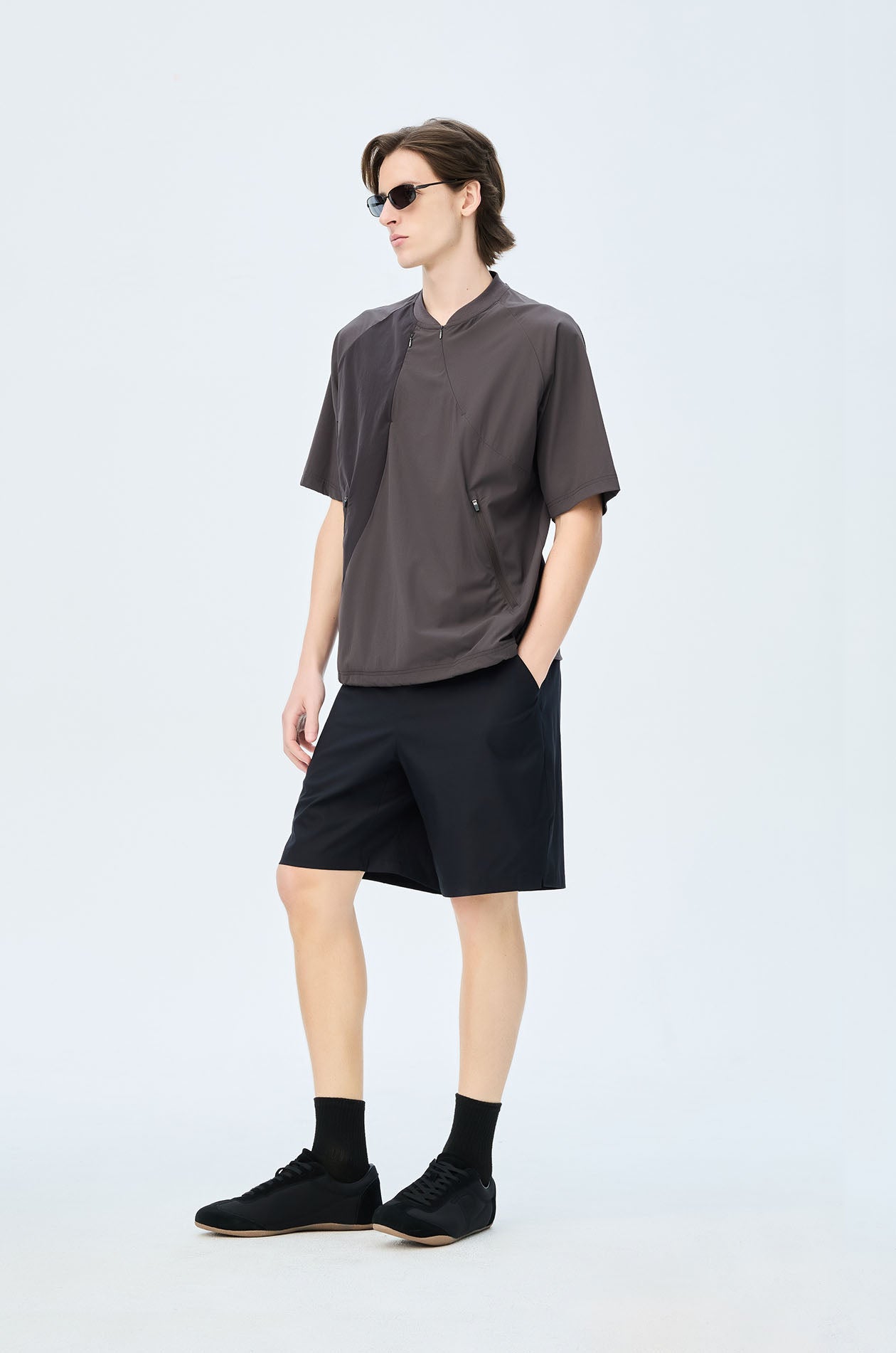 Mid-rise track shorts in lightweight fabric. Above-knee length with side and back pockets. Elastic drawstring waistband and slit hems. Available in black and grey.