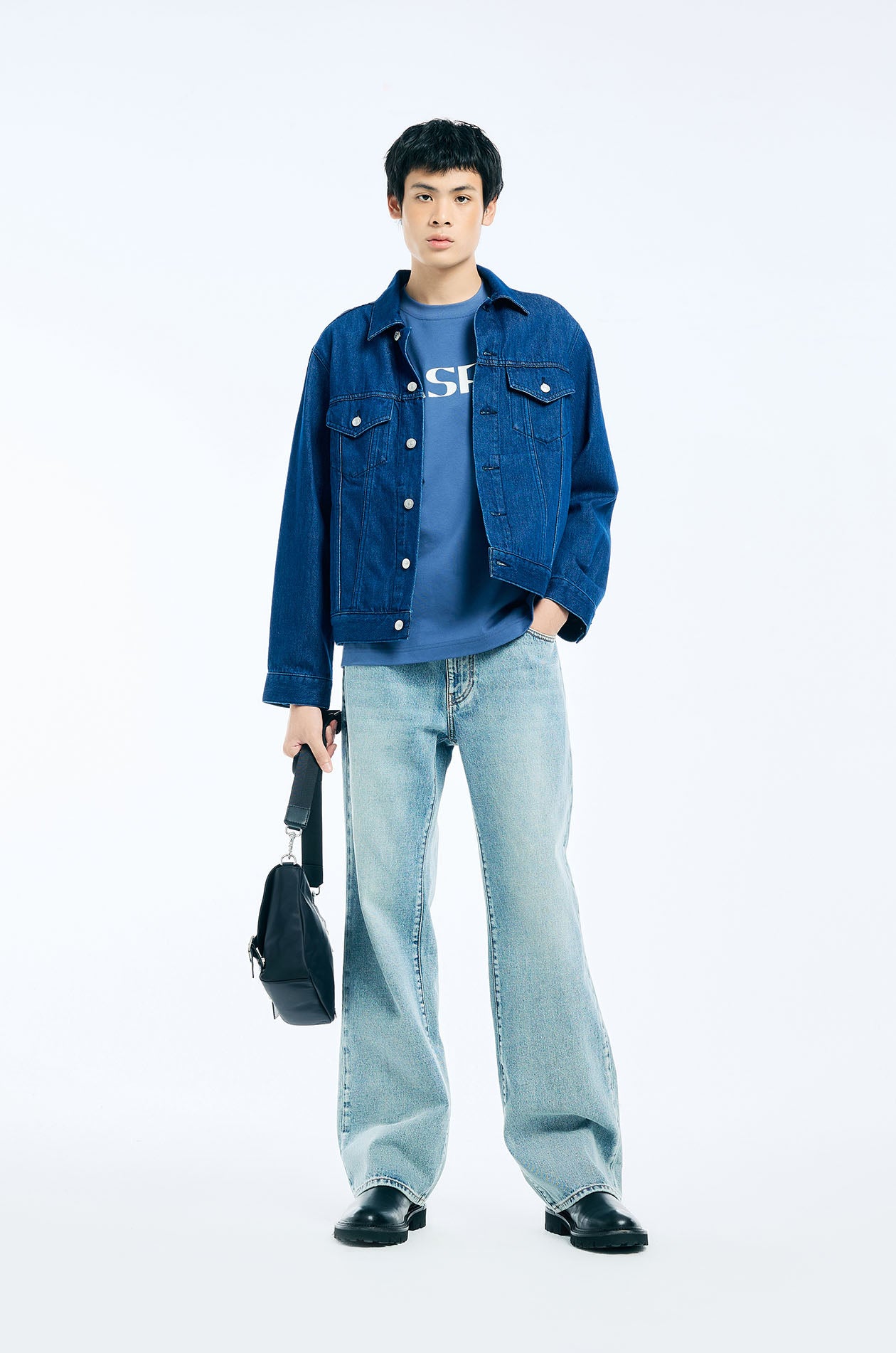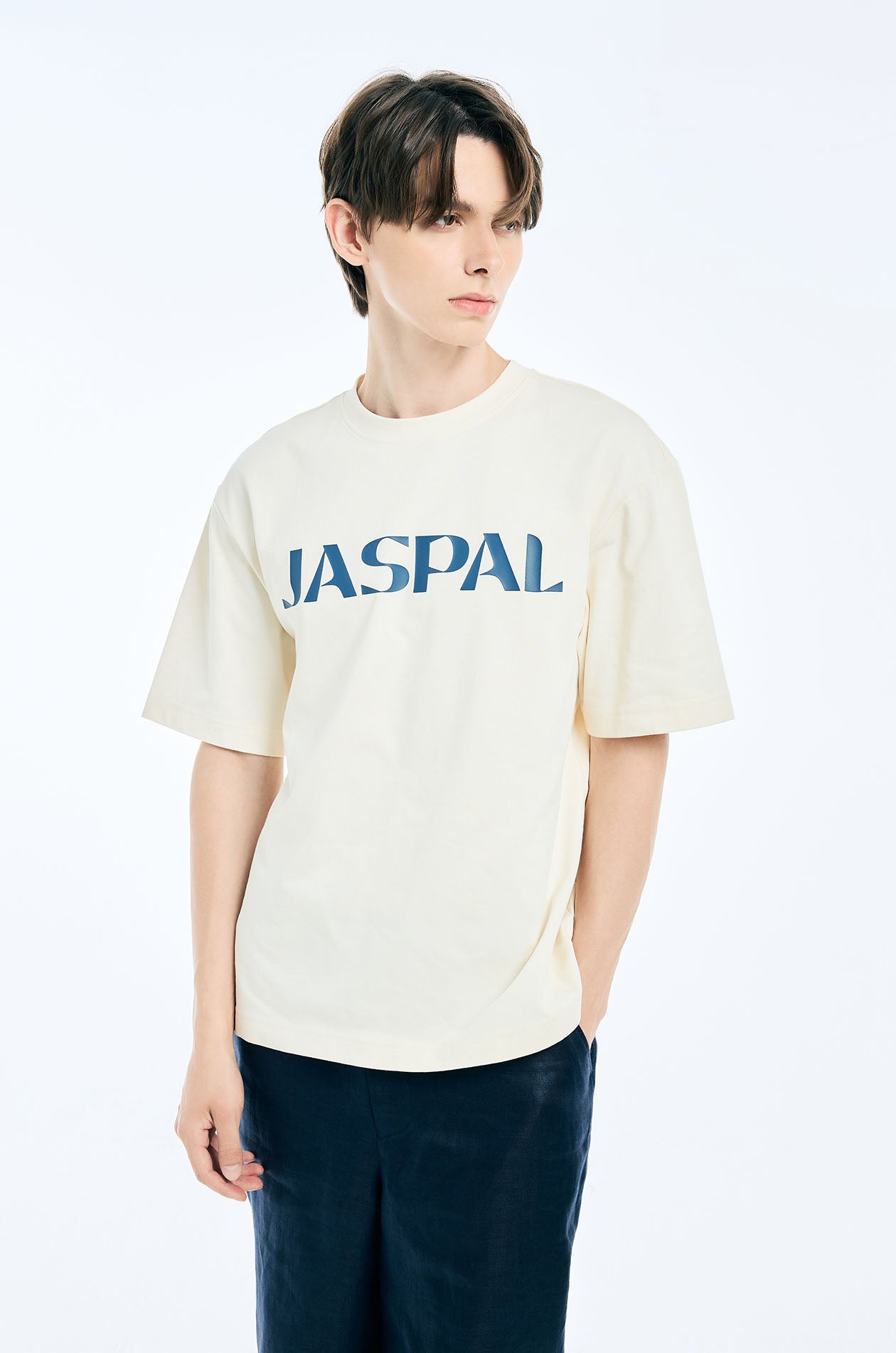 Short-sleeved T-shirt in jersey. Oversized fit with contrast Jaspal logo print and round neckline. Available in cream and dark blue.