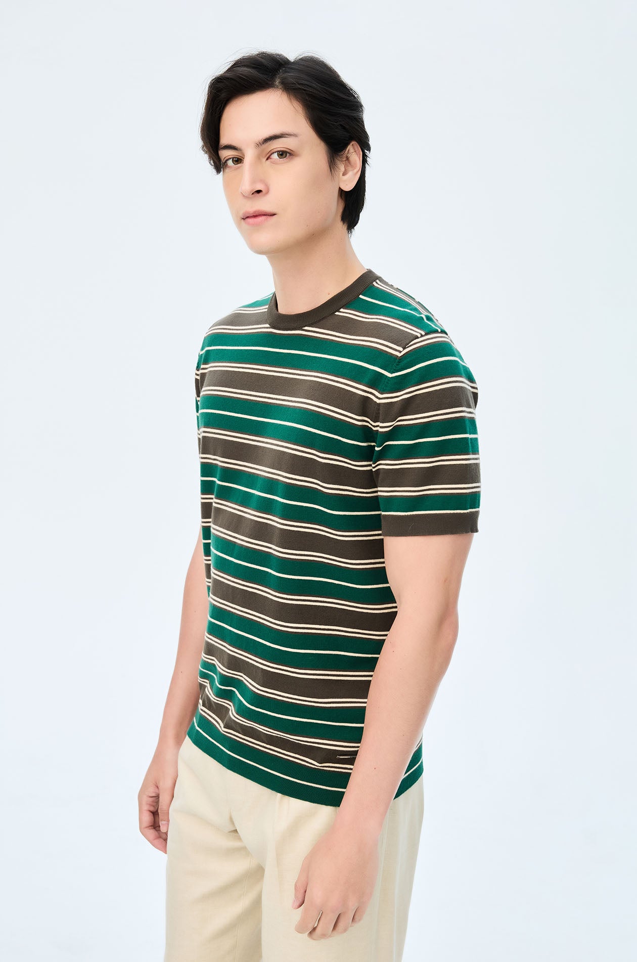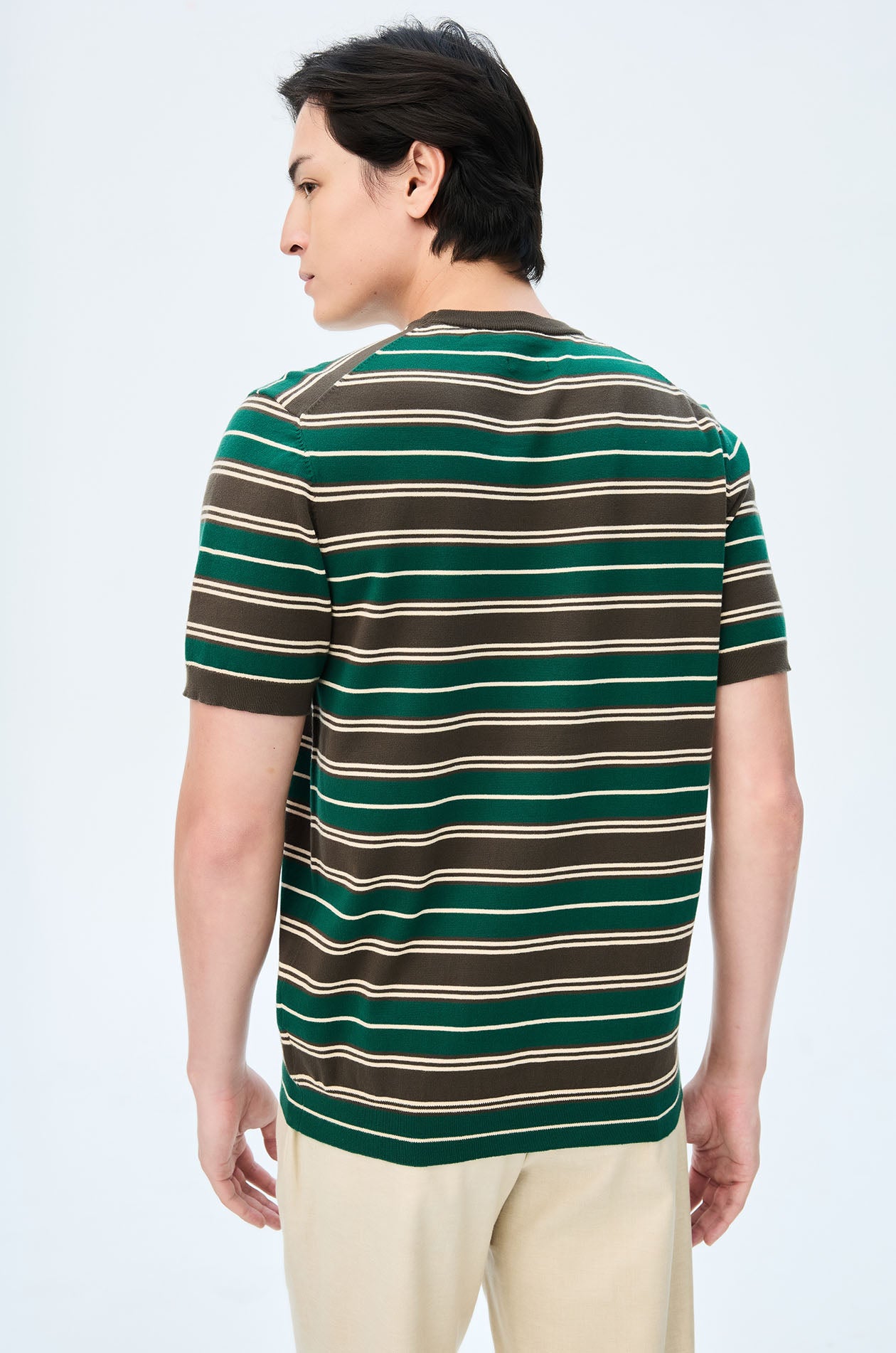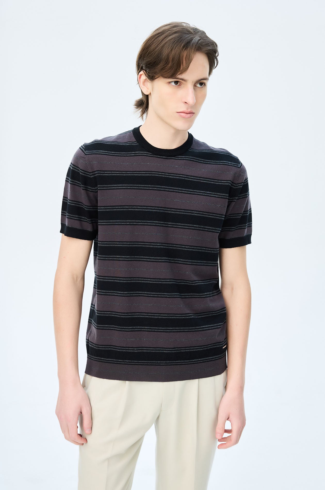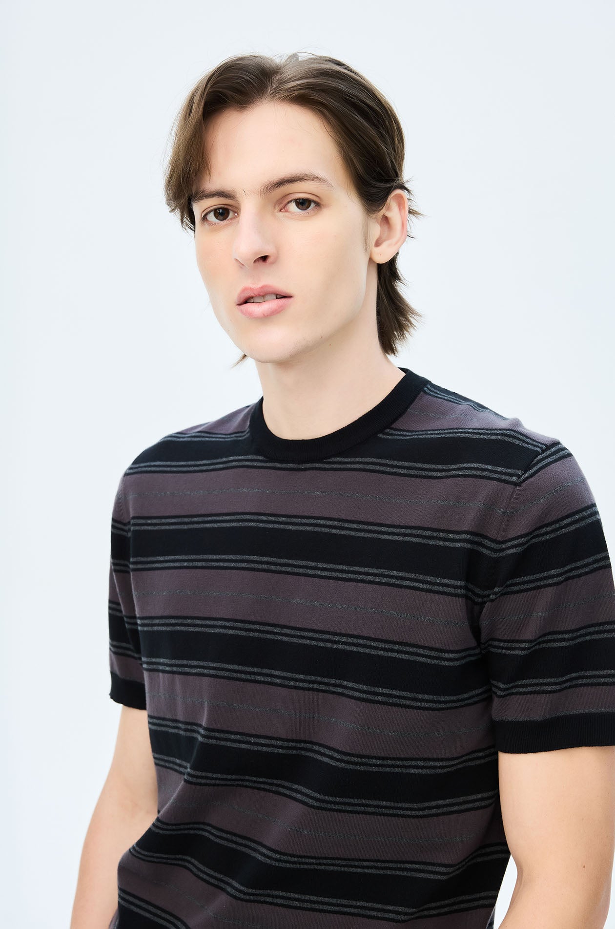 Short-sleeved T-shirt in fine knit fabric with stripes. Regular fit with round neckline. Available in black, dark green and beige.