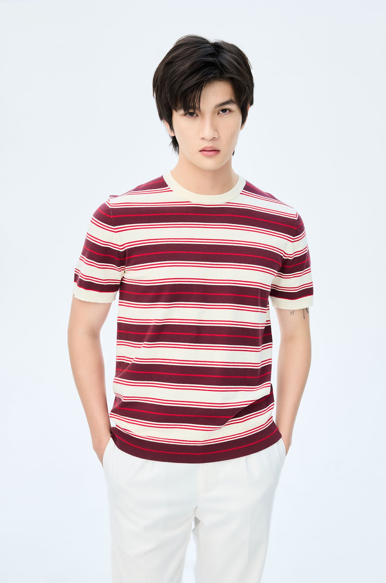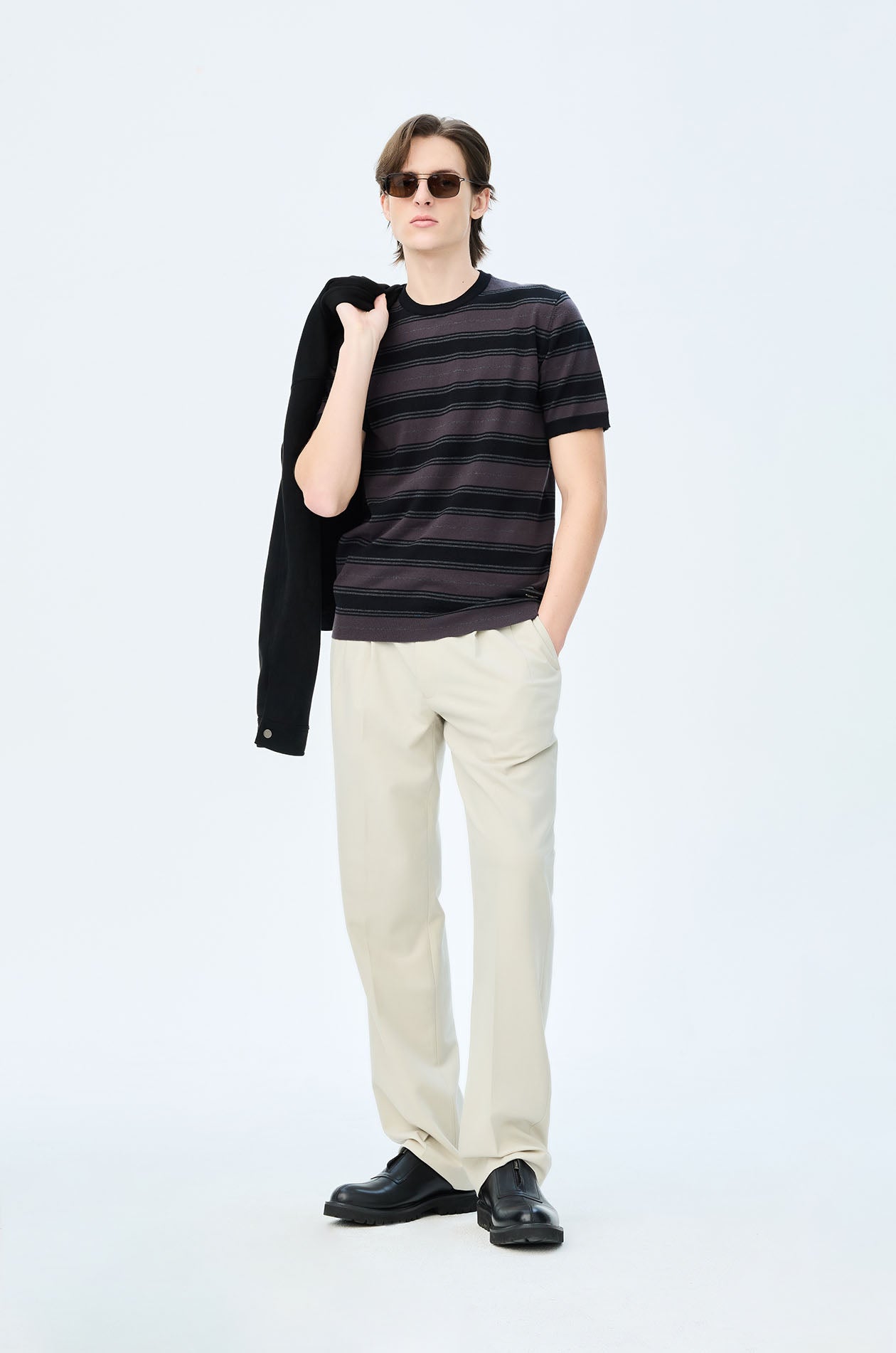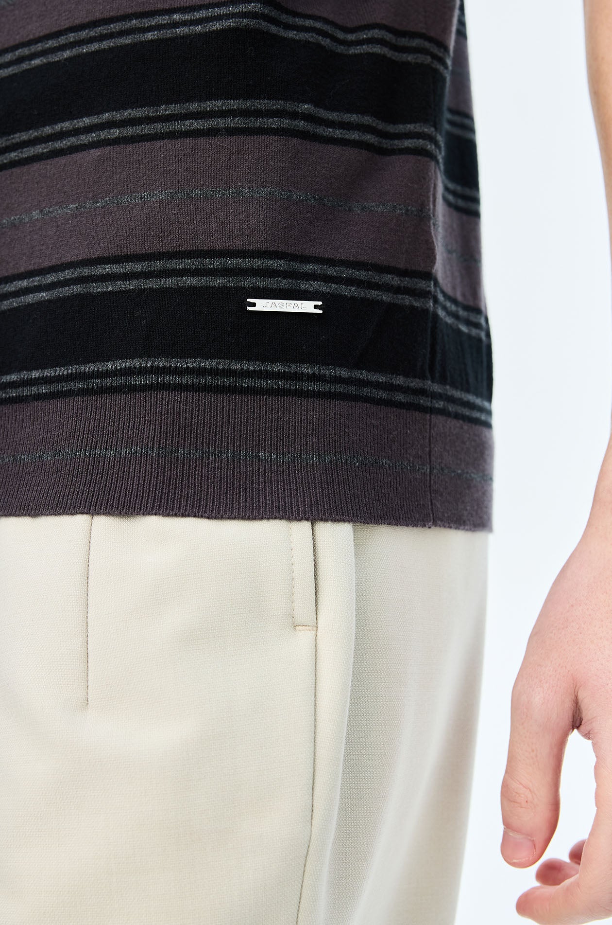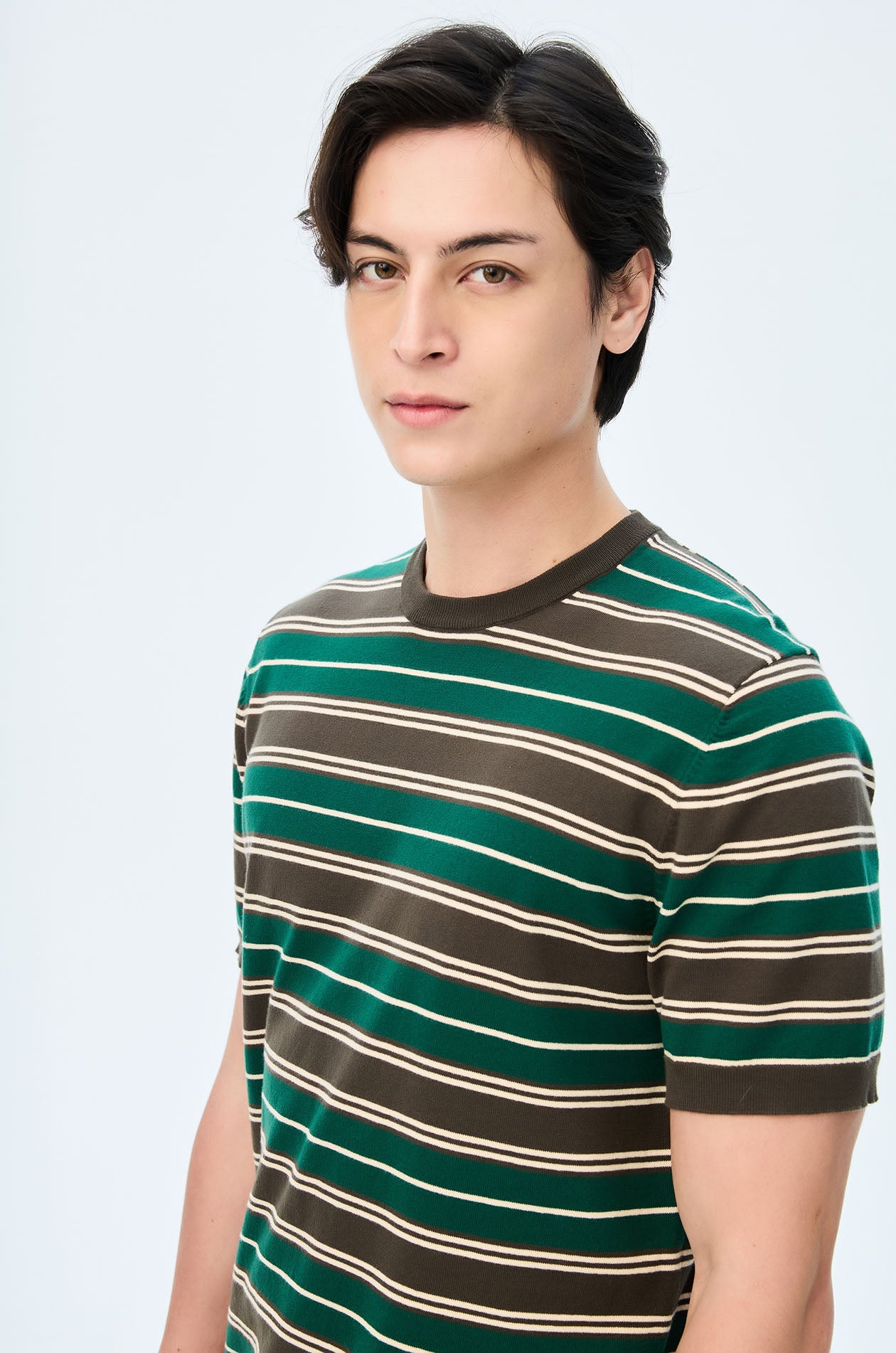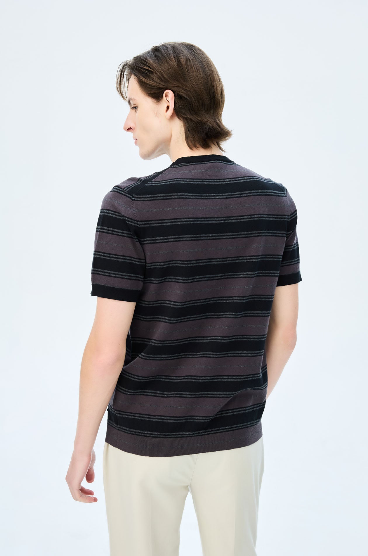 Short-sleeved T-shirt in fine knit fabric with stripes. Regular fit with round neckline. Available in black, dark green and beige.