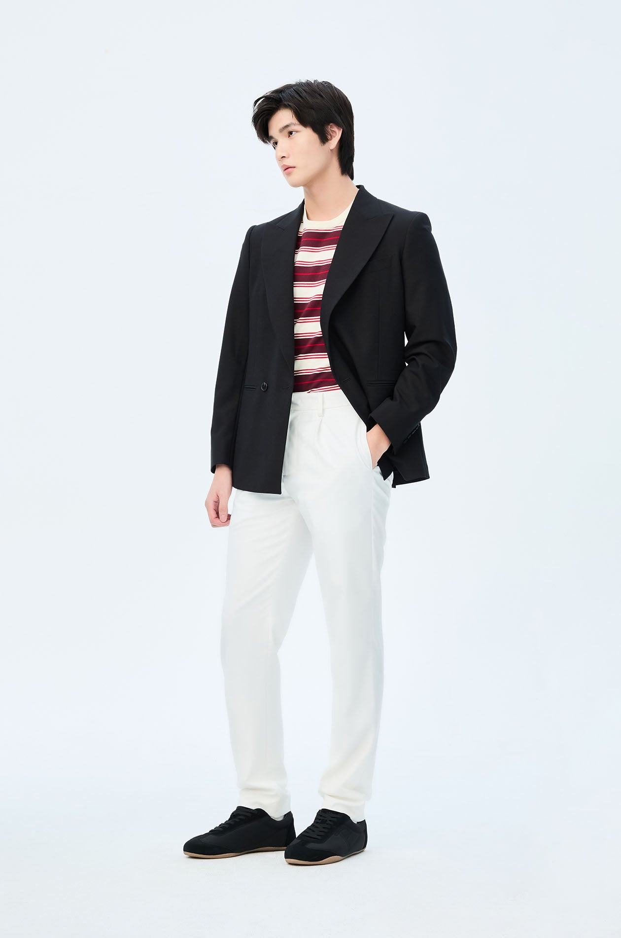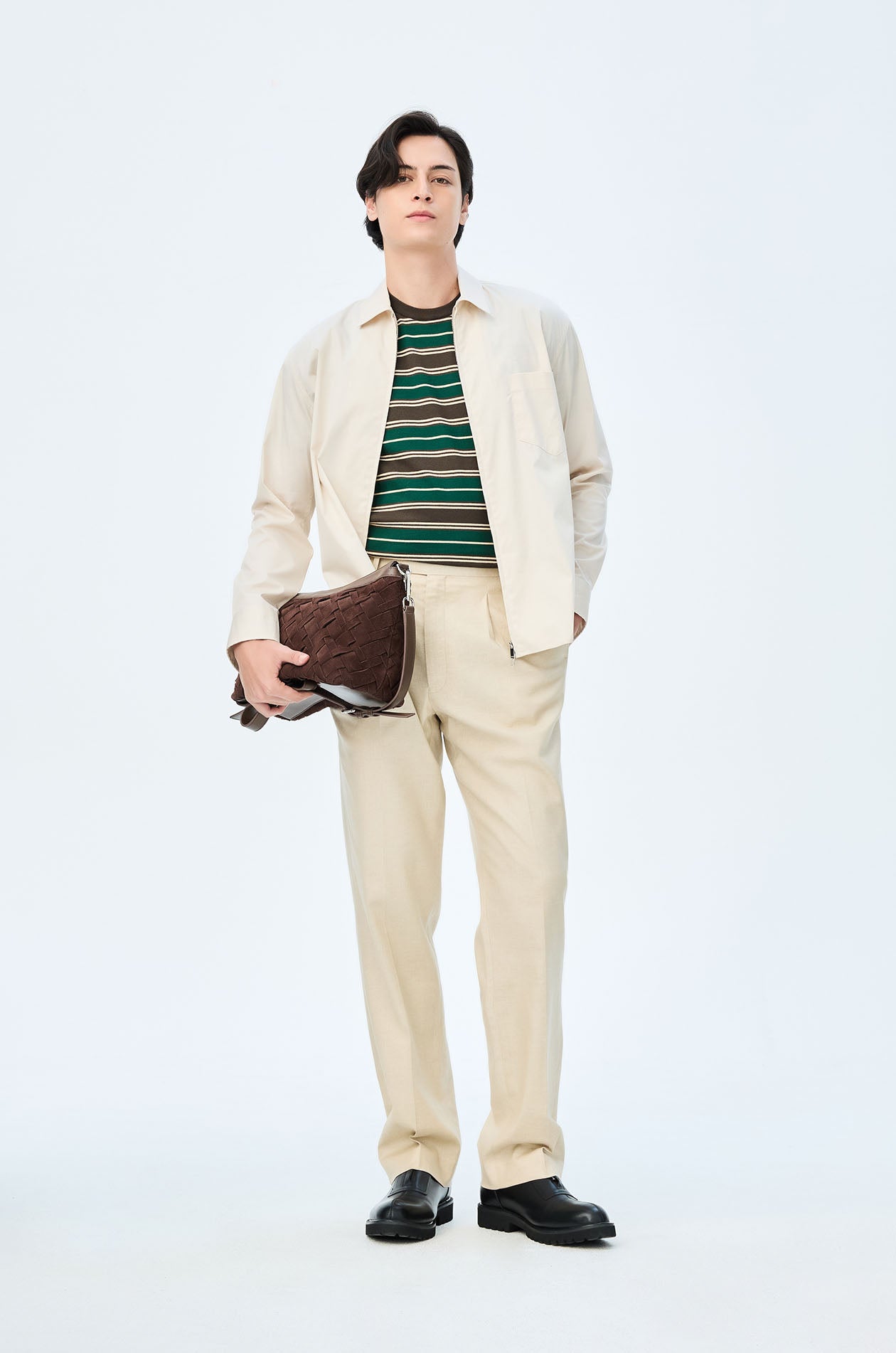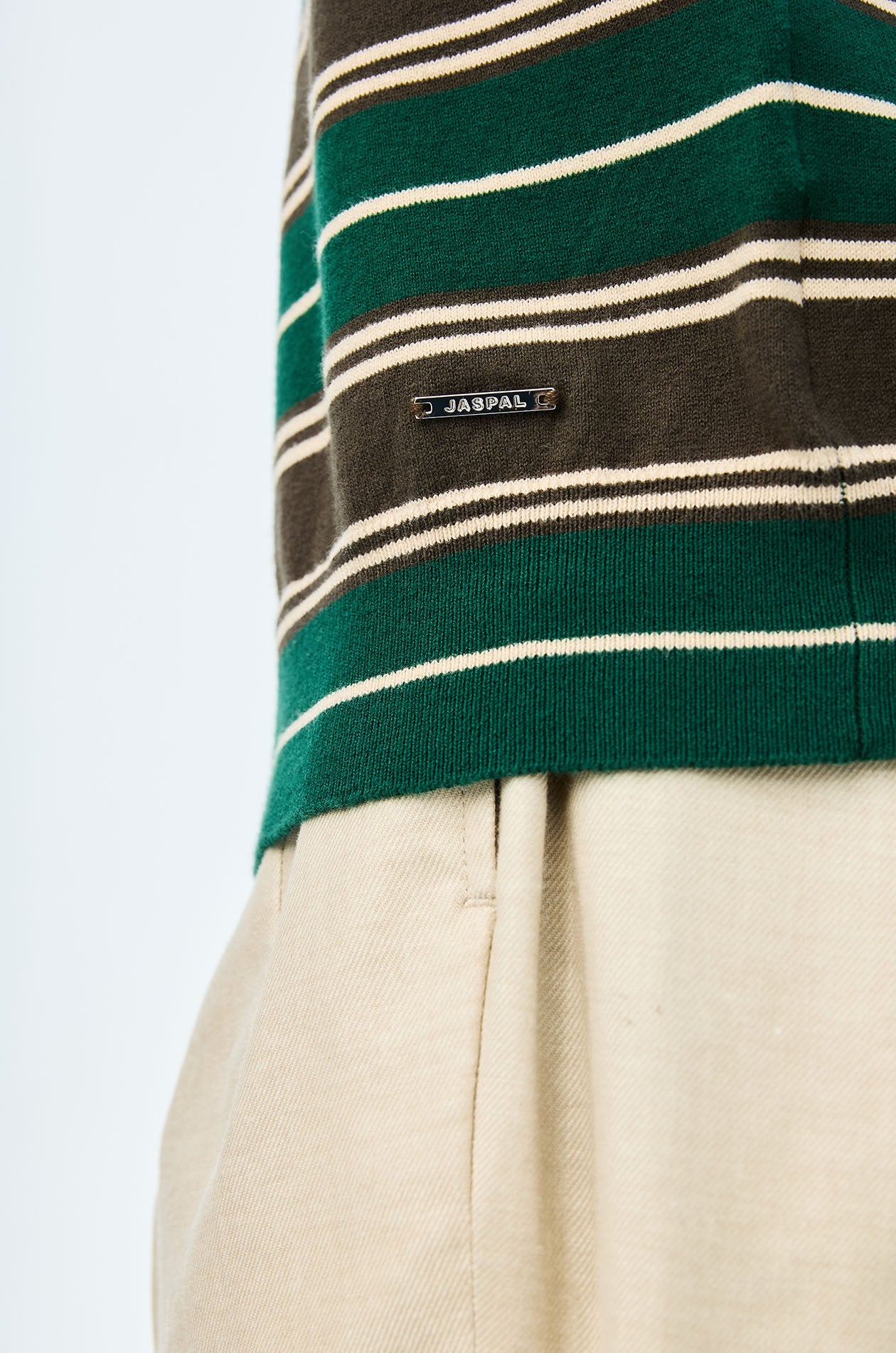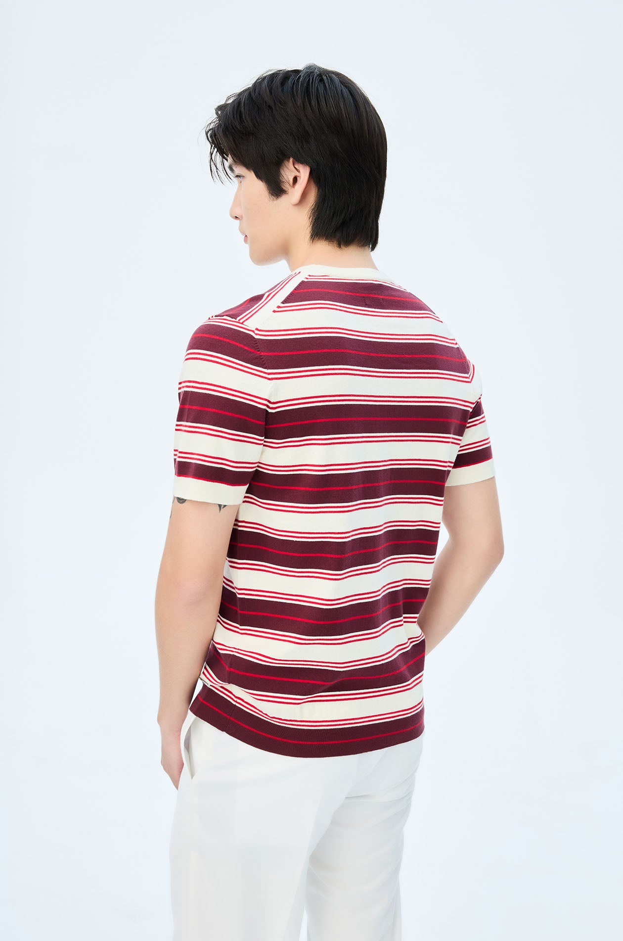 Short-sleeved T-shirt in fine knit fabric with stripes. Regular fit with round neckline. Available in black, dark green and beige.