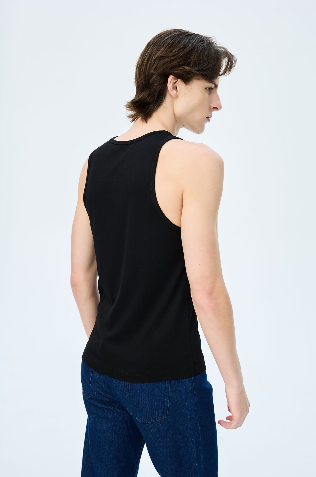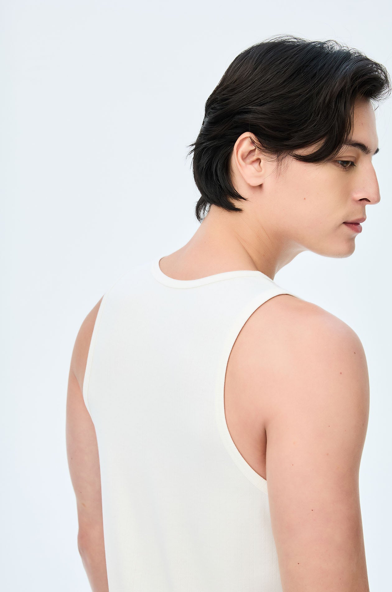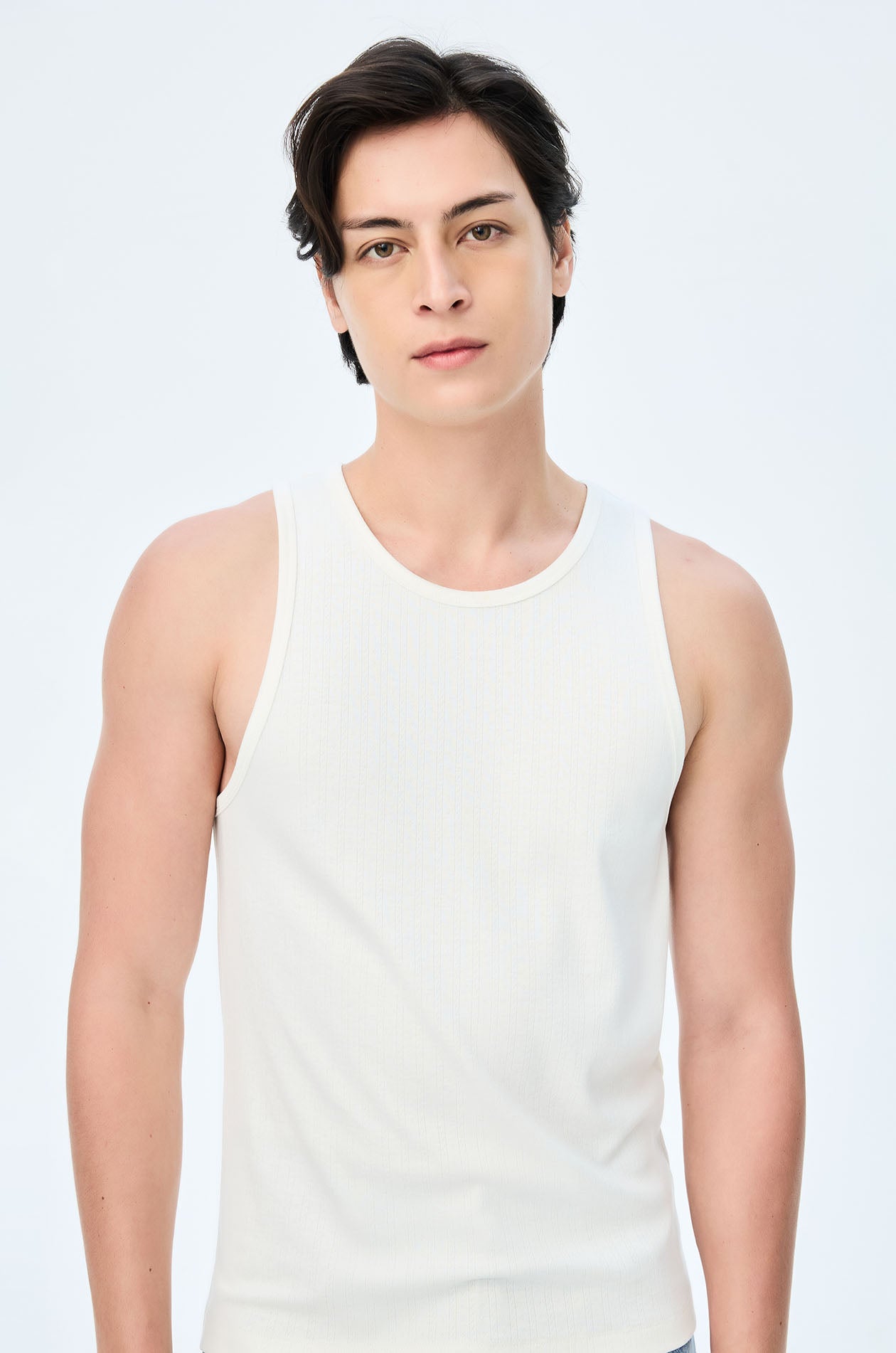 Round neck tank top in pointelle stripe knit fabric with striped pattern. Slim fit with retro design. Available in black and white.
