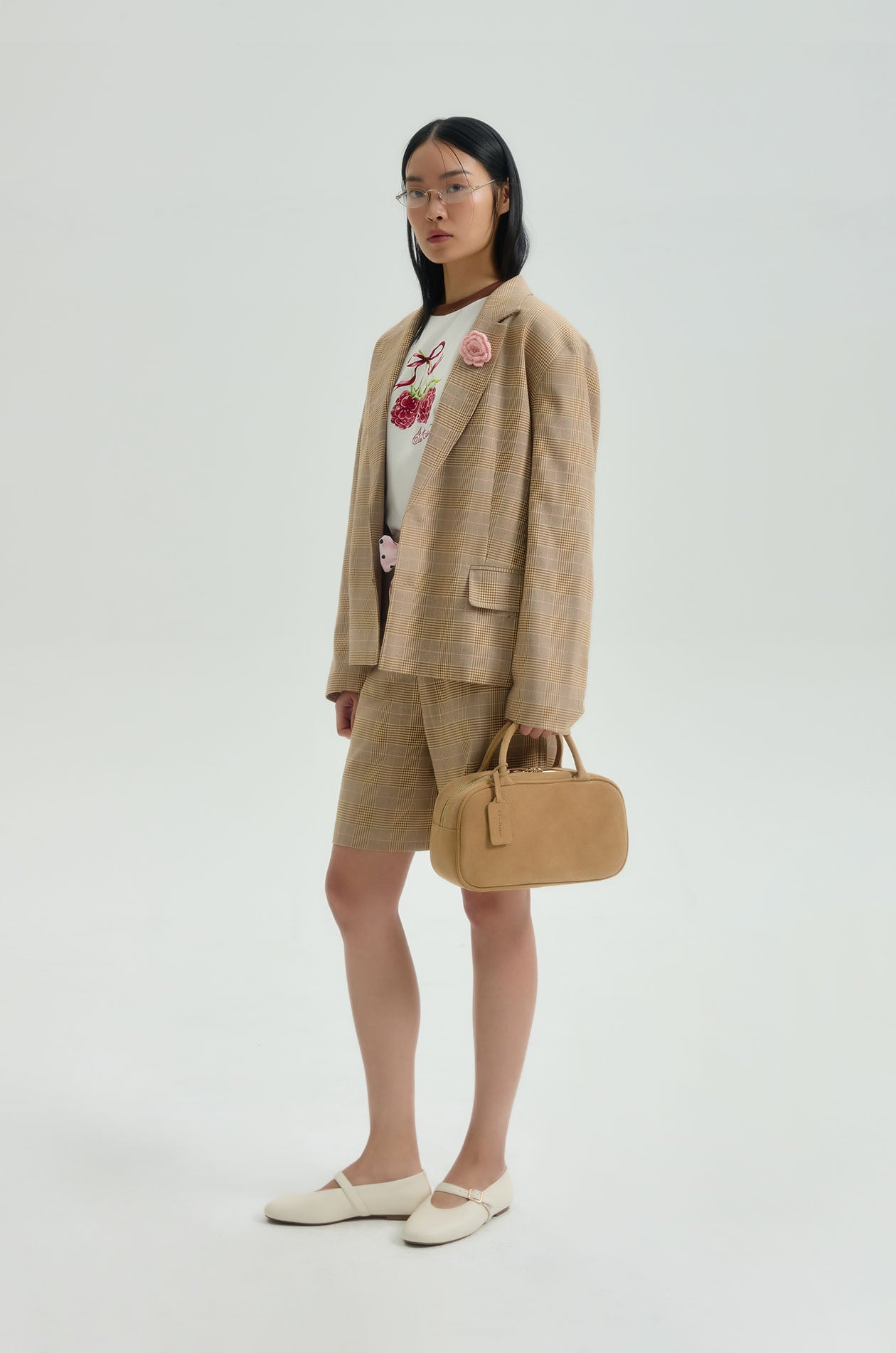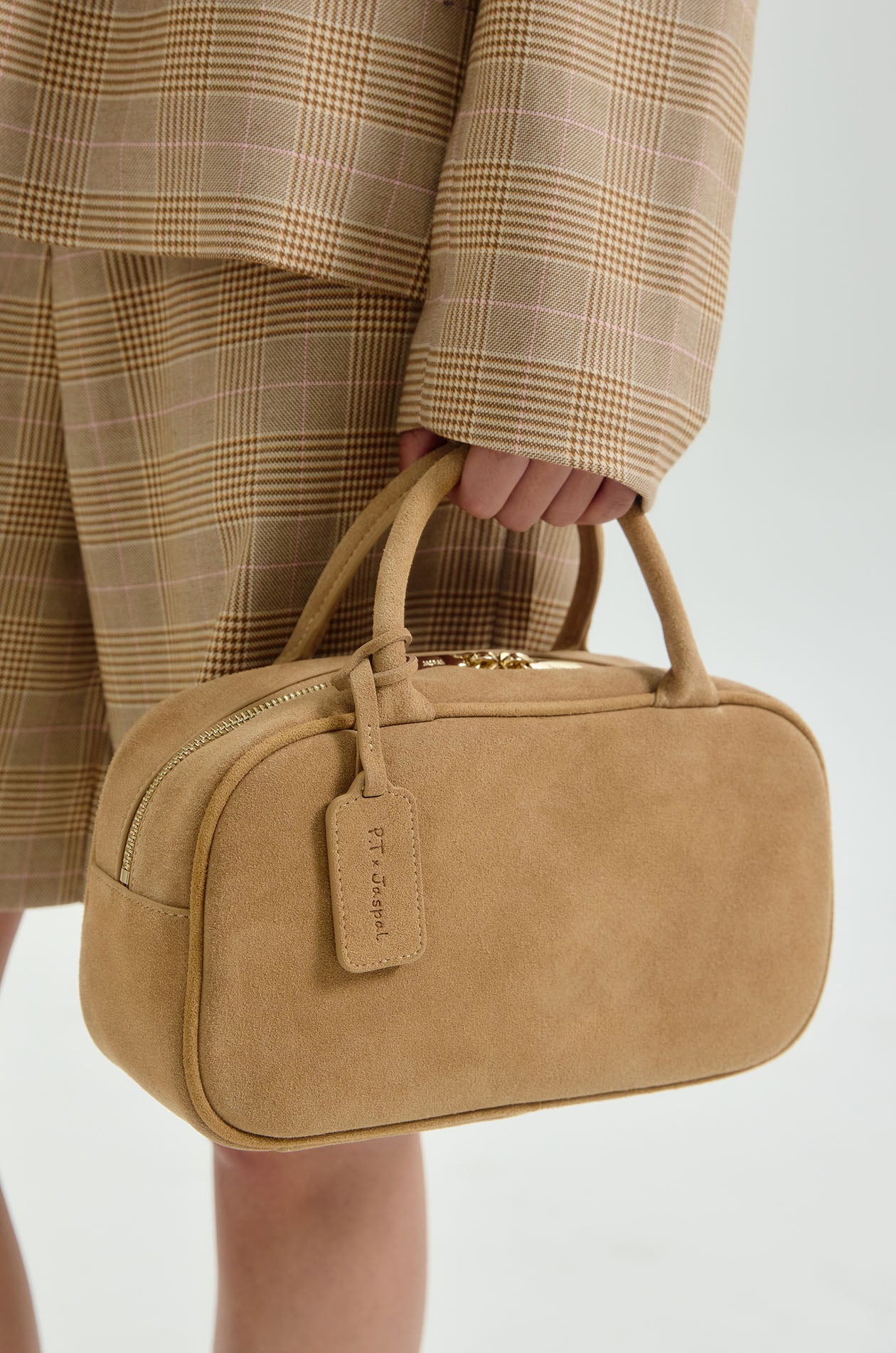 Jaspal The Edit x Proud & Tan | Handbag crafted from cow suede leather, featuring an east‑west design, a rounded rectangular shape, and structured top handles. Available in Tan.