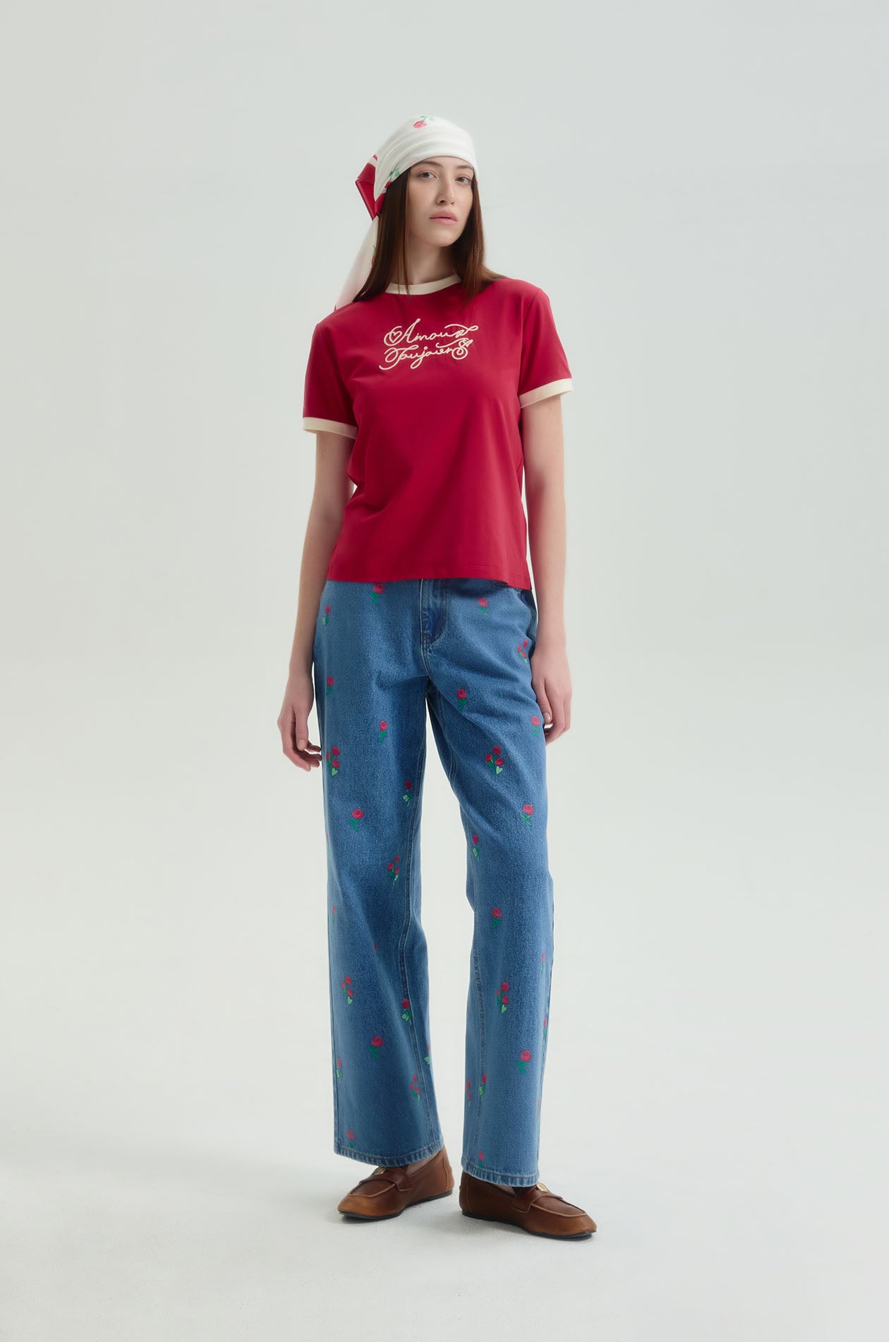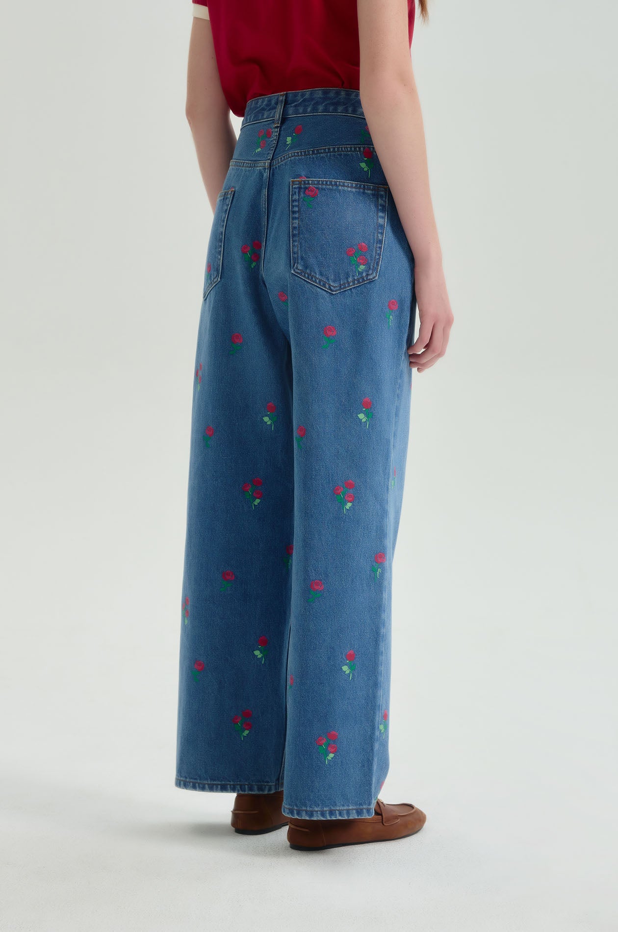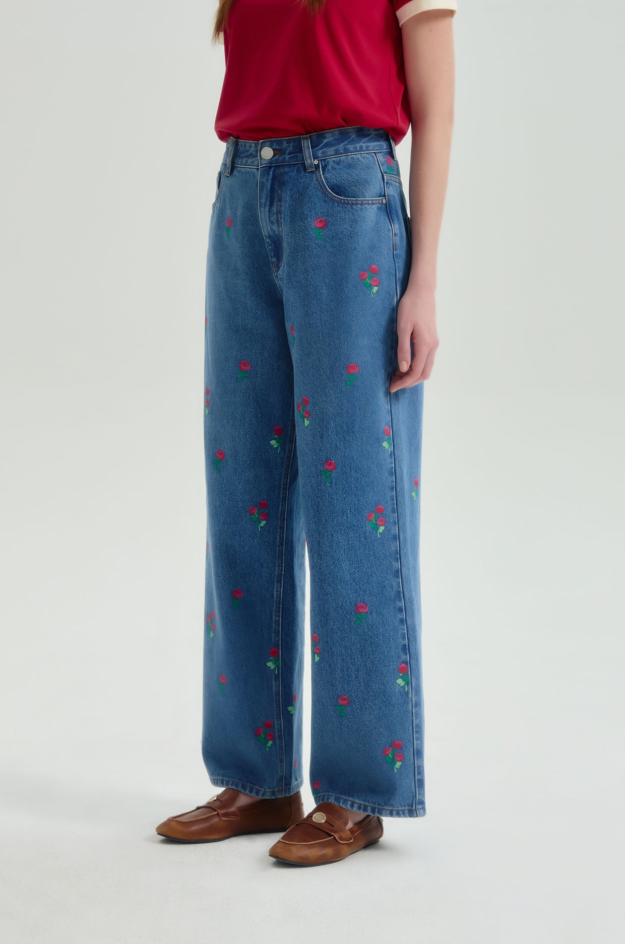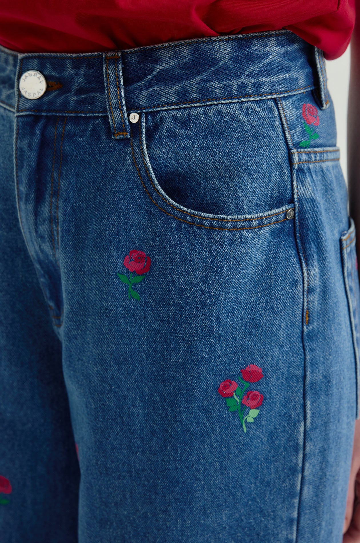 Jaspal The Edit x Proud & Tan | Mid-rise jeans in cotton denim. Boyfriend silhouette with five-pocket styling and ditsy rose print. Front button and zip closure. Available in blue.