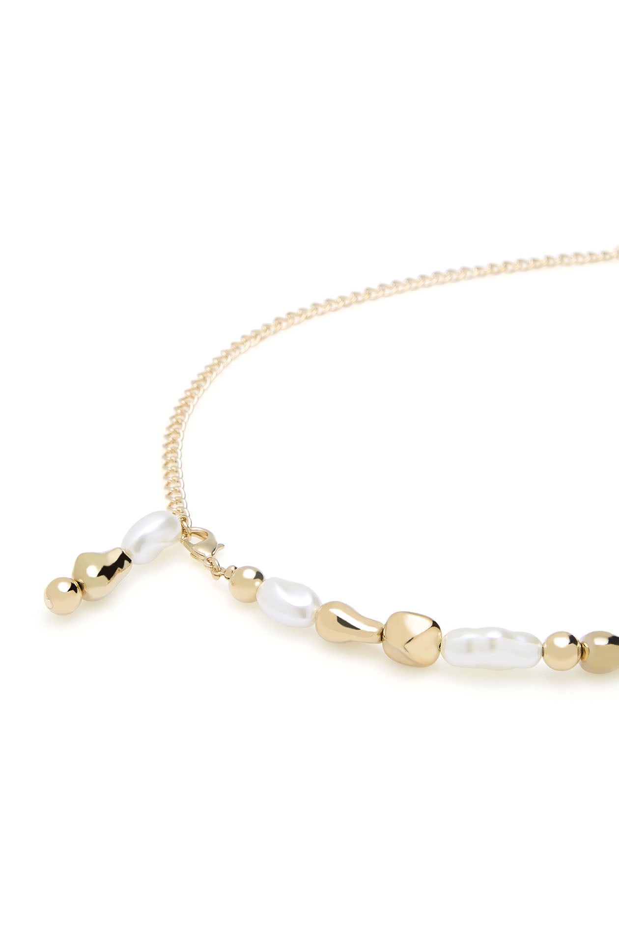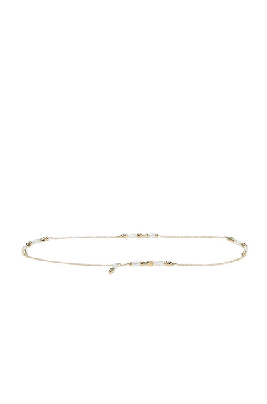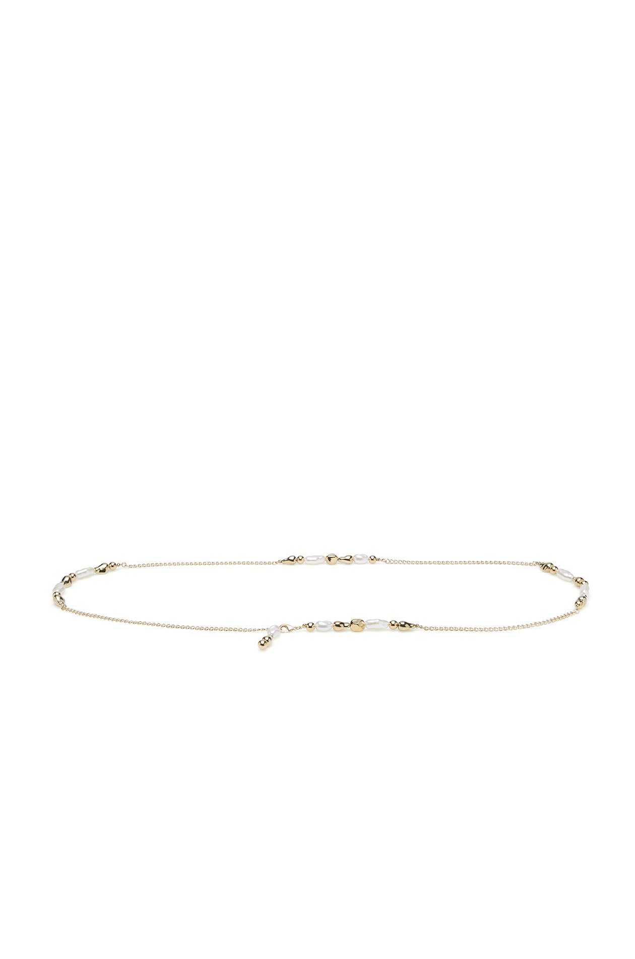 Skinny chain belt crafted from metal, featuring pearl beads and gold-tone metal accents. Lobster claw closure. Available in gold.