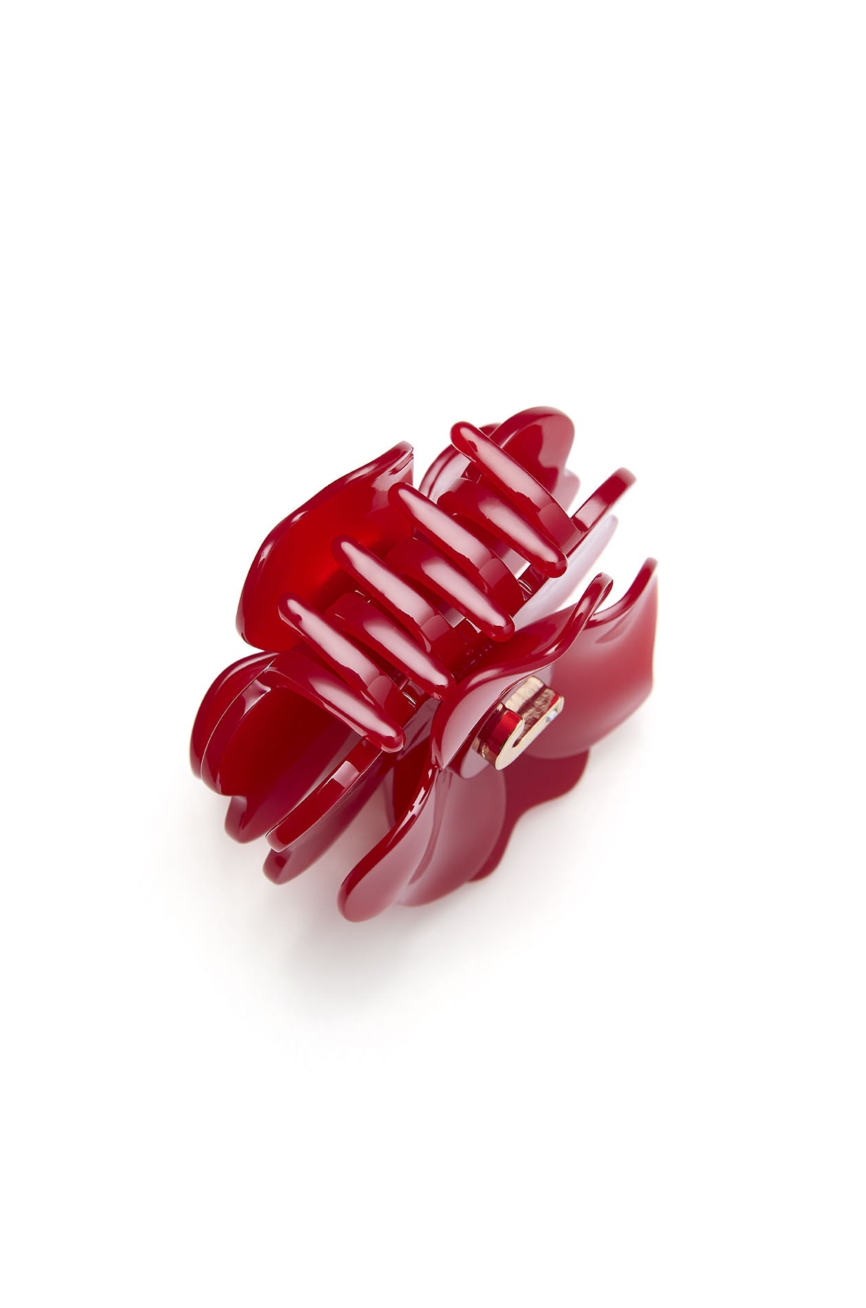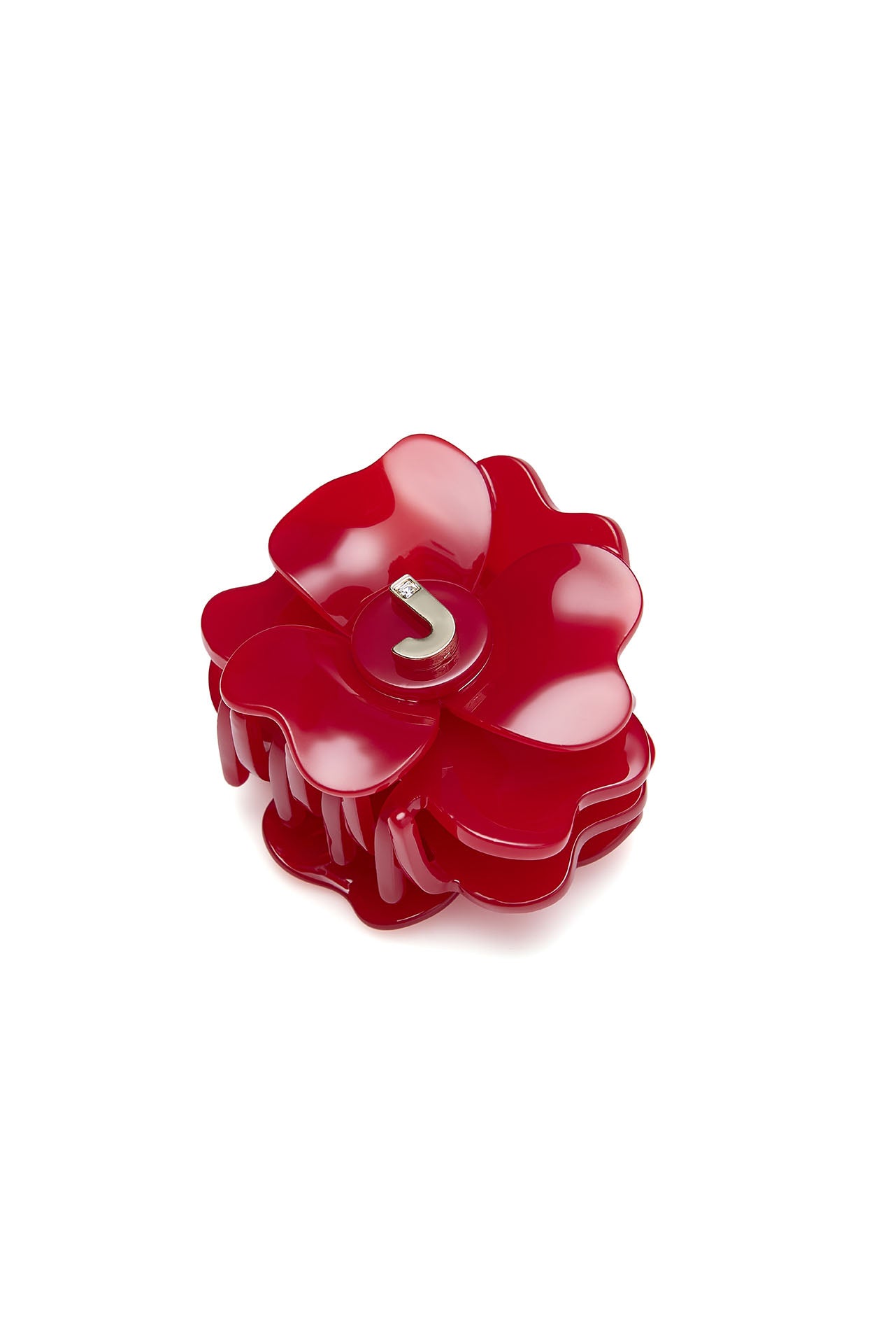 Hair claw clip made of acrylic, featuring a flower shape with heart-shaped petals and 'J' logo. Available in pink.