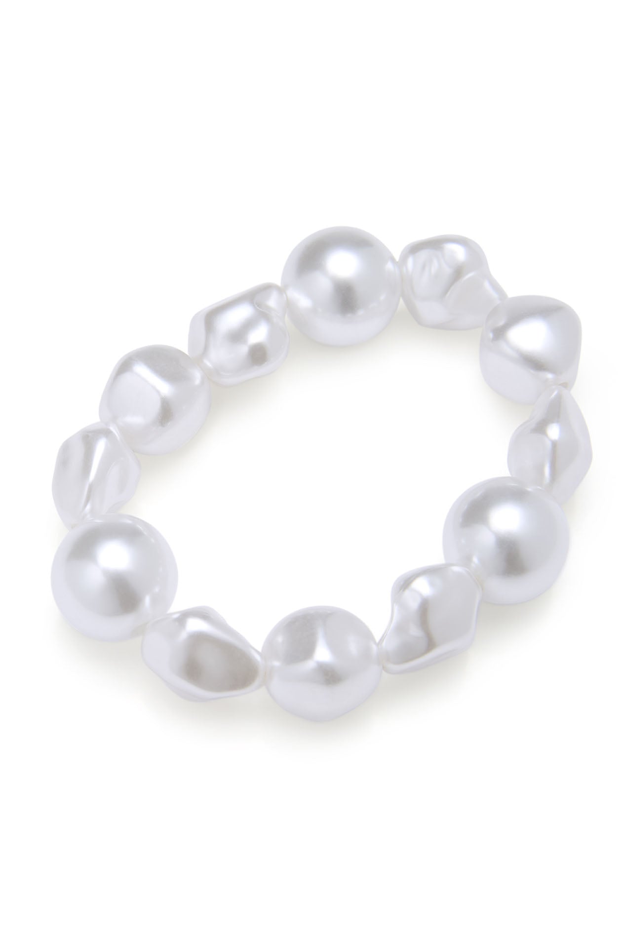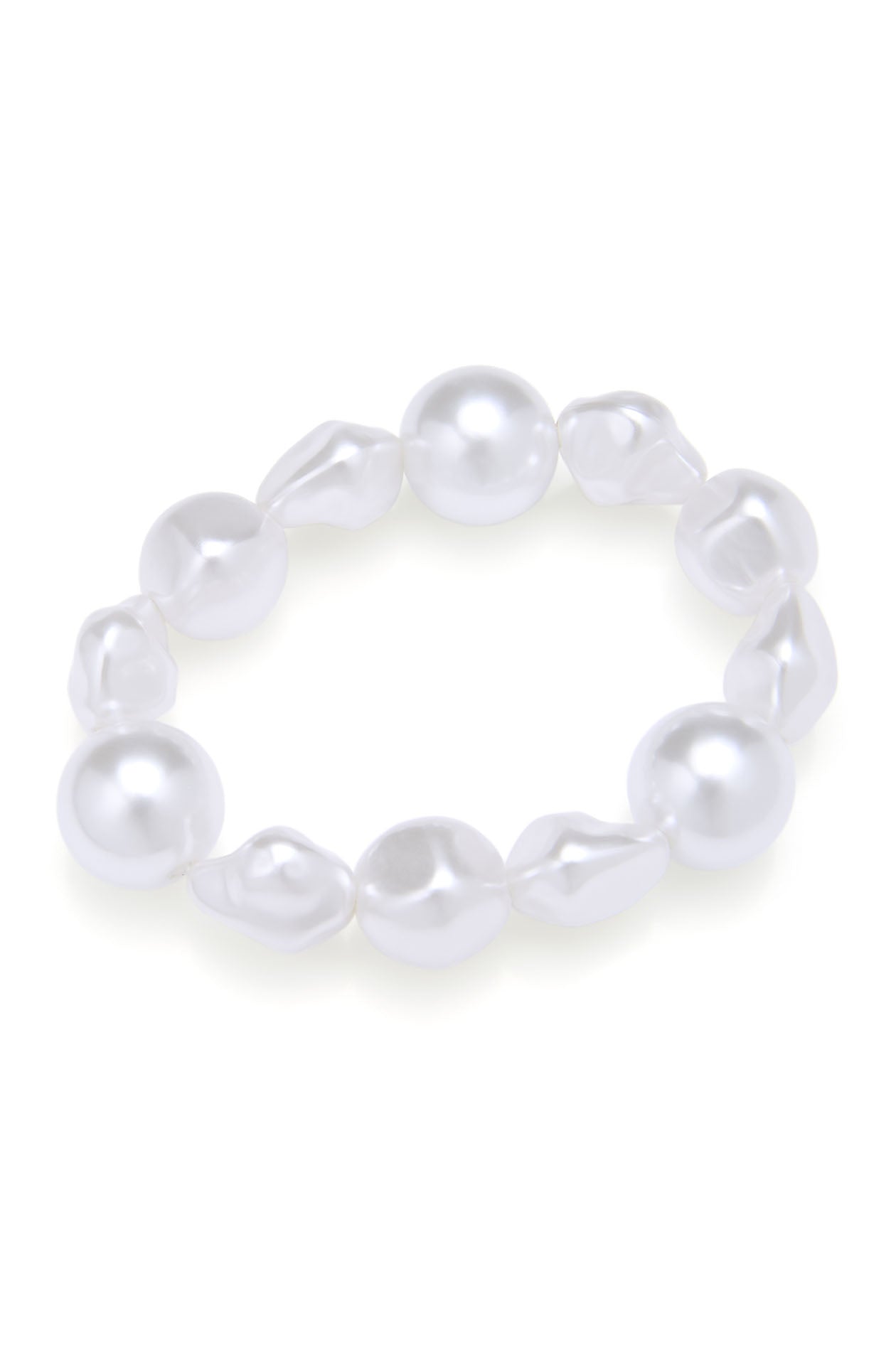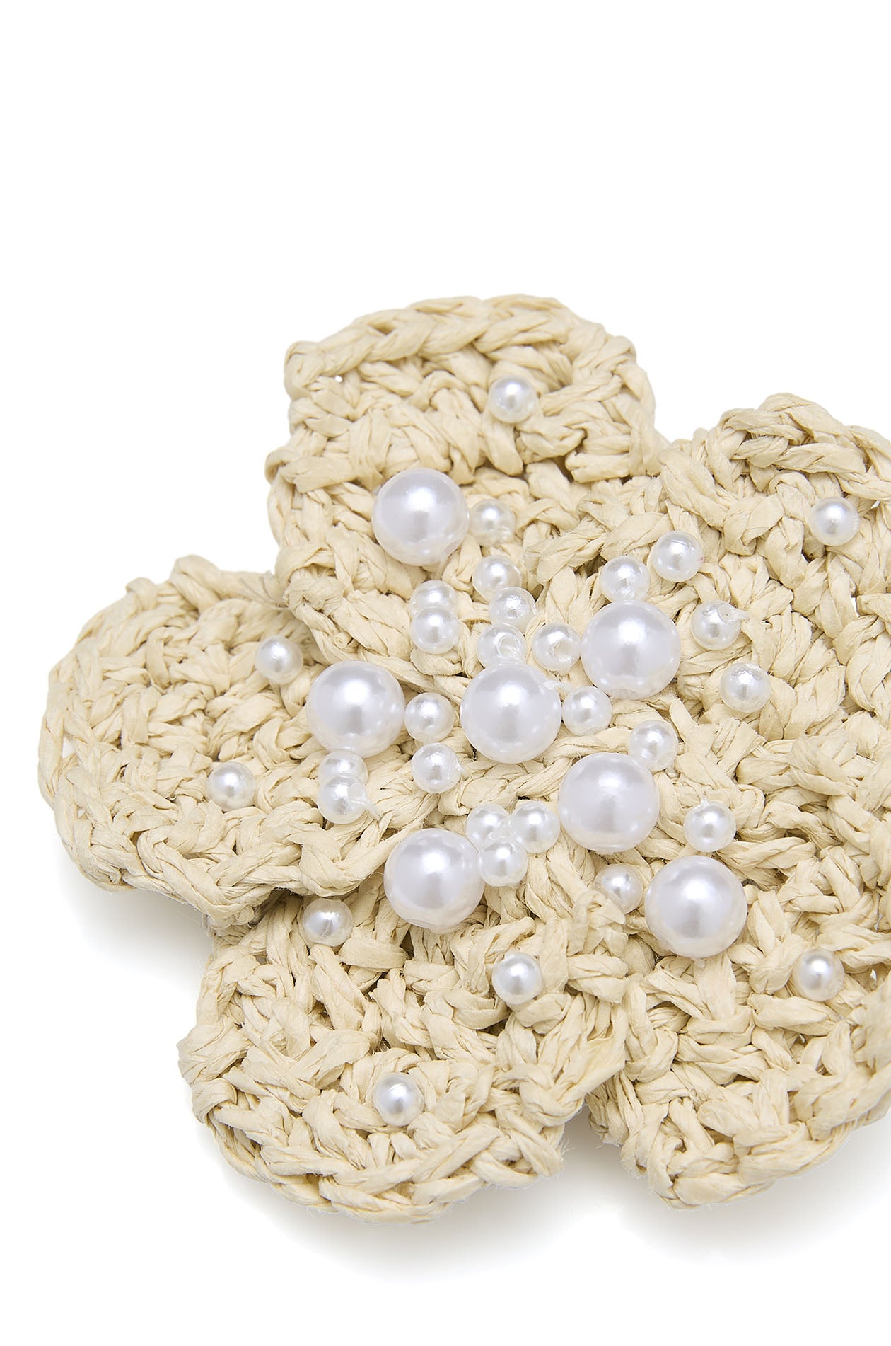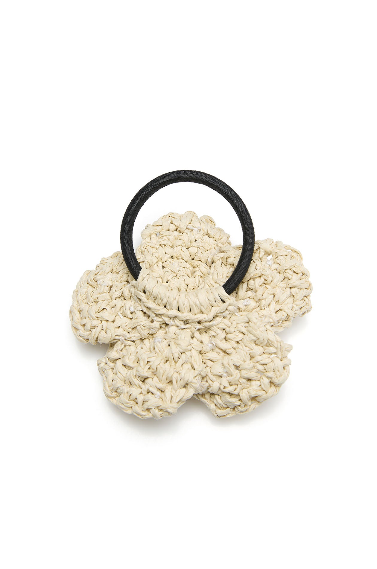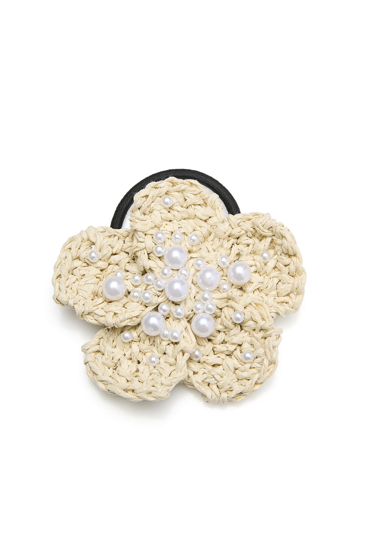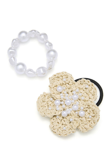 Set of elastic hair tie, including a crochet flower adorned with pearl beads and another hair tie with multi-size pearl beads. Available in beige and off-white.
