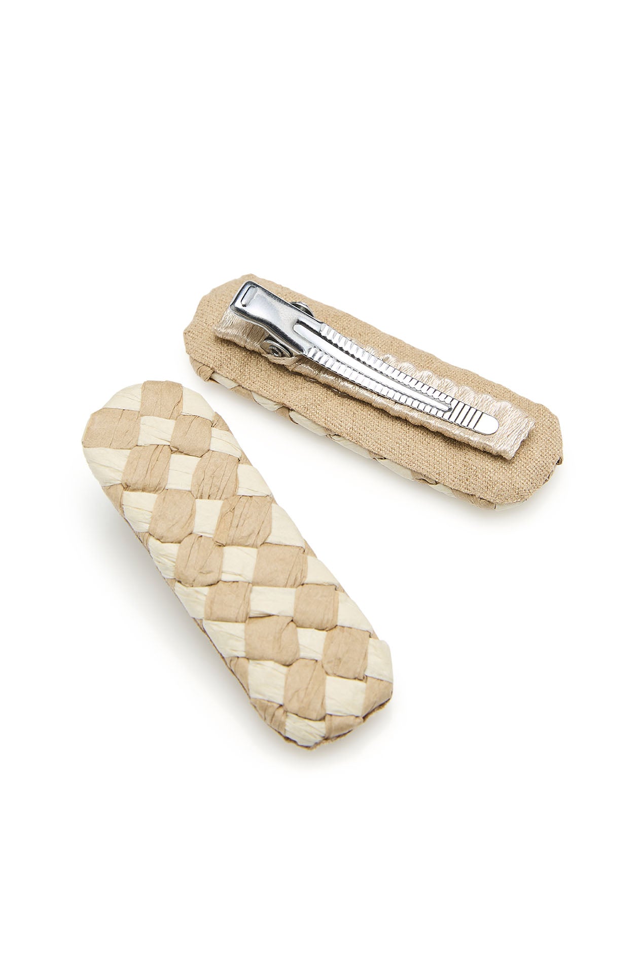 Hair clip set crafted from fabric, featuring a rounded rectangular shape and a two-tone interlaced design. Available in cream/beige.