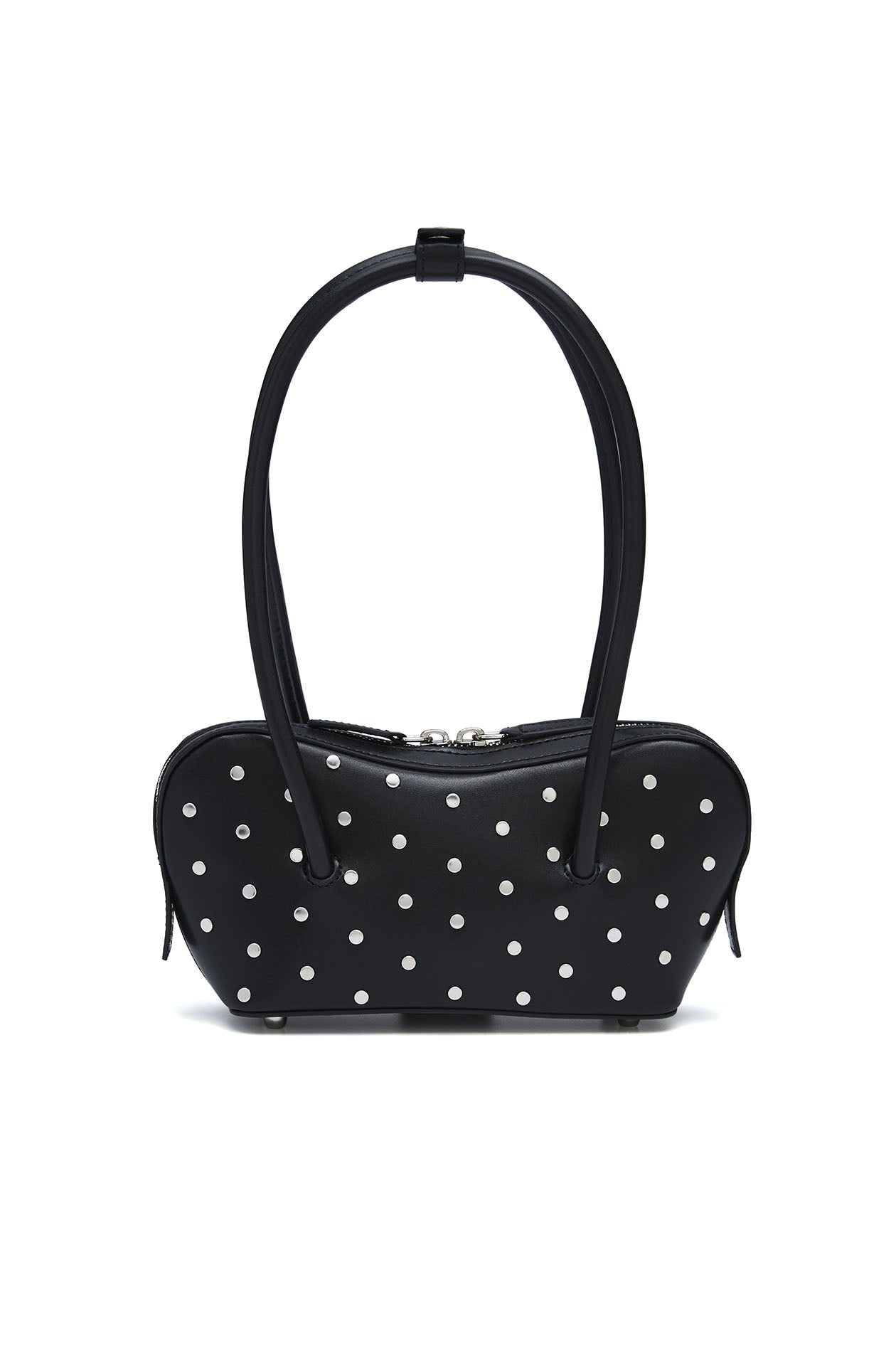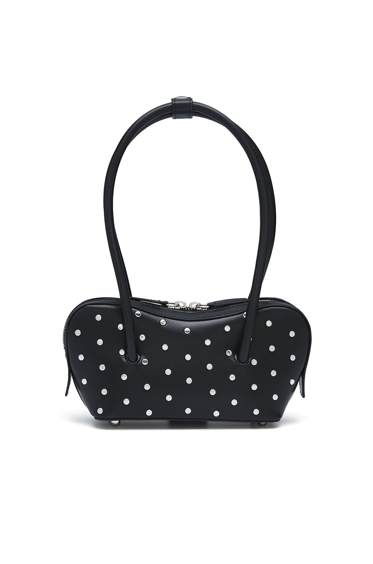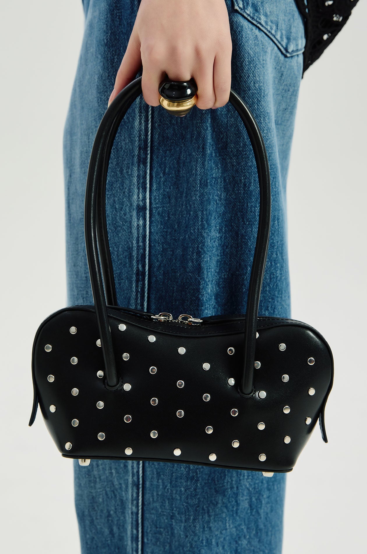 Baguette bag crafted from cow leather with metal stud embellishment, featuring a heart-shaped design and structured shoulder straps. Available in black.
