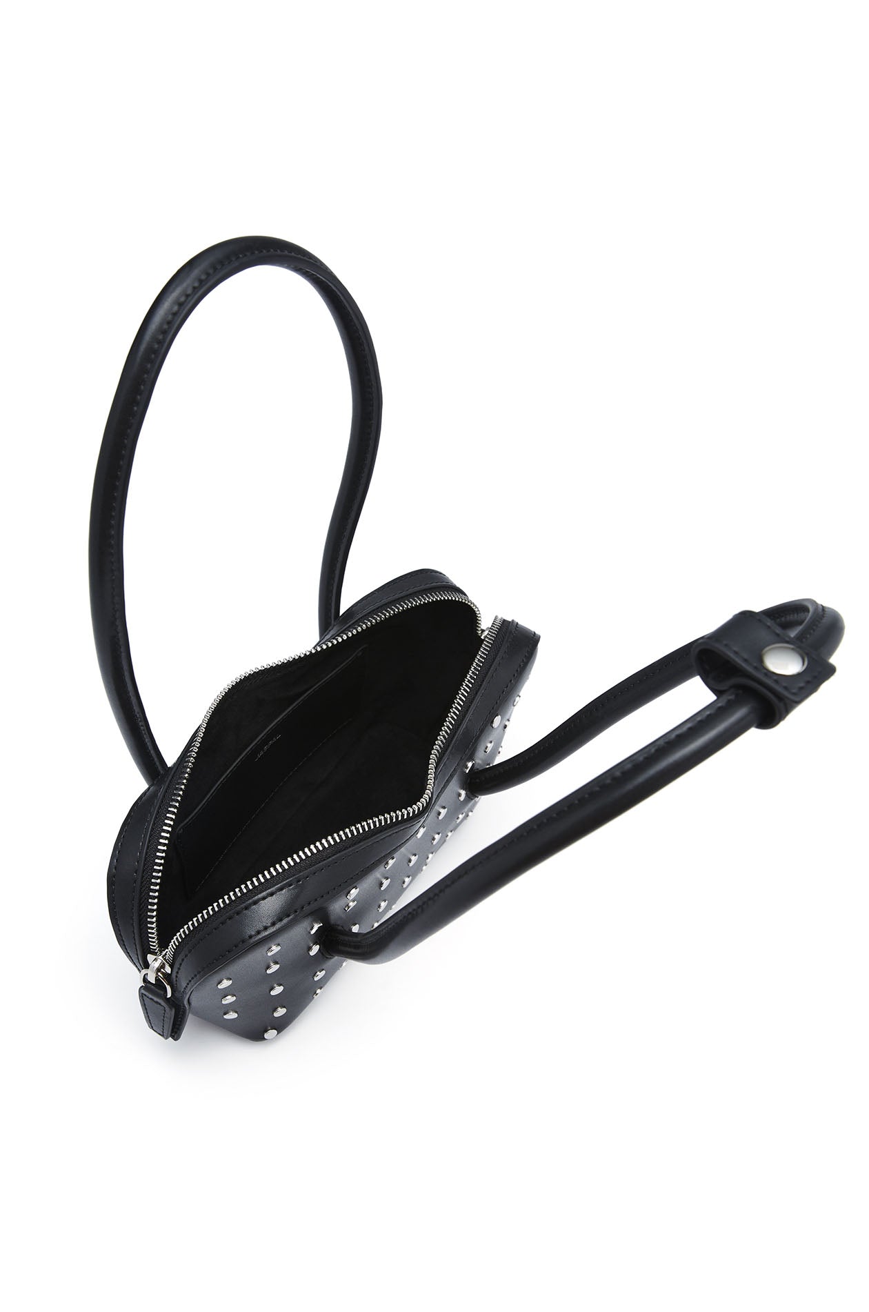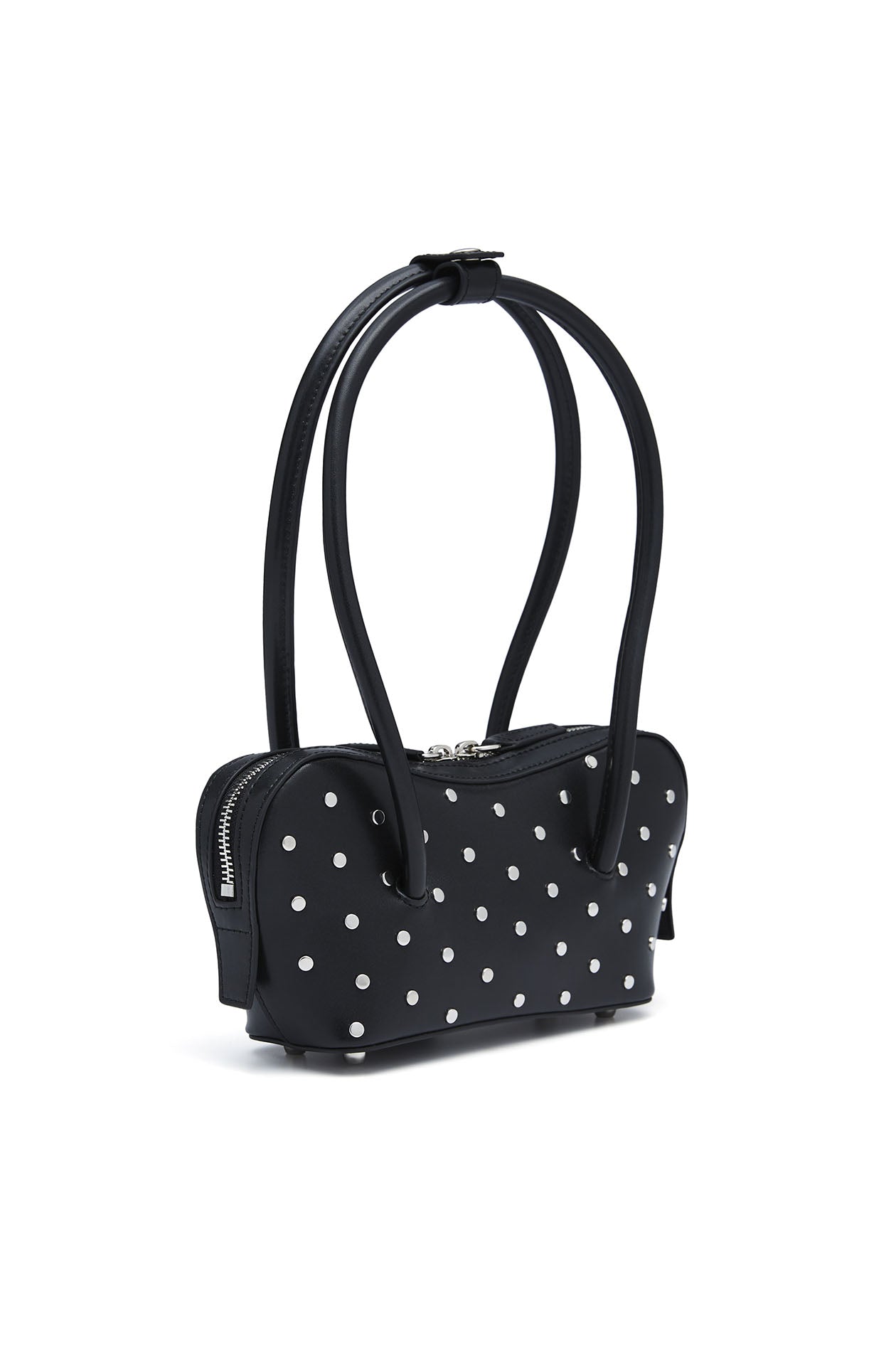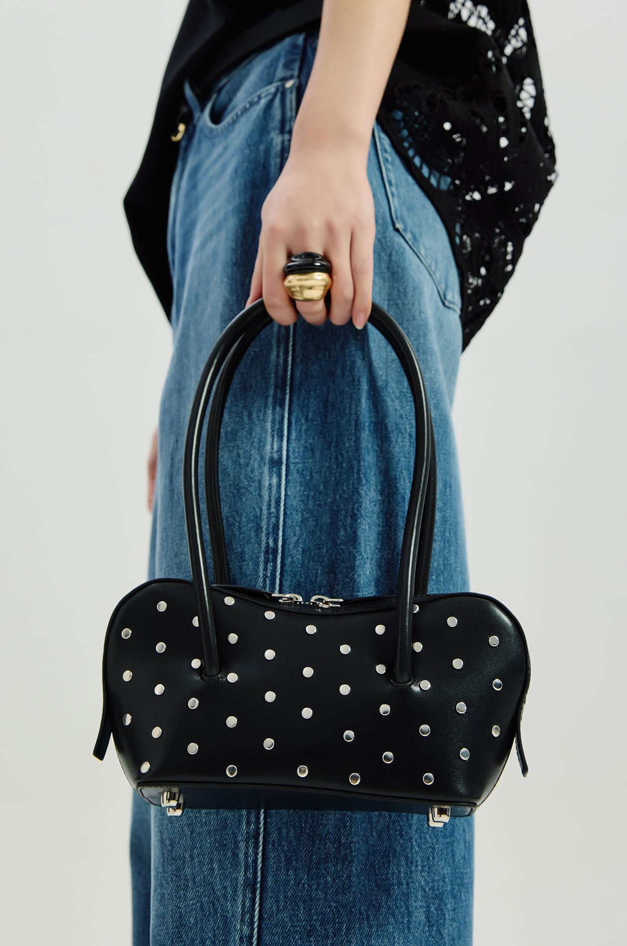 Baguette bag crafted from cow leather with metal stud embellishment, featuring a heart-shaped design and structured shoulder straps. Available in black.