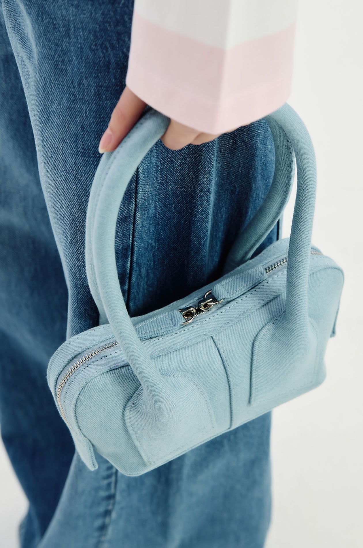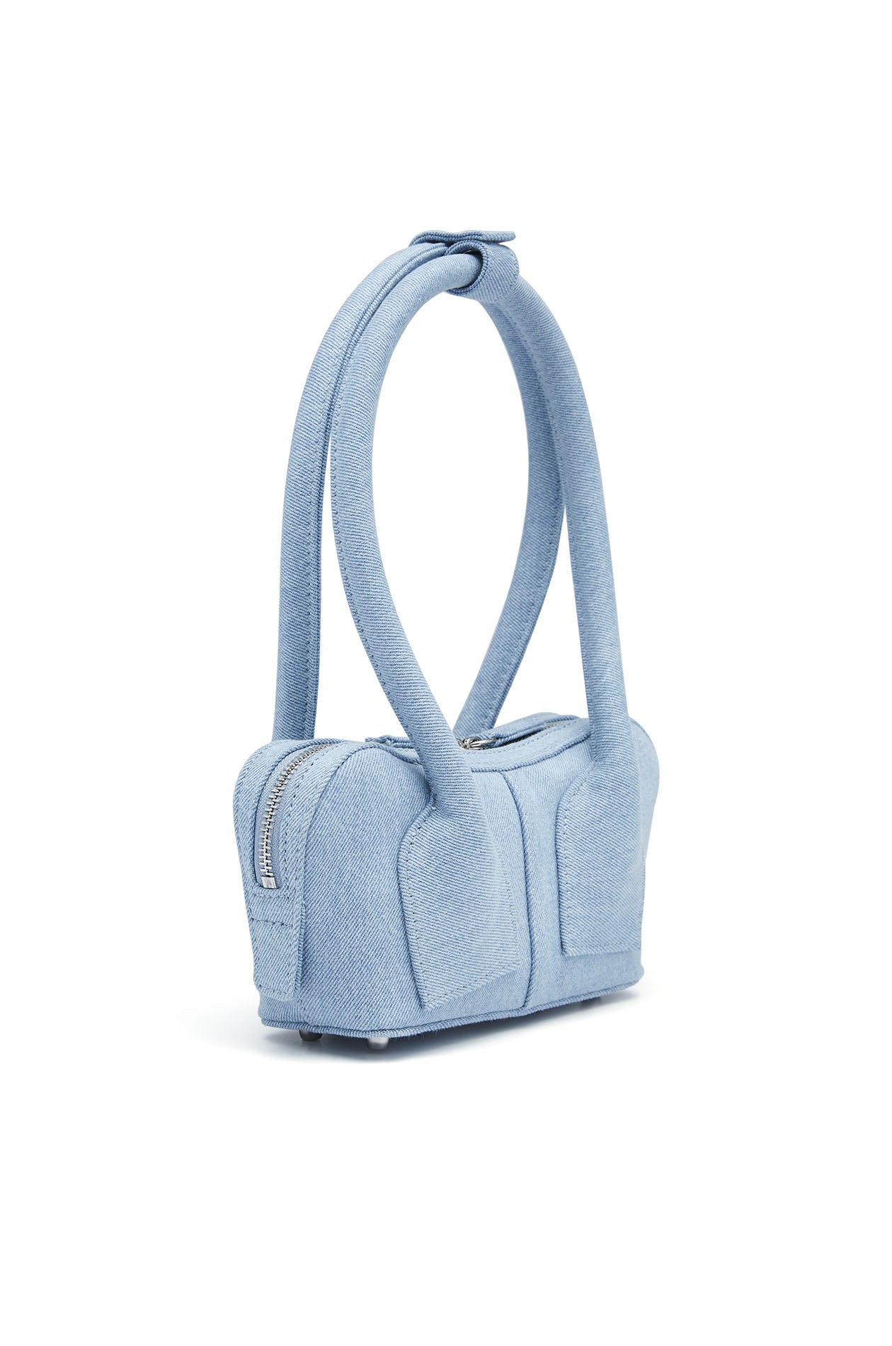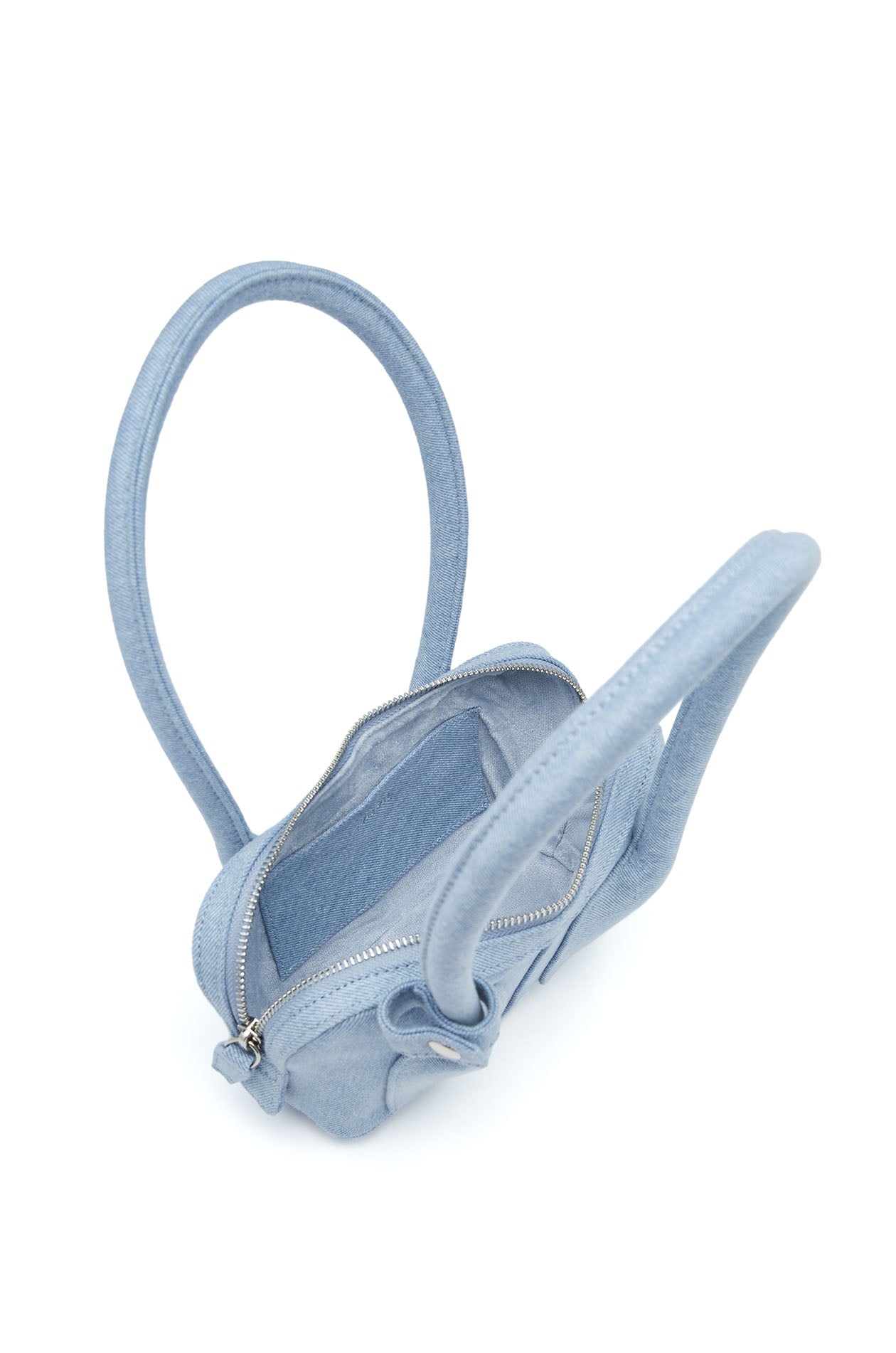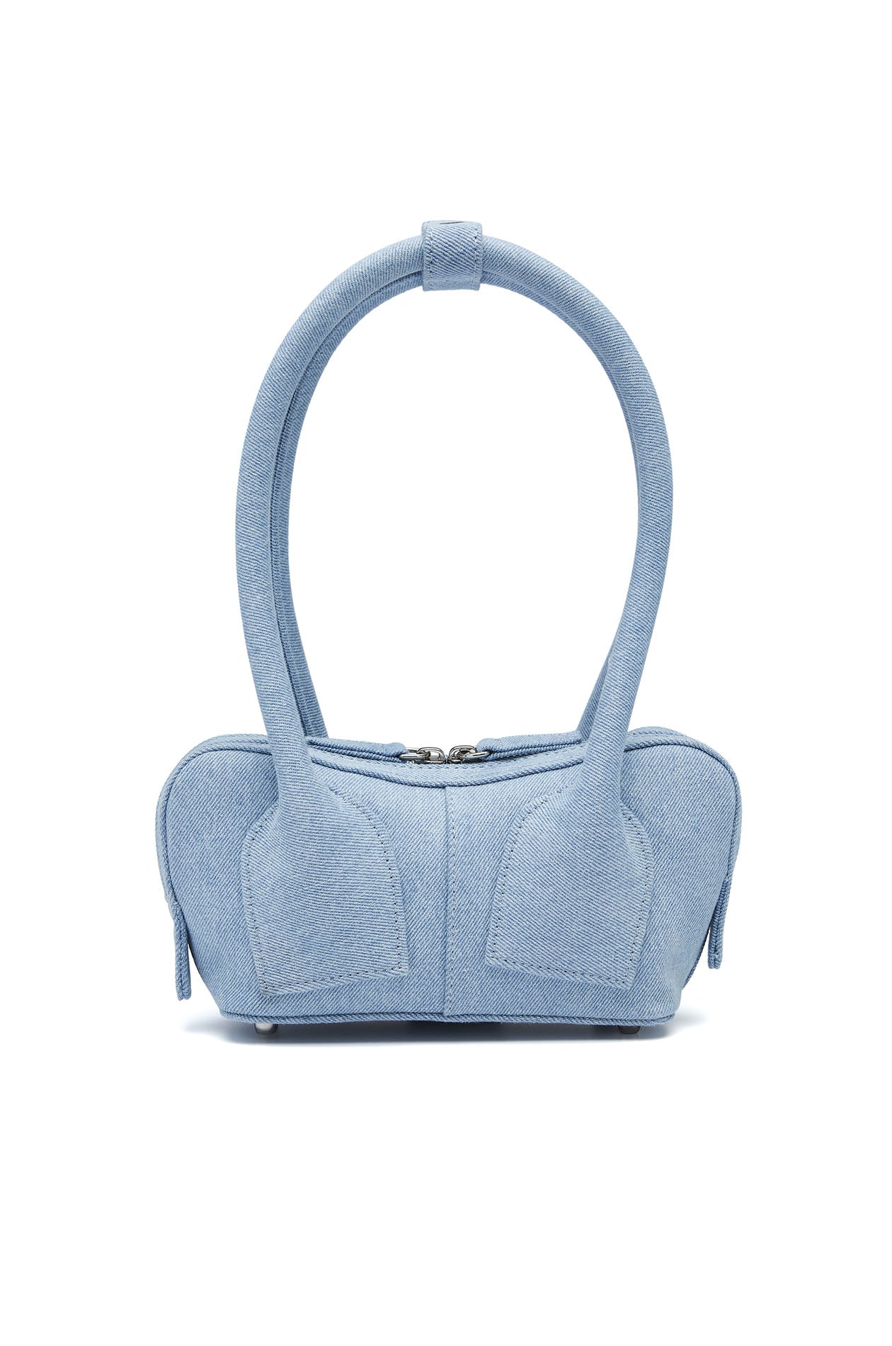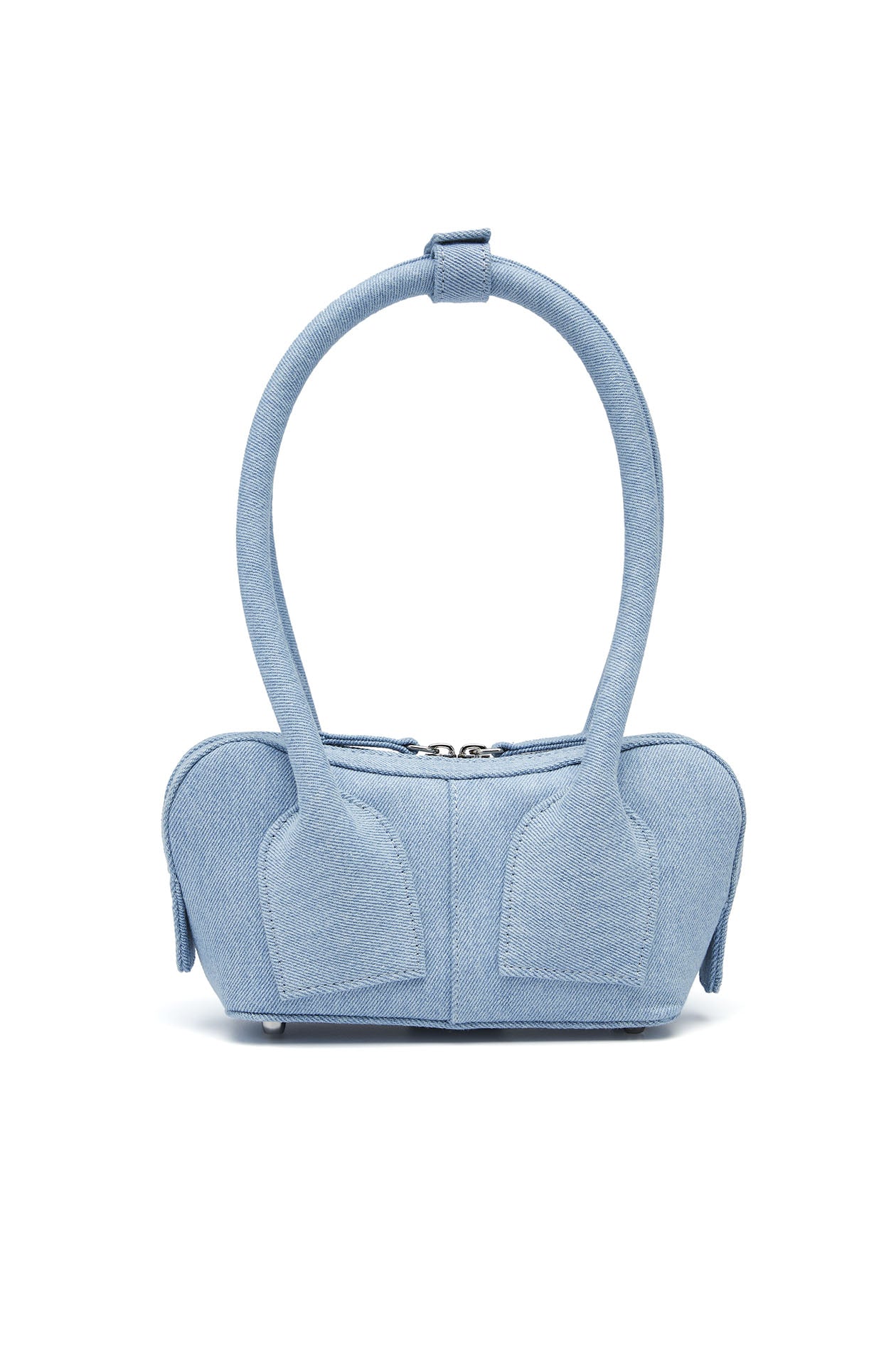 Baguette bag crafted from denim, featuring a heart-shaped design and structured shoulder straps. Available in blue.