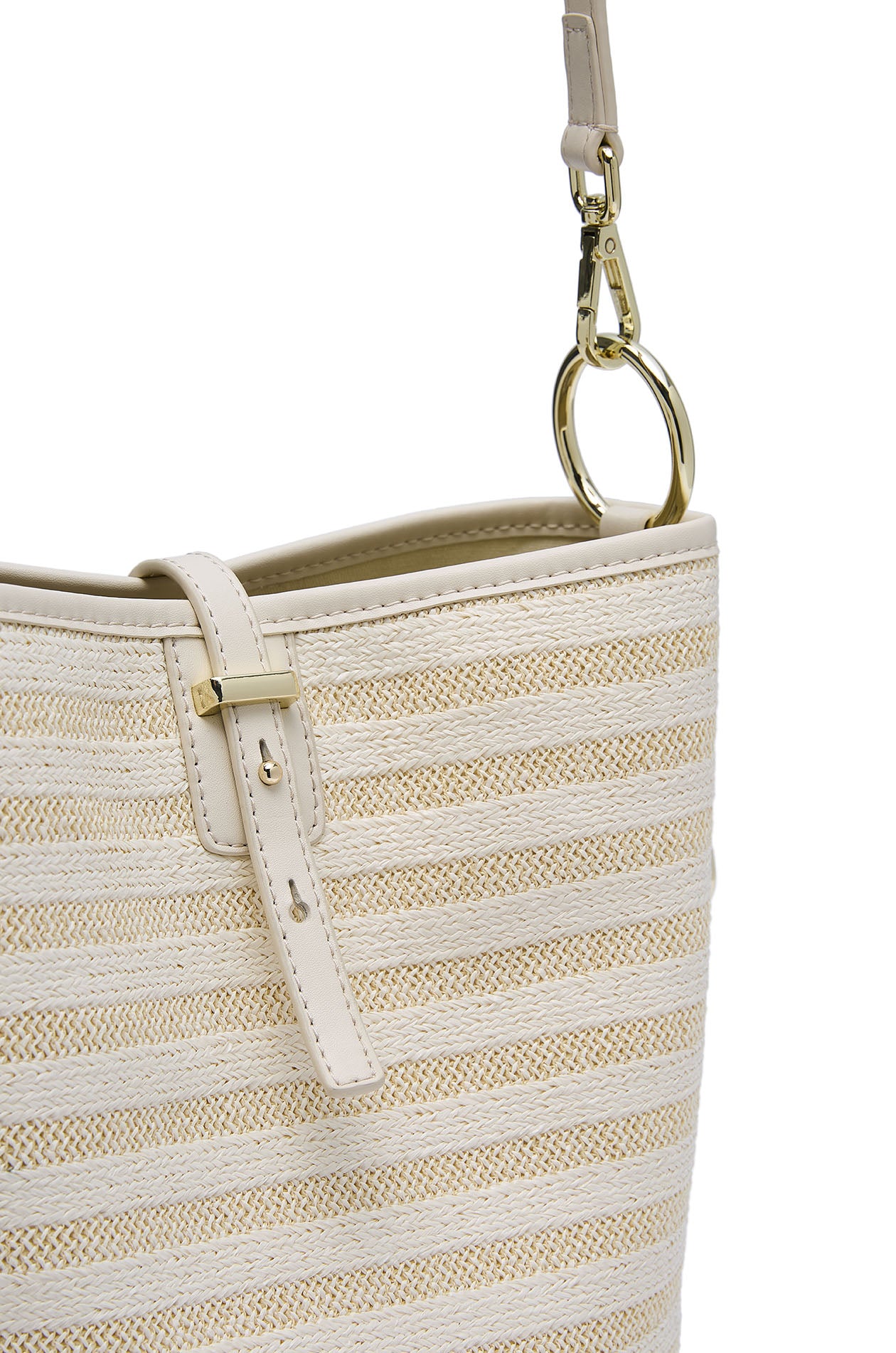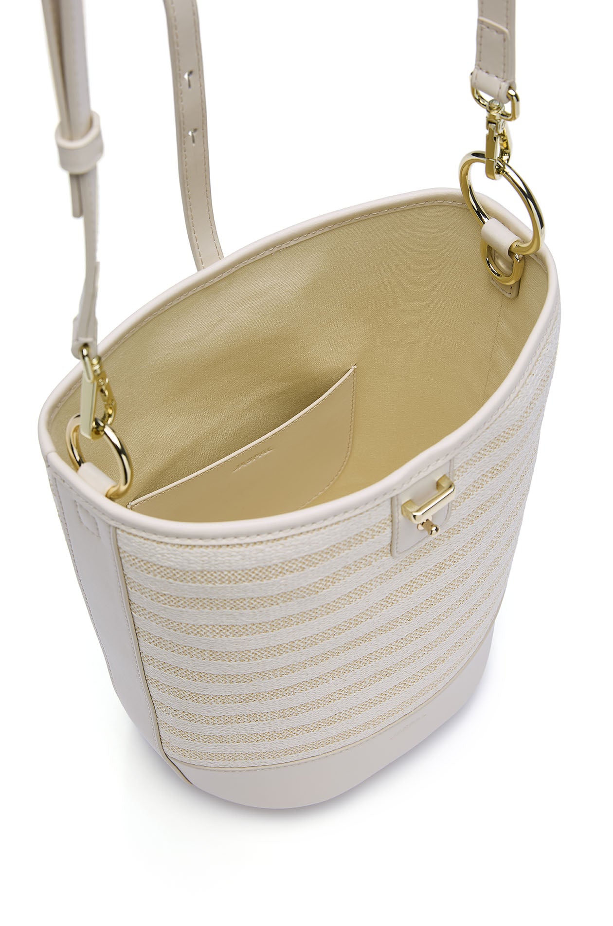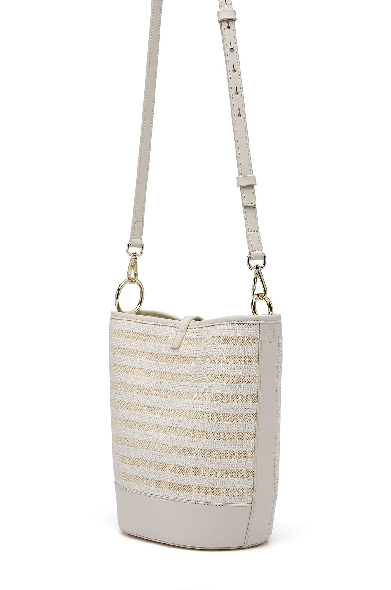 Bucket bag in cow leather and faux raffia, featuring striped detailing, an unstructured design, and an adjustable shoulder strap. Available in off-white and black.