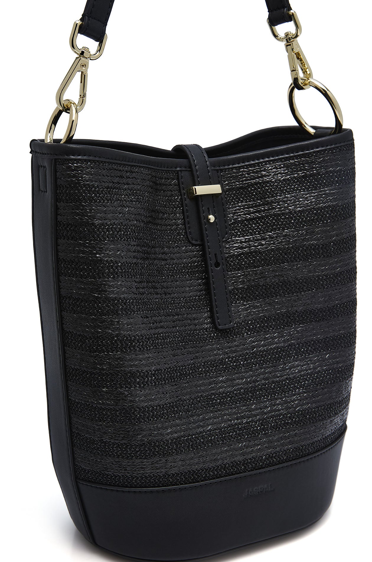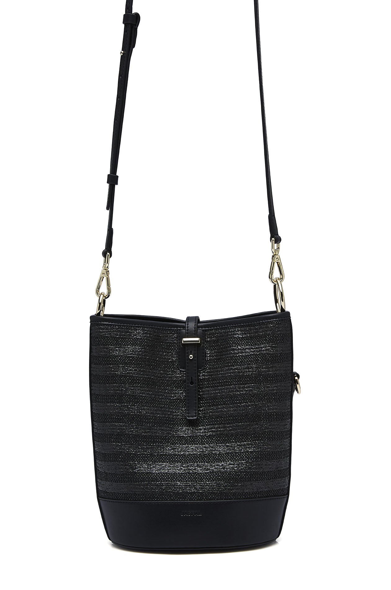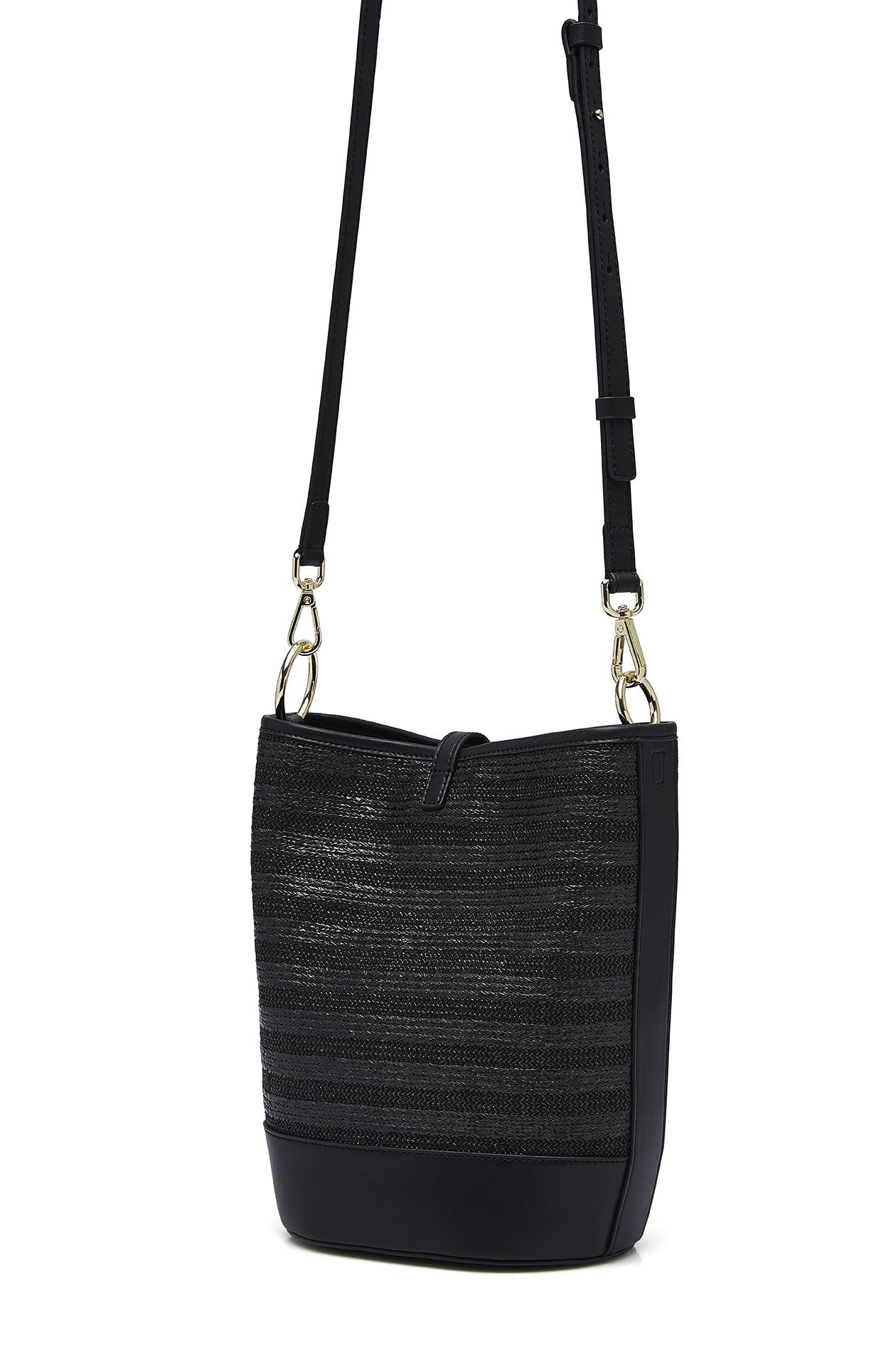 Bucket bag in cow leather and faux raffia, featuring striped detailing, an unstructured design, and an adjustable shoulder strap. Available in off-white and black.