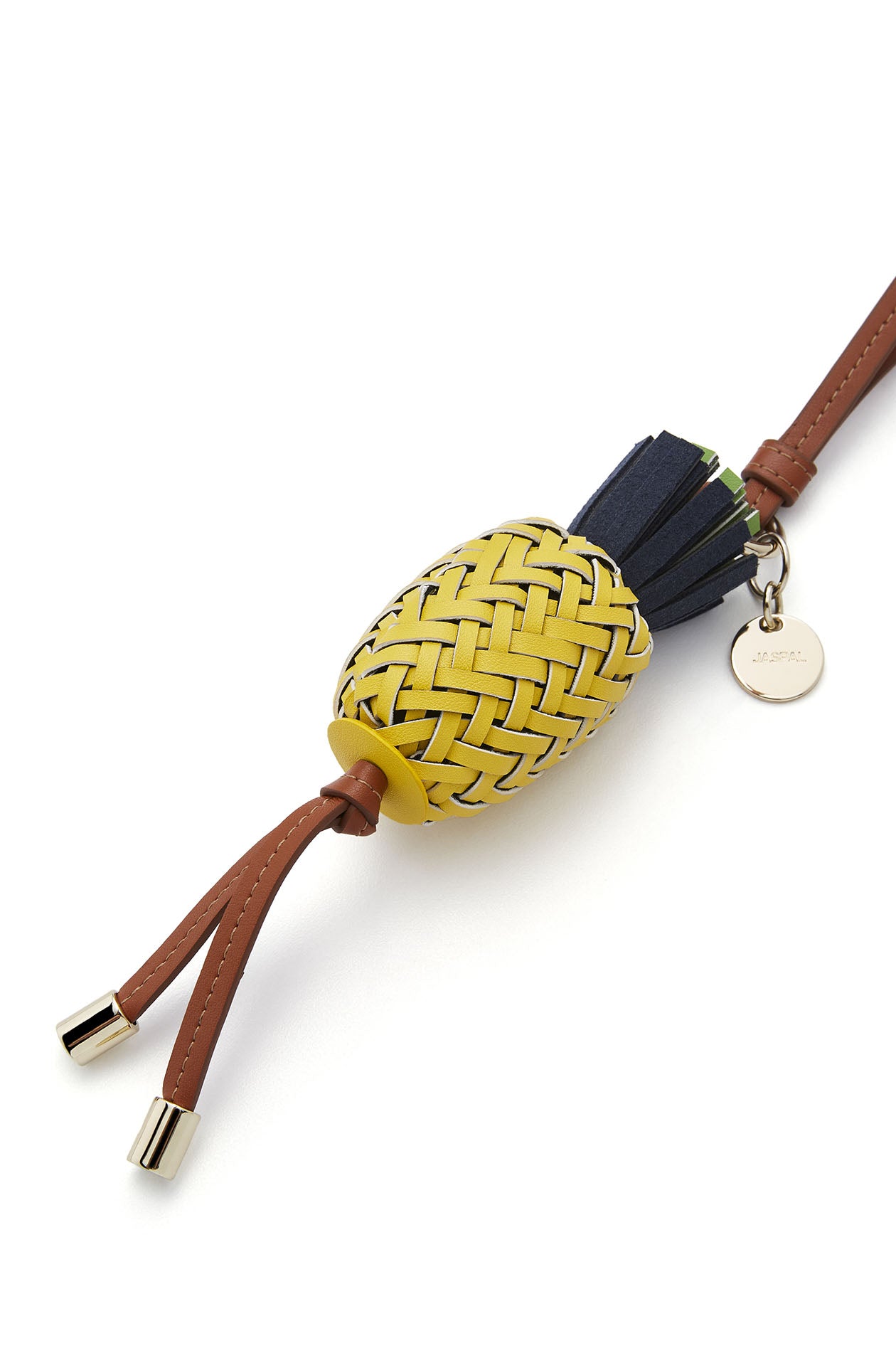 Charm crafted from faux leather for a lightweight yet durable feel. Designed in a playful pineapple silhouette with textured panel detailing and a contrasting leaf top for added dimension. Finished with a slim strap and metal ring attachment for easy clipping onto bags, keys, or pouches. Available in yellow.