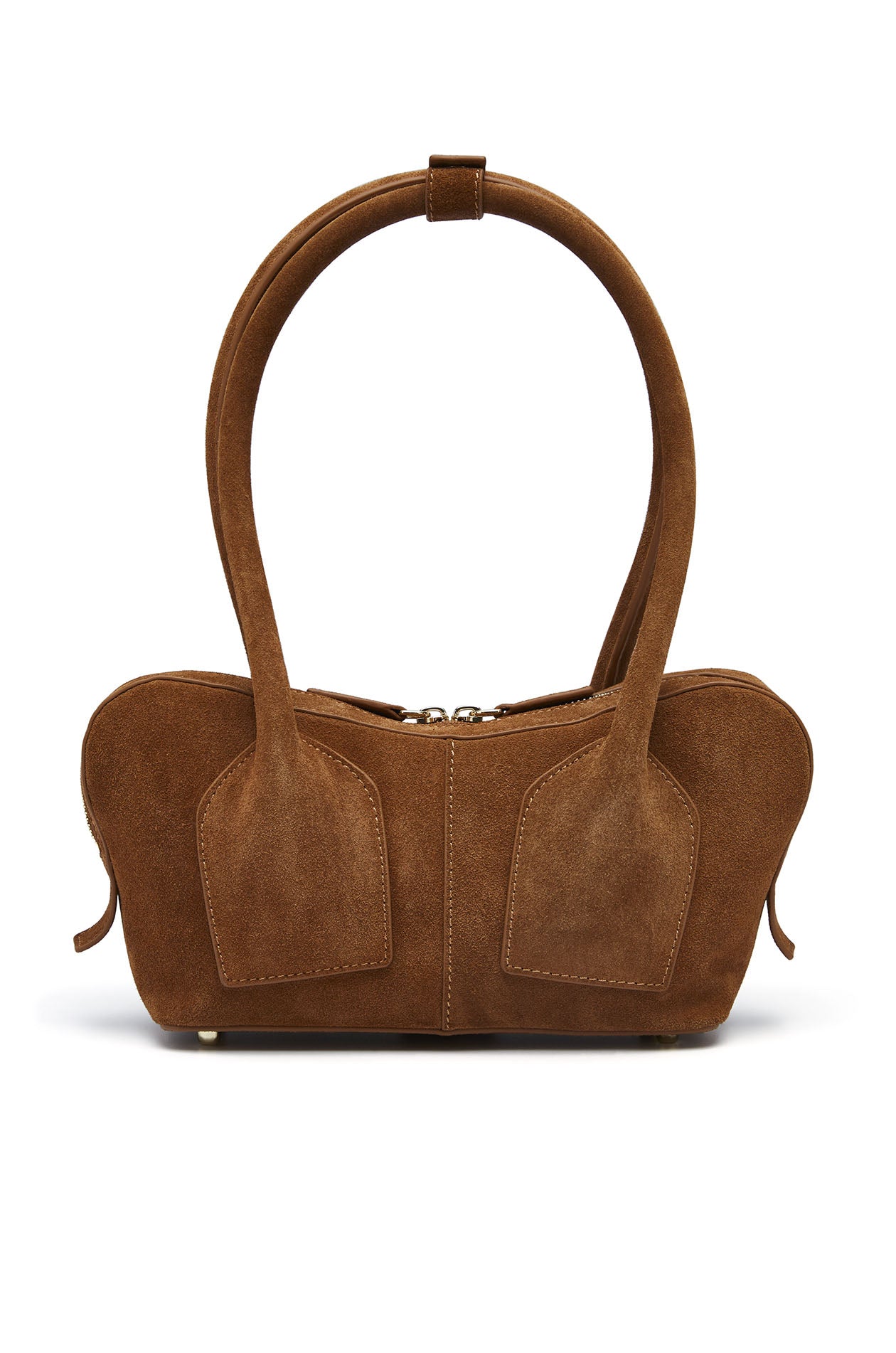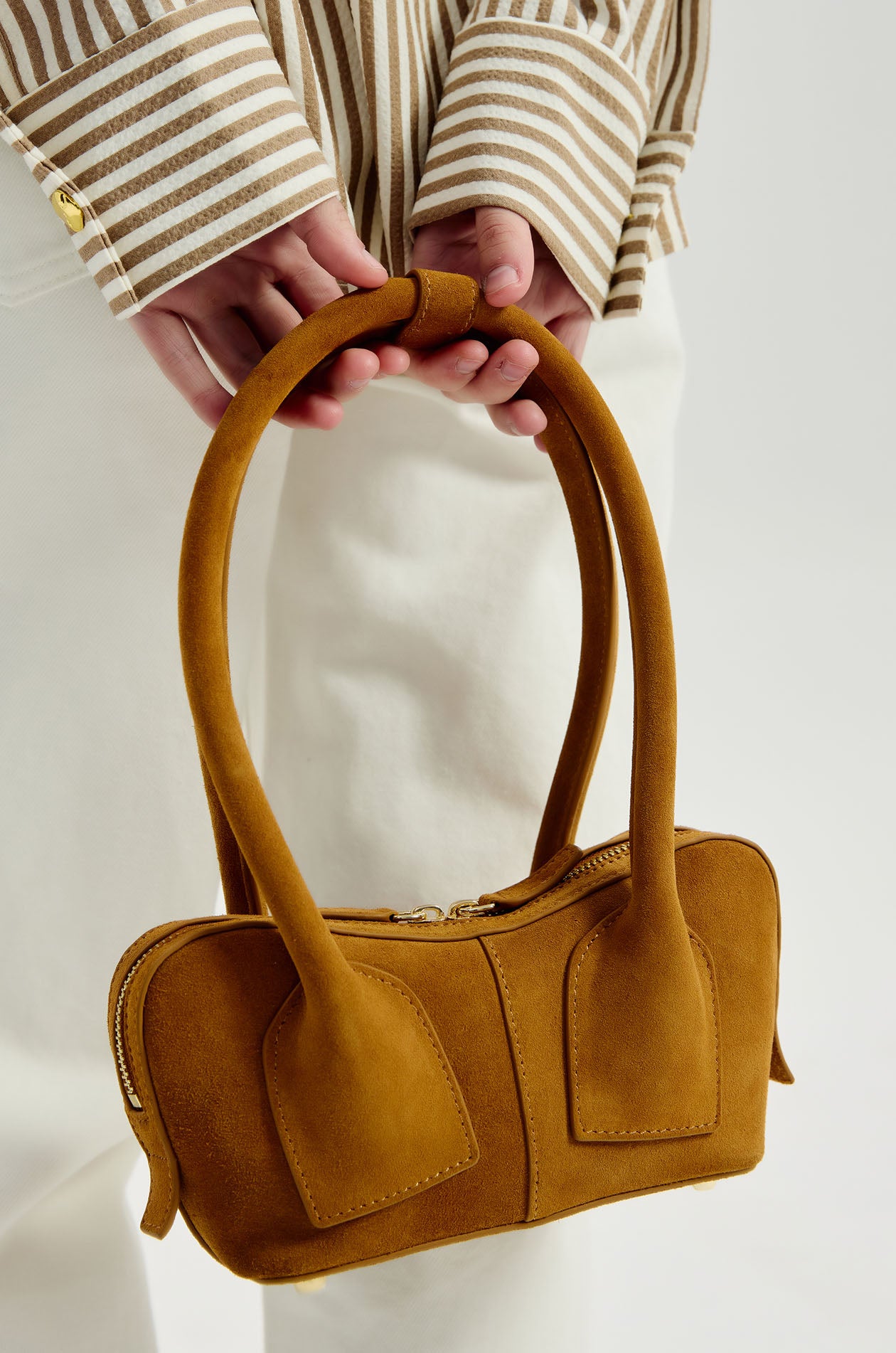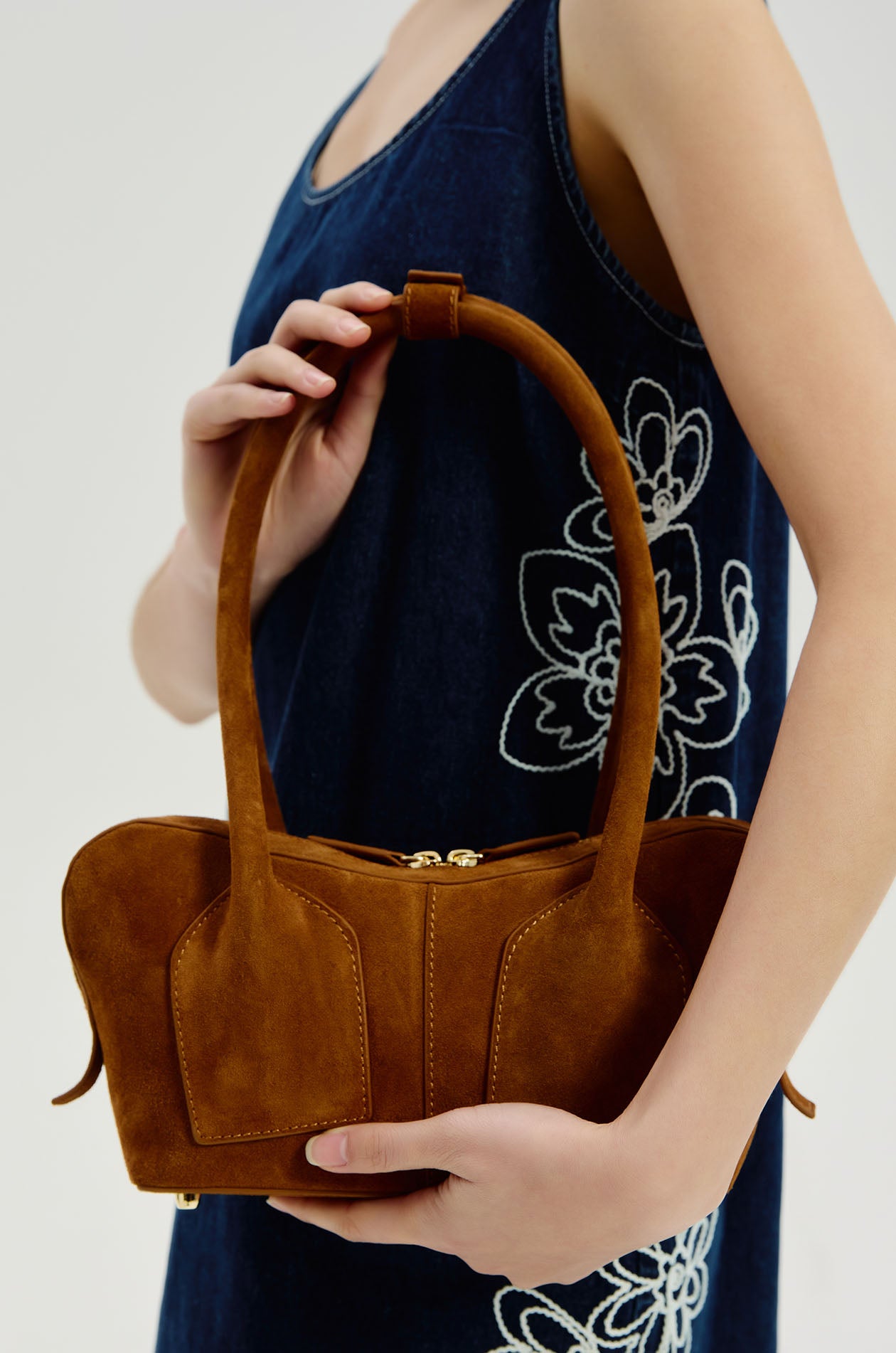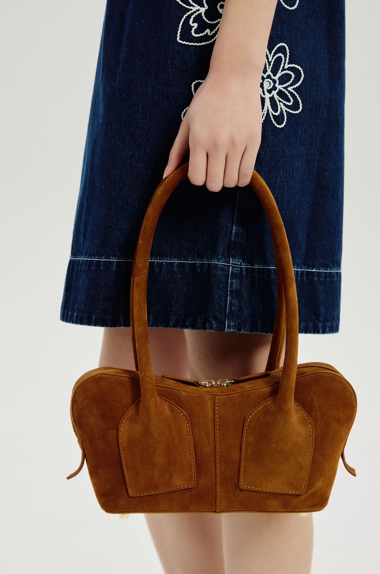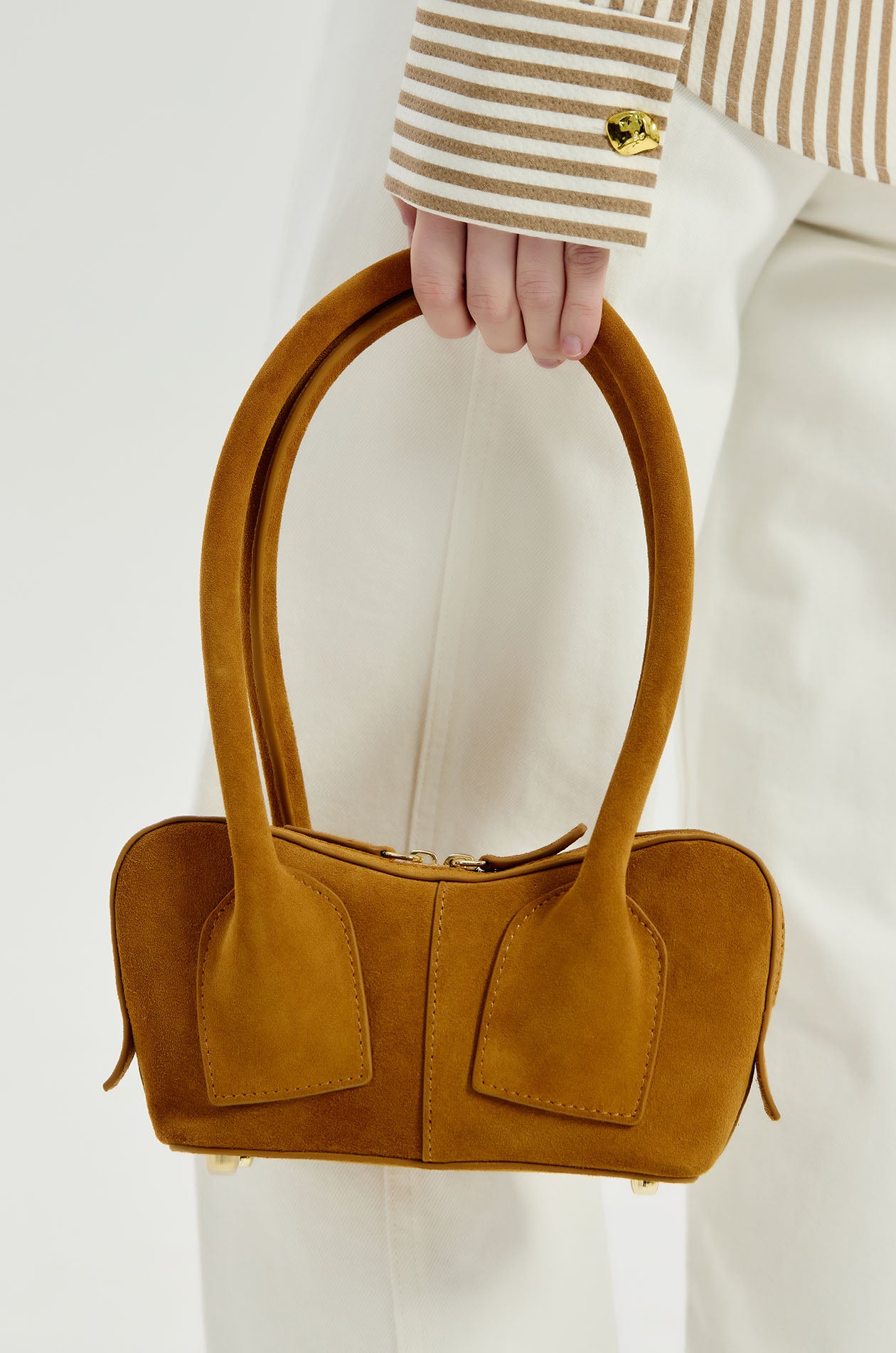 Baguette bag crafted from cow leather, featuring a heart-shaped design and structured shoulder straps. Available in yellow, off-white, and brown suede.