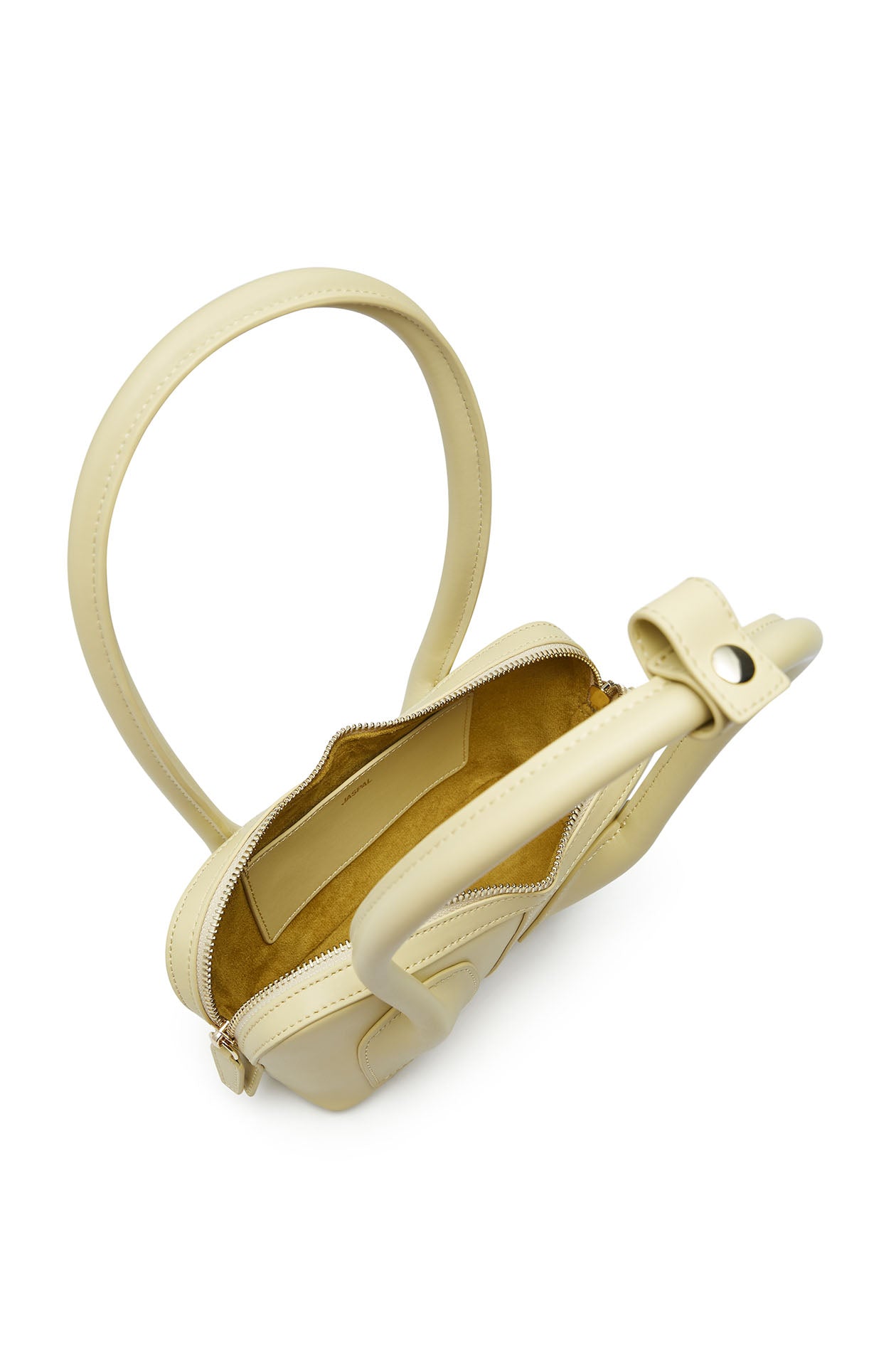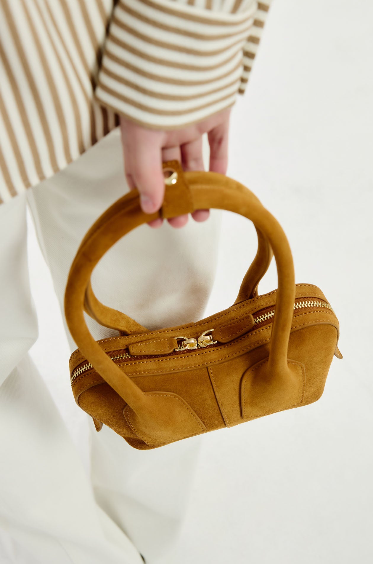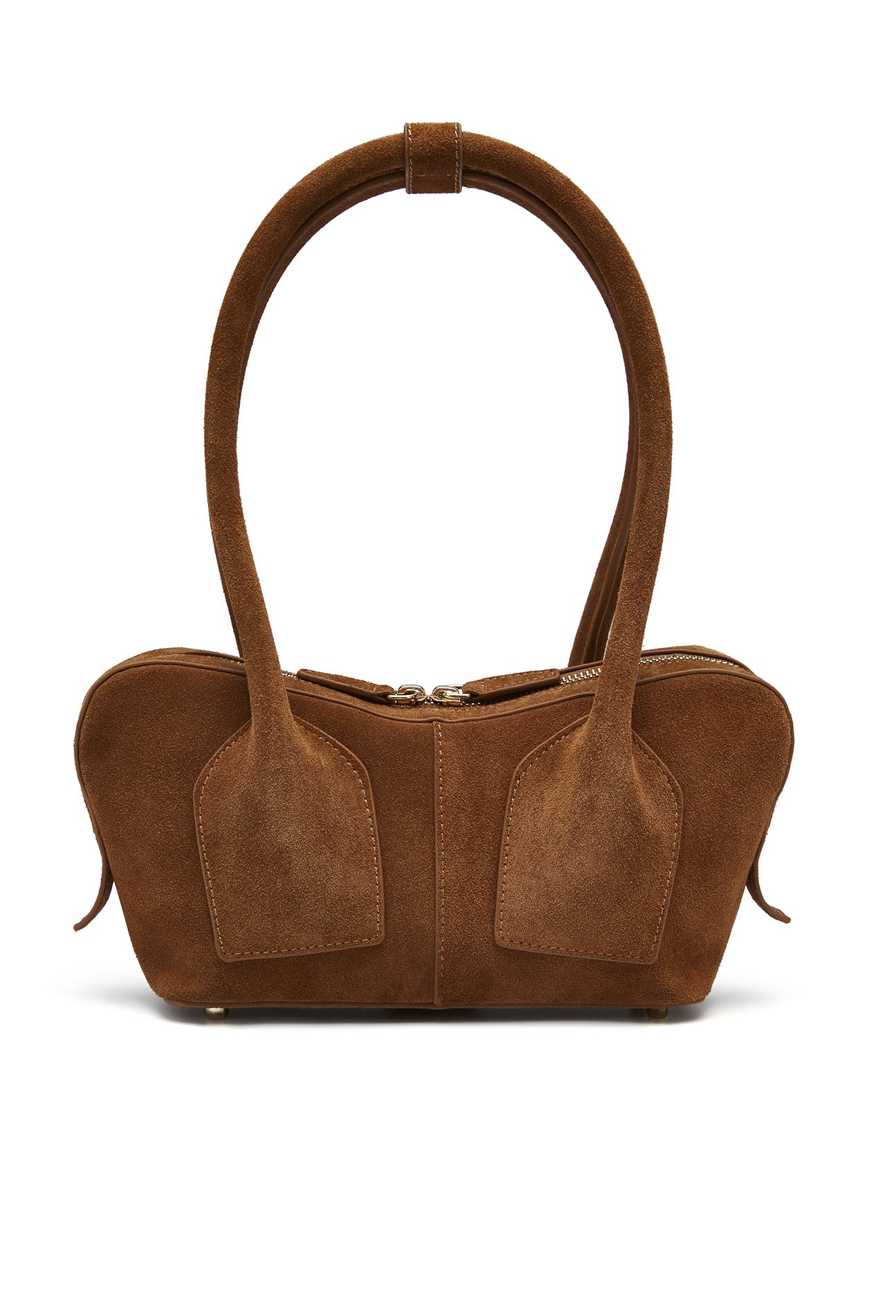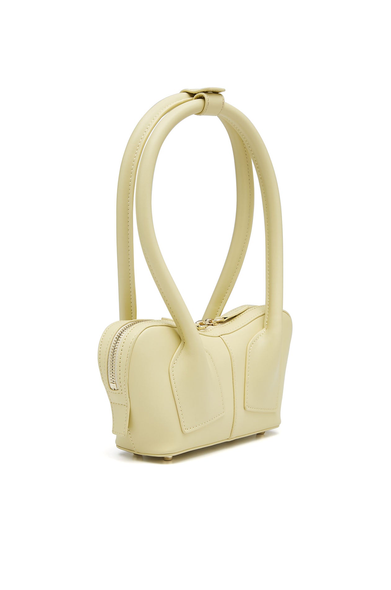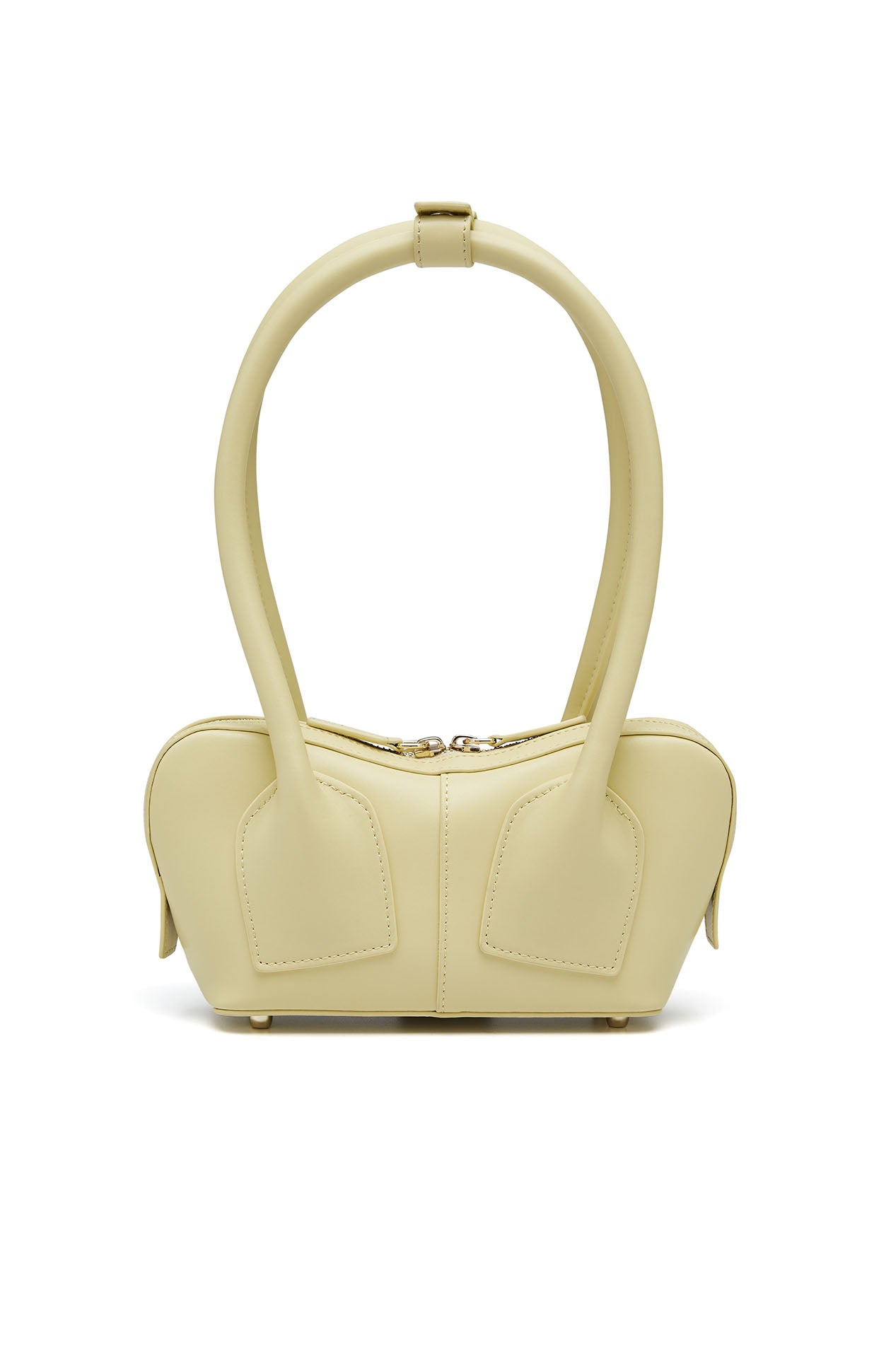 Baguette bag crafted from cow leather, featuring a heart-shaped design and structured shoulder straps. Available in yellow, off-white, and brown suede.