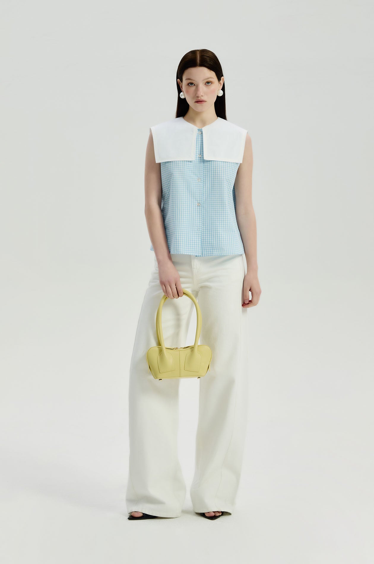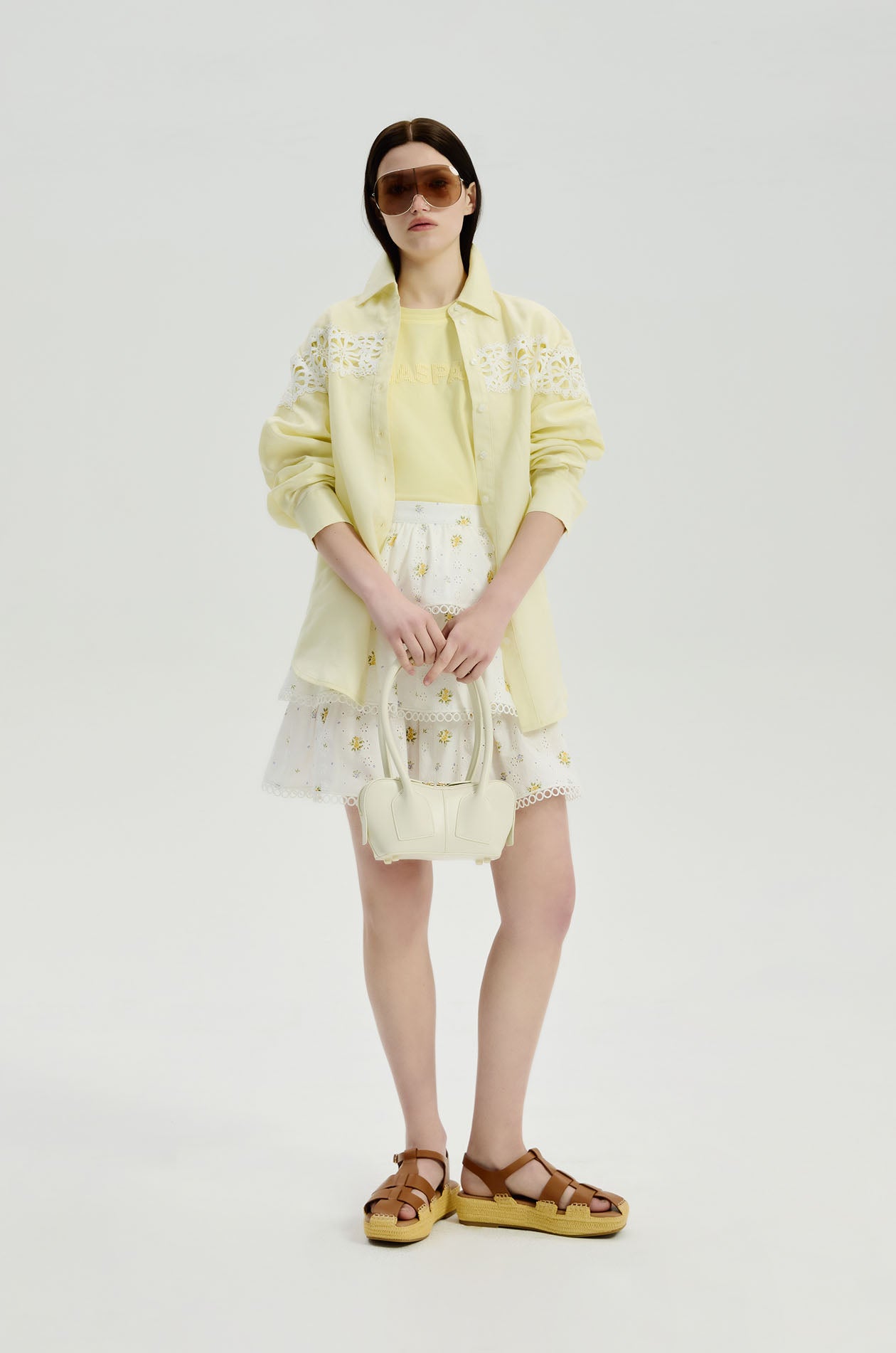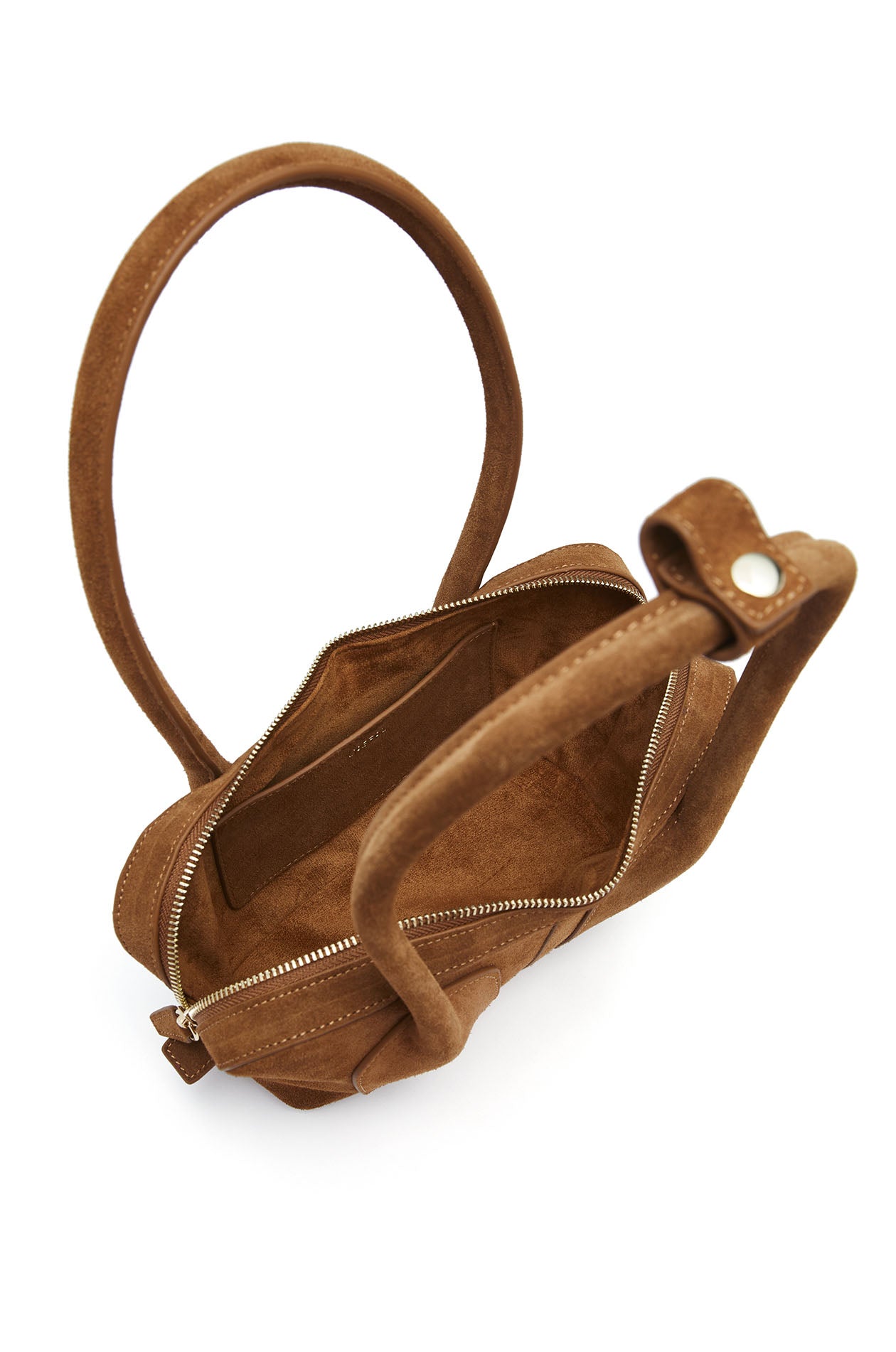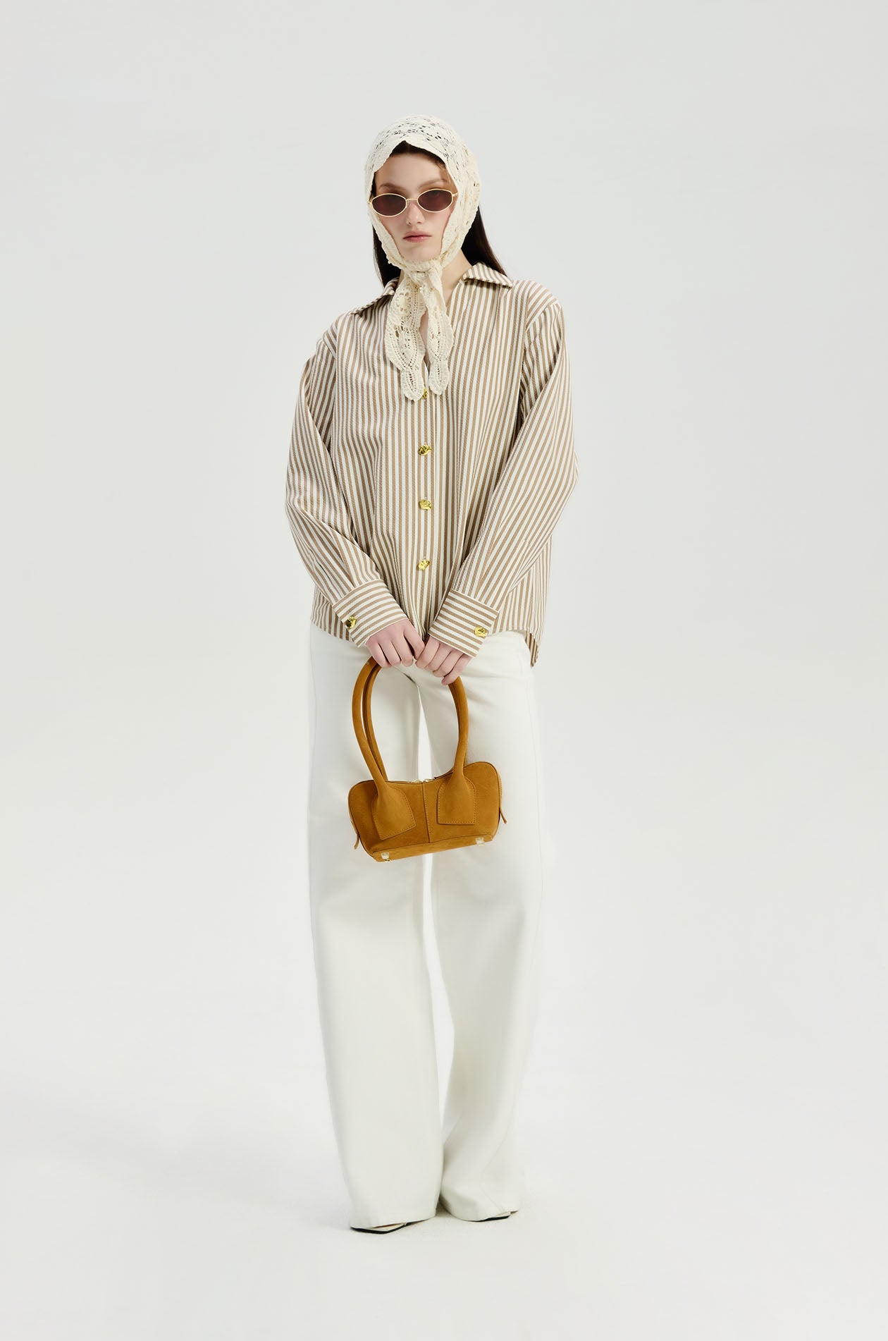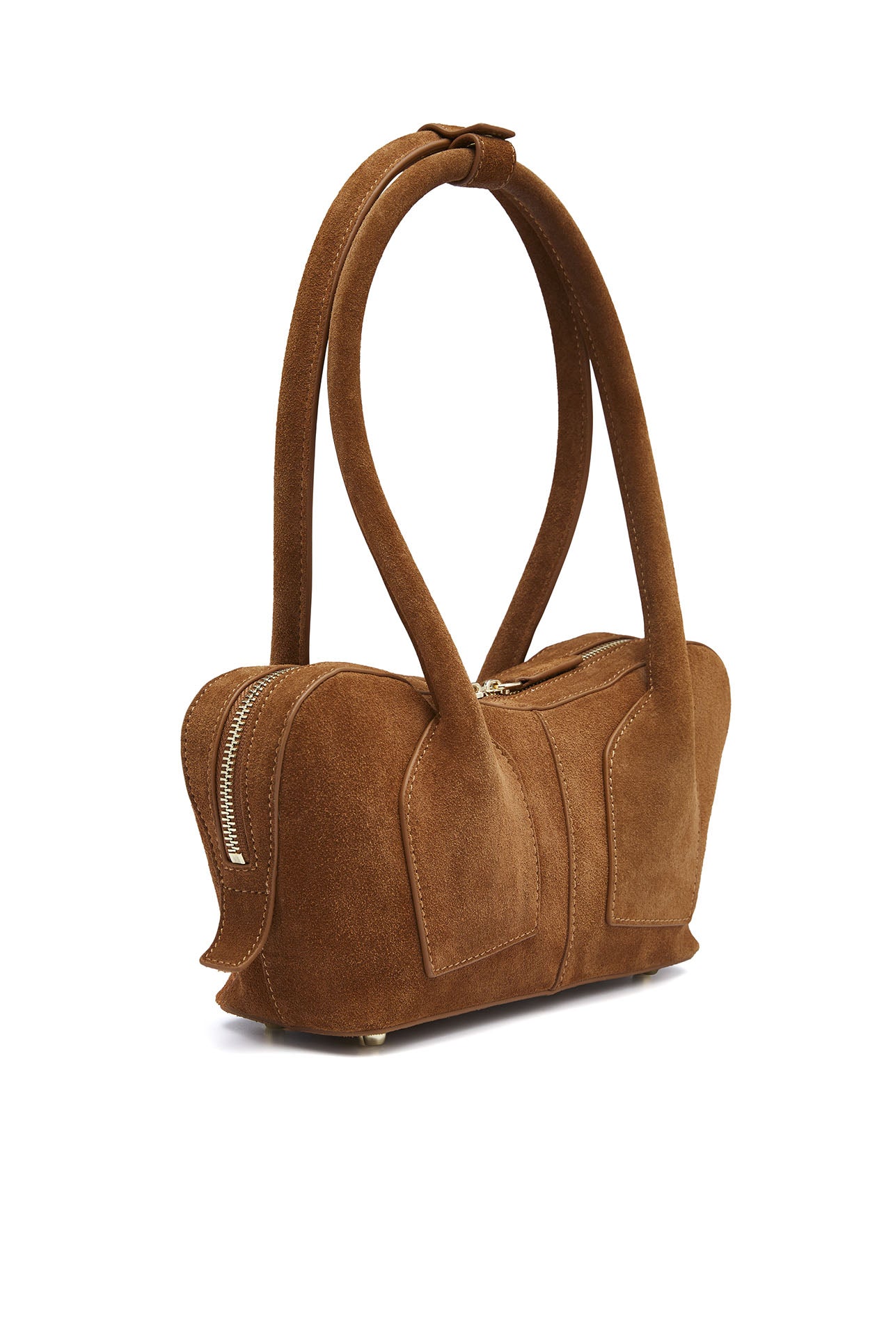 Baguette bag crafted from cow leather, featuring a heart-shaped design and structured shoulder straps. Available in yellow, off-white, and brown suede.