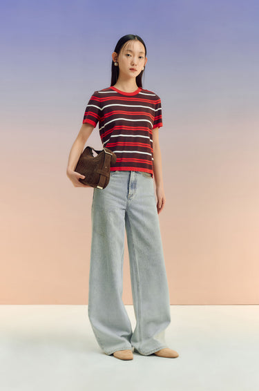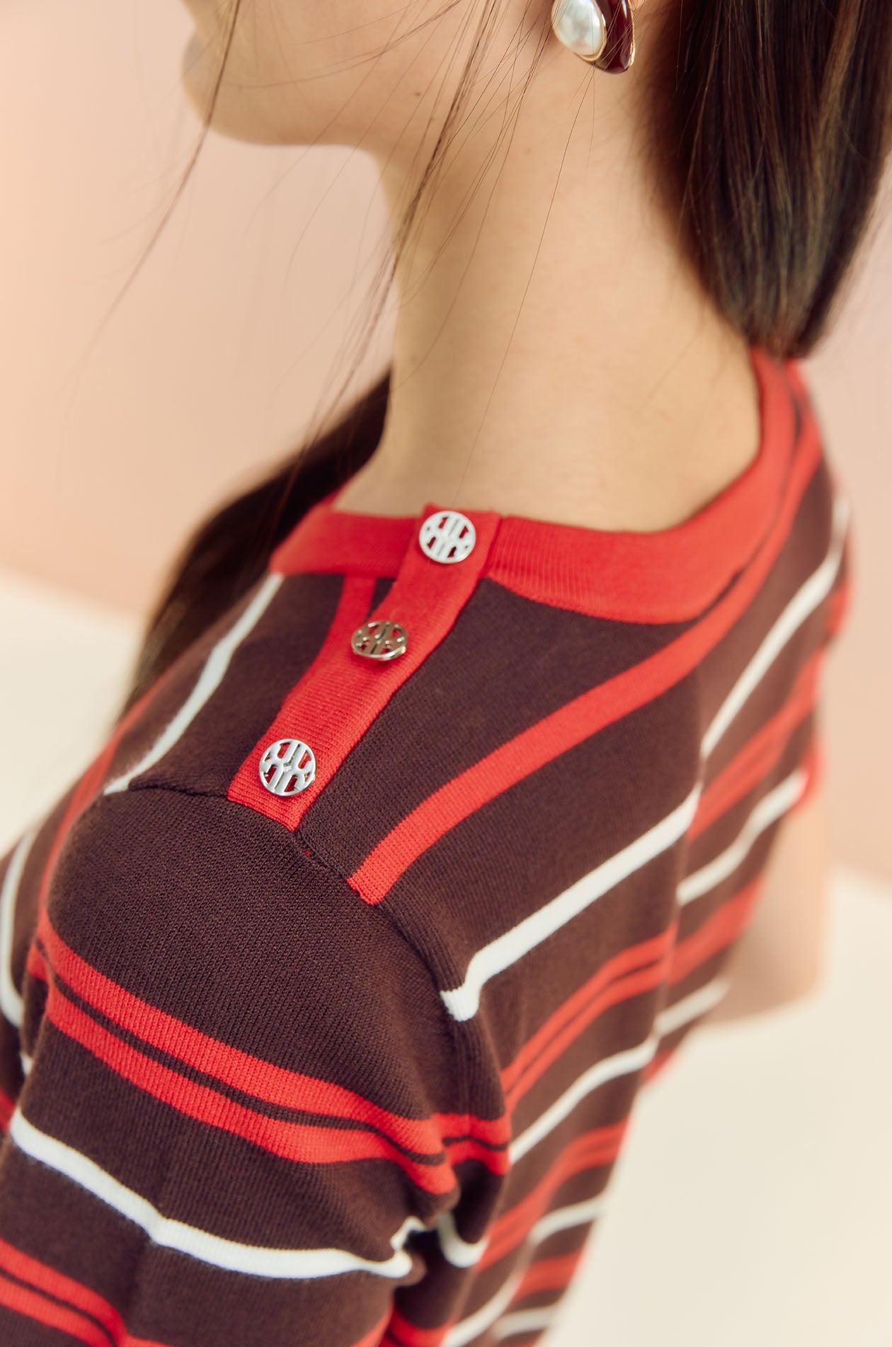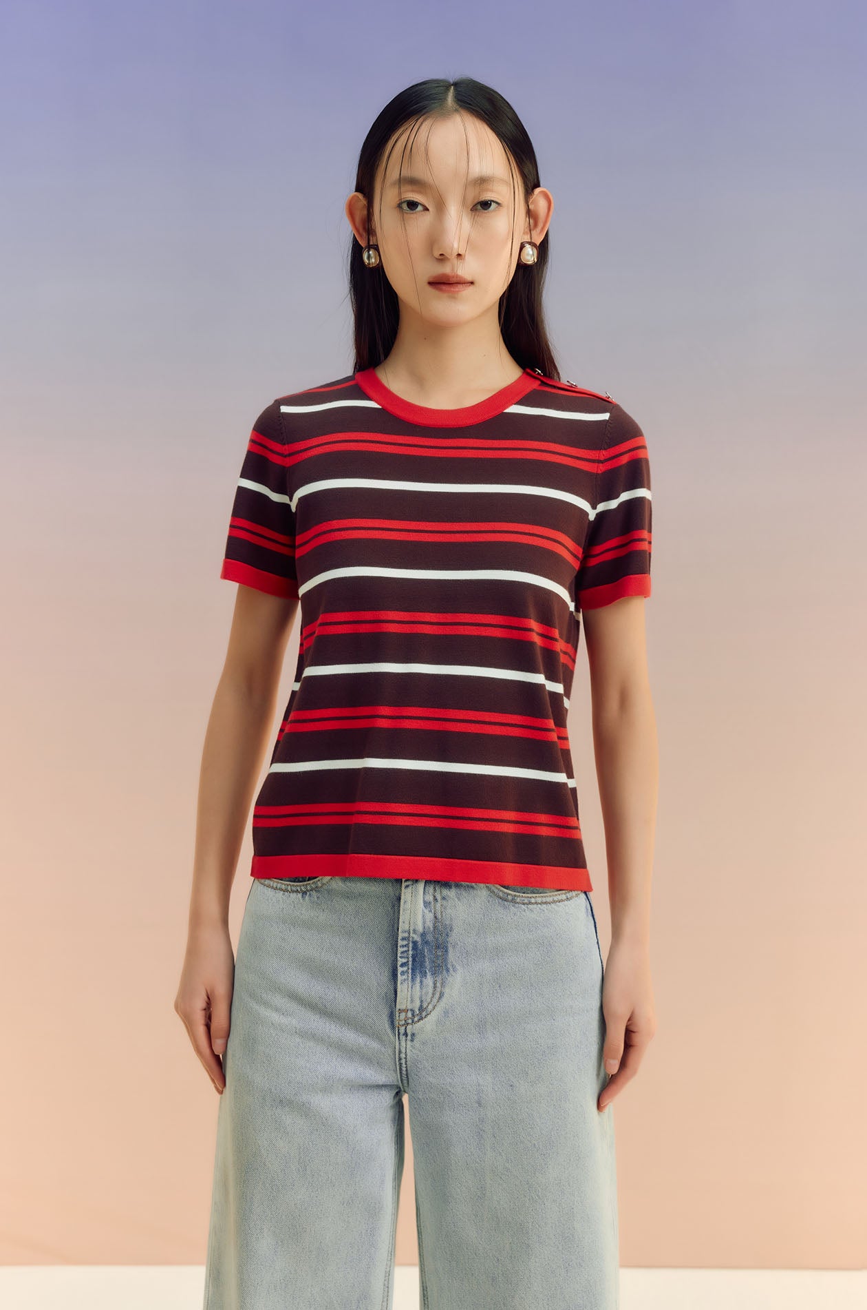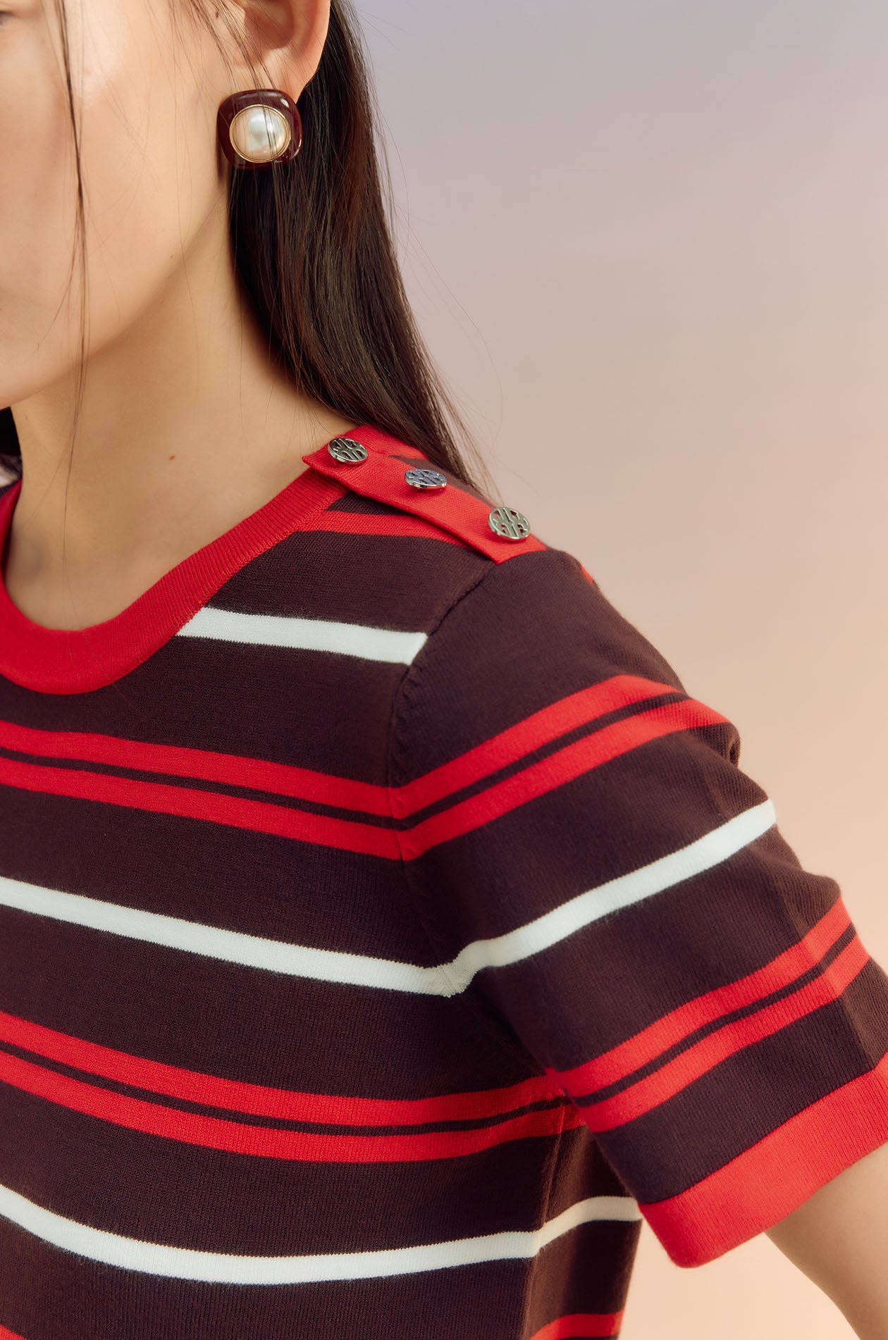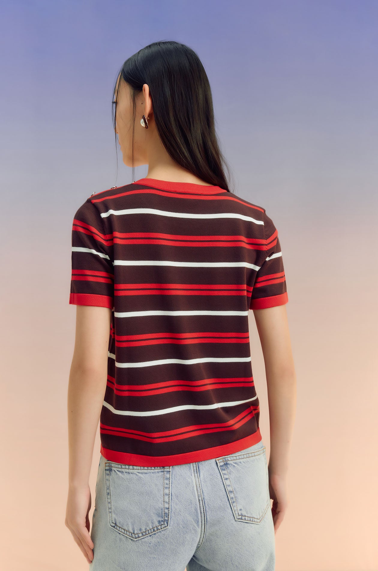 Short-sleeved T-shirt in knit fabric with stripes. Regular fit with straight cut and button embellishment at the left shoulder. Available in red/mahogany.