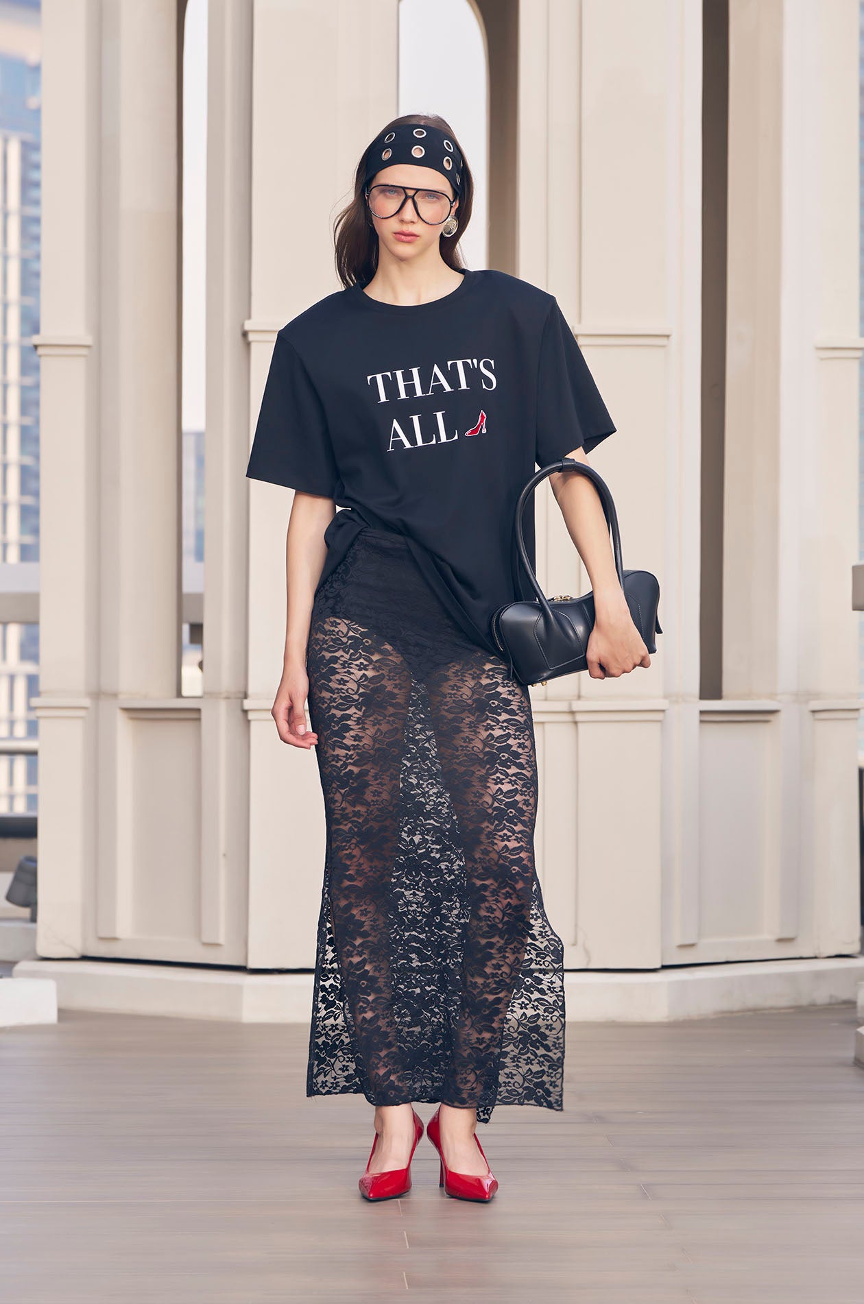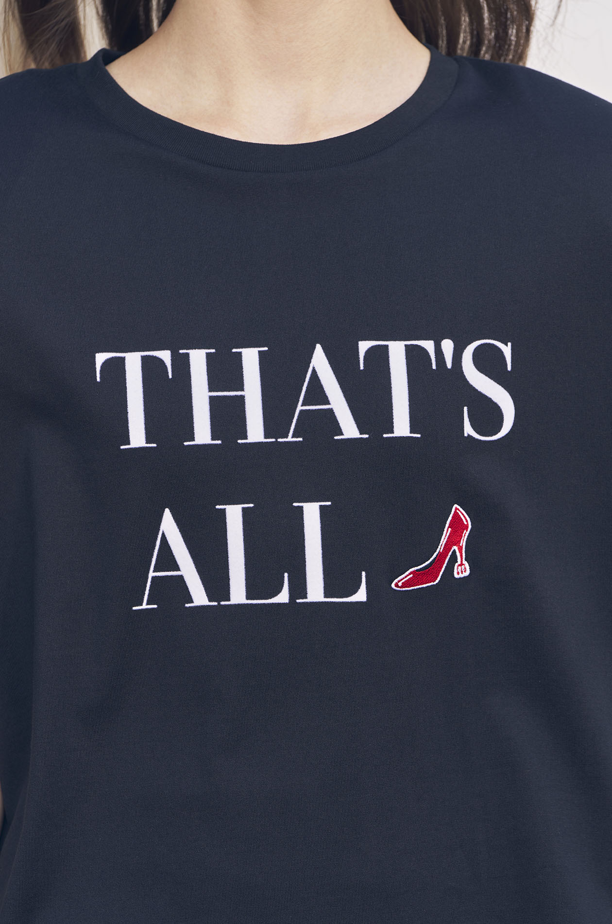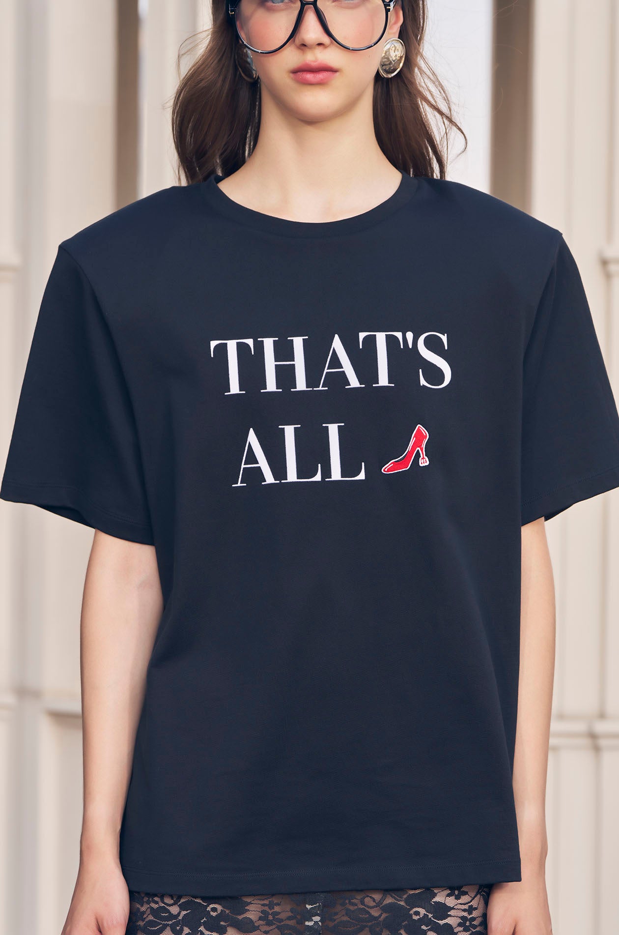 Jaspal x The Devil Wears Prada "The Power Edit" | This short-sleeved T-shirt is crafted from soft cotton jersey and designed in an oversized fit with padded shoulders for a structured silhouette. The front features an iconic quote rendered in a textured flock print, creating a bold graphic statement inspired by the film’s unforgettable fashion dialogue. Available in black.