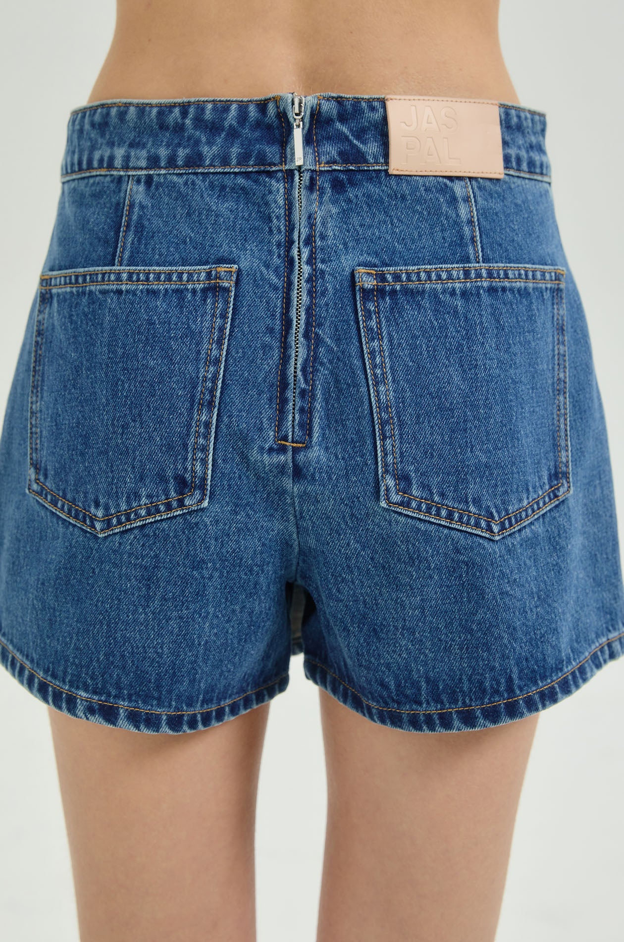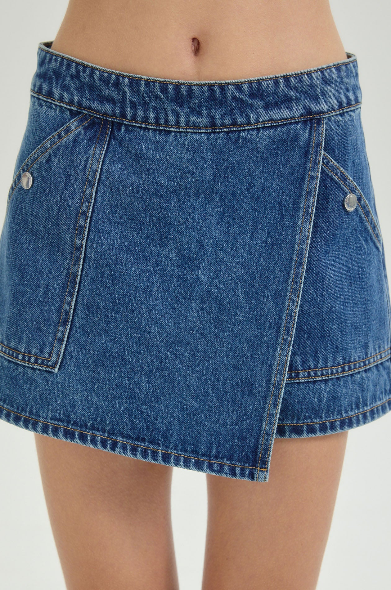 High-rise skort in denim. Wrapped design with side and back pockets. Back zip closure. Available in mid blue.