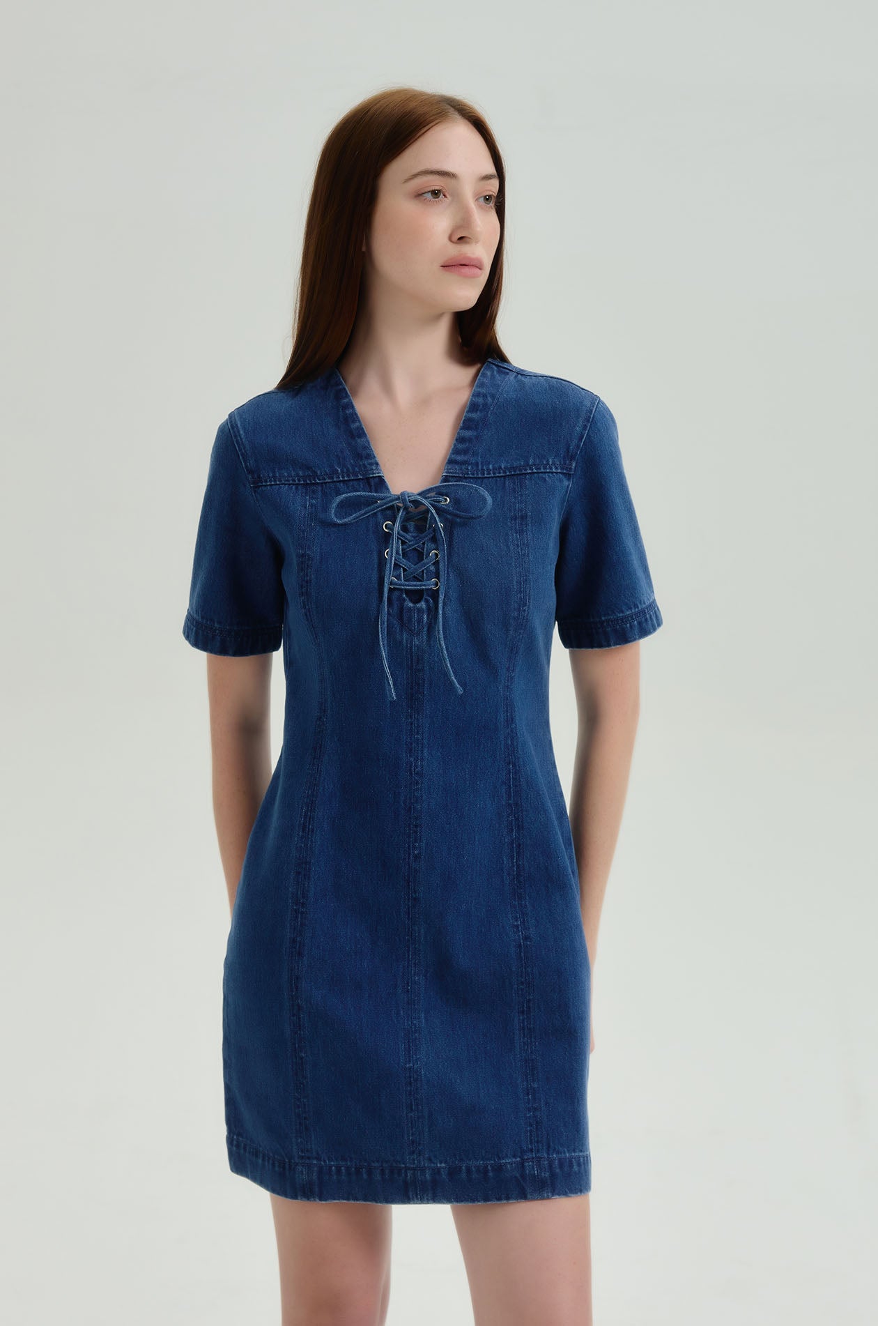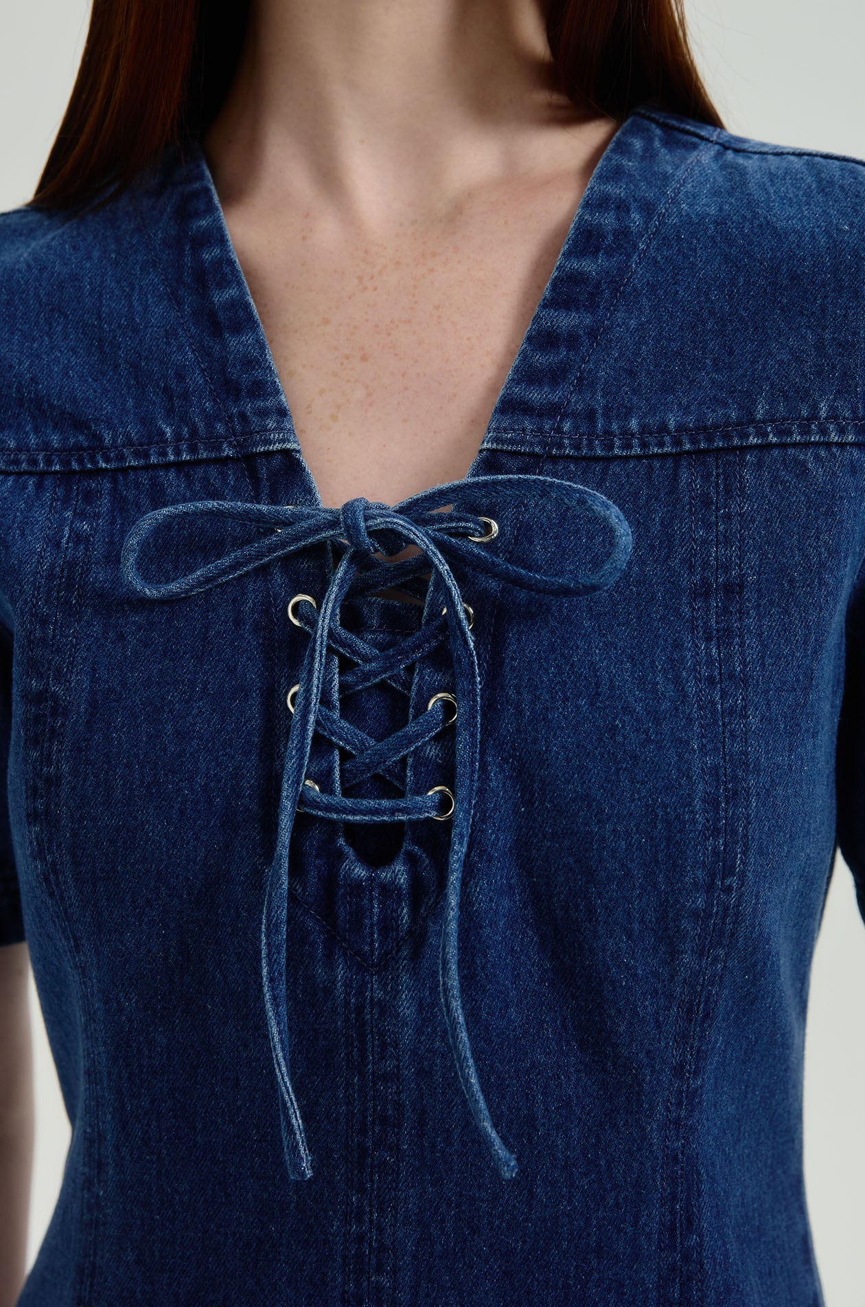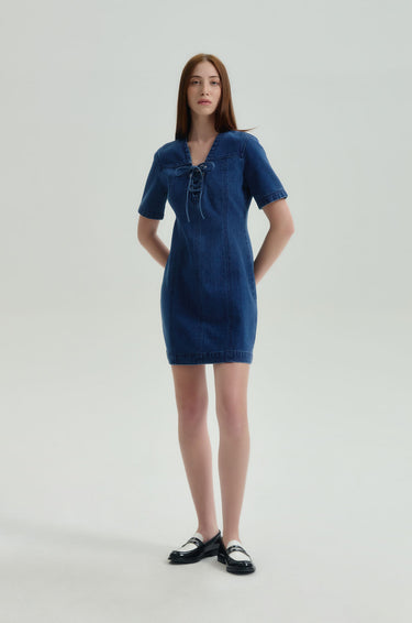 Short-sleeved mini dress in denim. Sheath silhouette with plunging neckline and lace-up detail. Back zip closure. Available in dark blue.