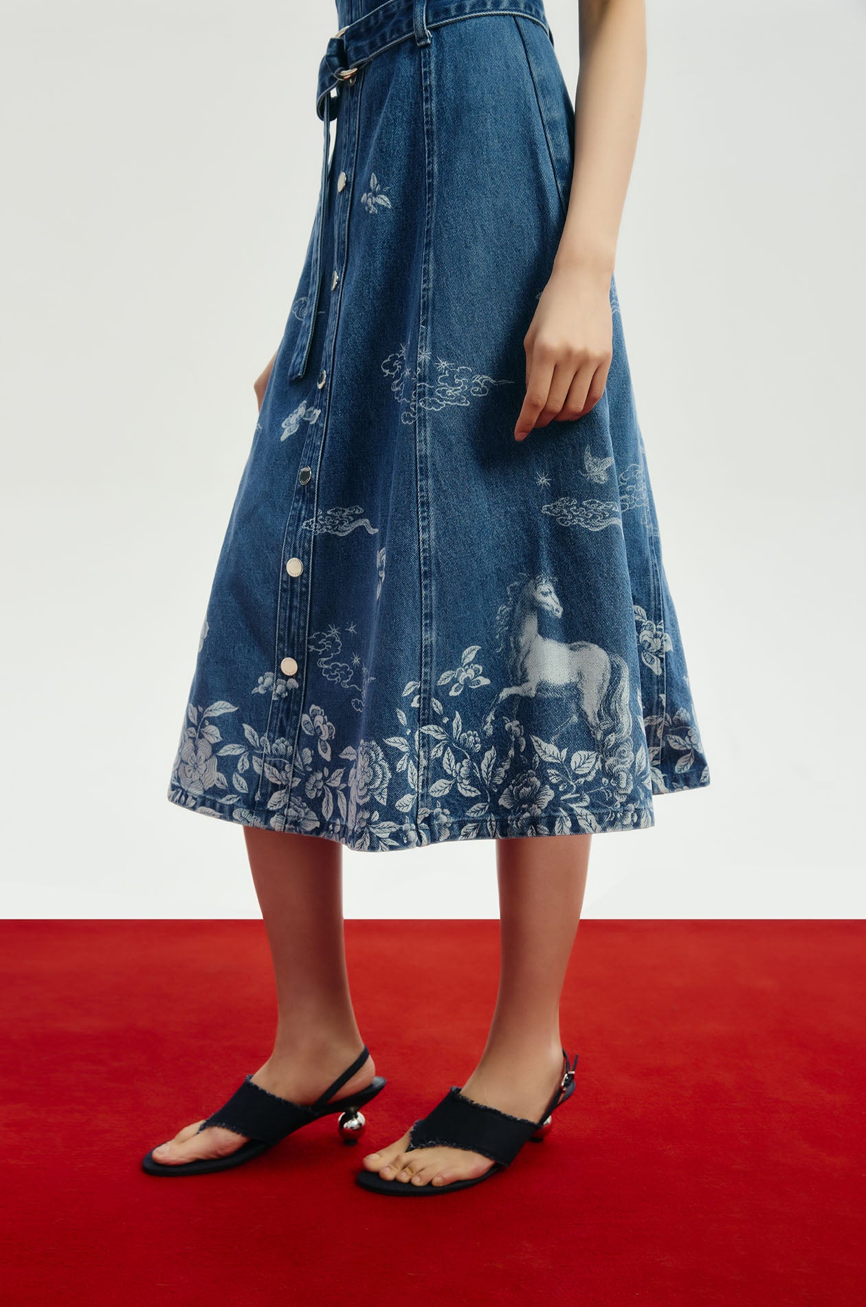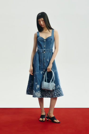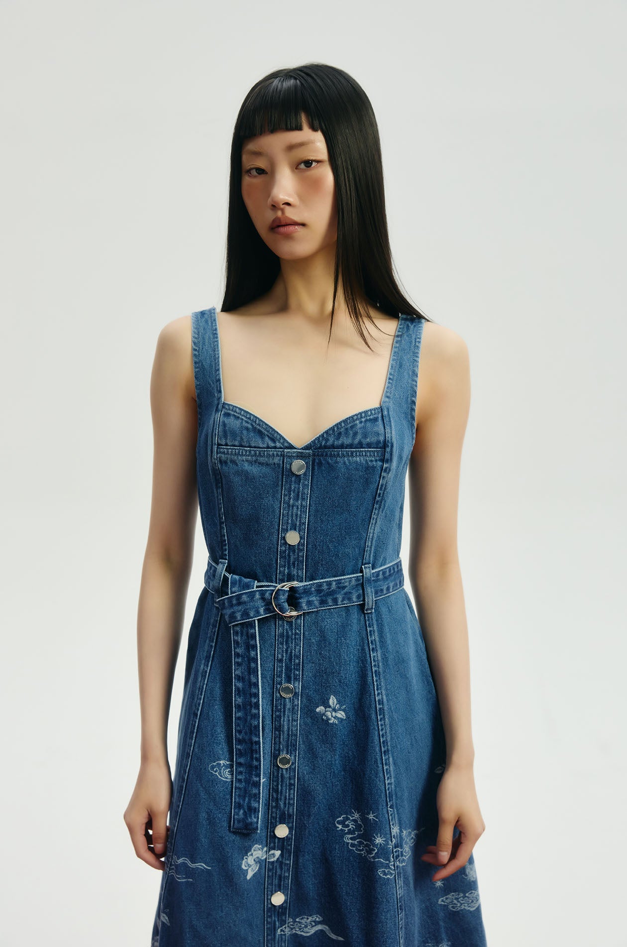 Jaspal x nussdaydream for Lunar New Year | Strappy midi dress in denim. Fit and flare silhouette with auspicious motif print. Sweetheart neckline, smocked back, and button embellishment. Back zip closure. Available in dark blue.