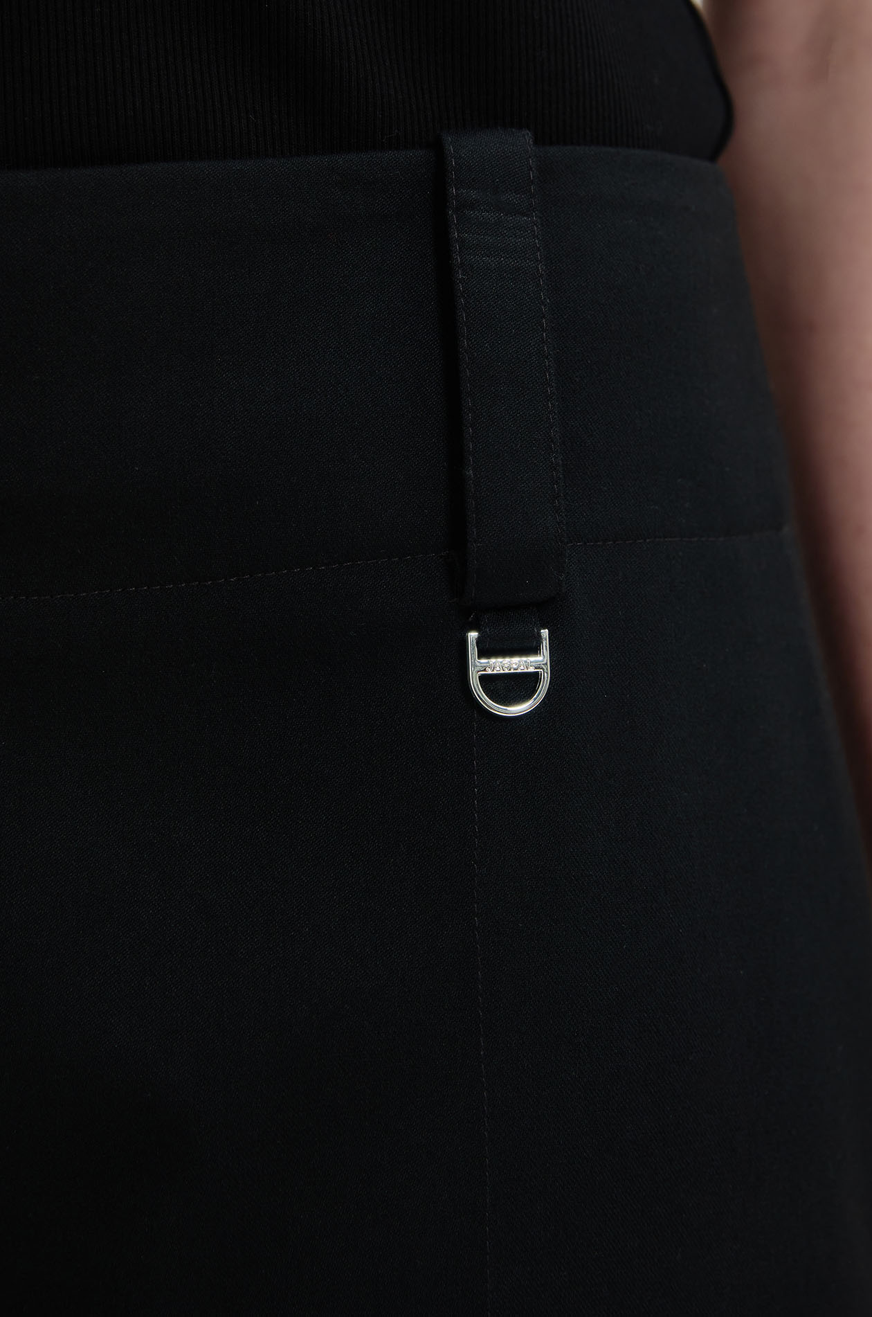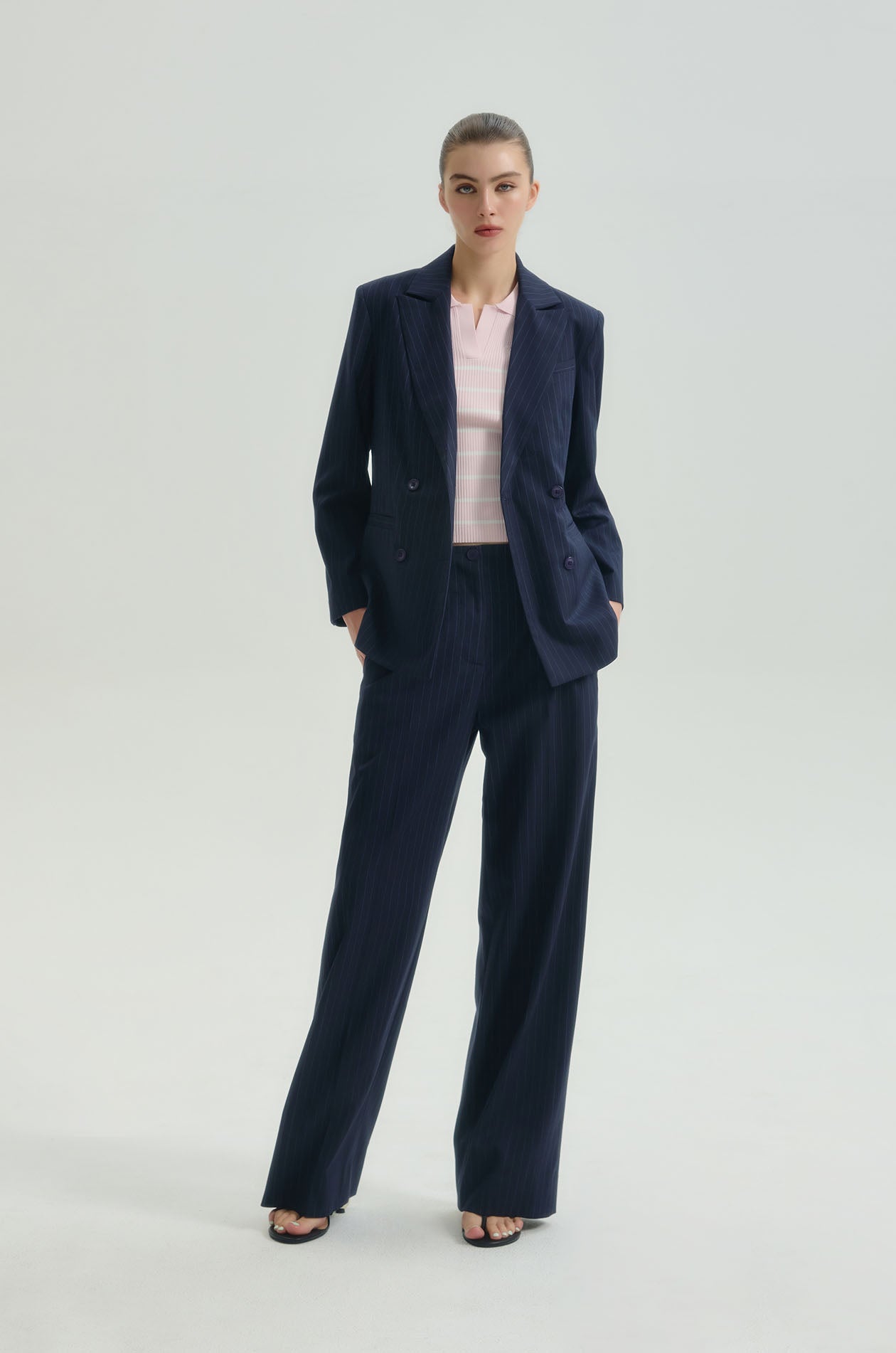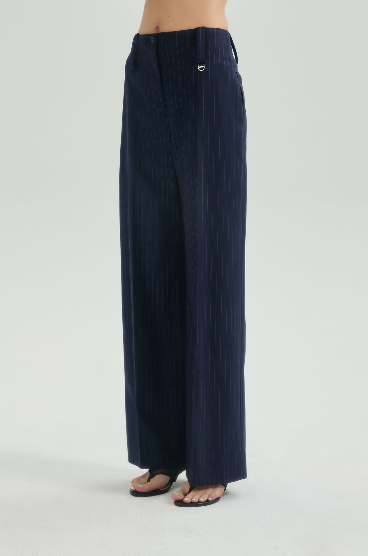 High-rise pants in suiting fabric. Loose-straight legs with side pockets and chunky waistband. Silver-tone D-ring at the belt loop. Front button and zip closure. Available in striped navy, black, and off-white.