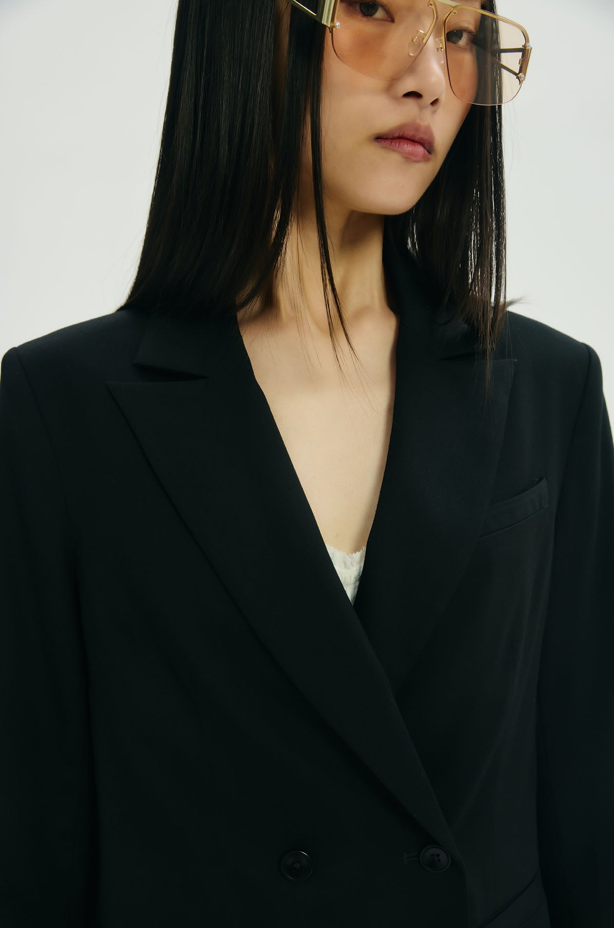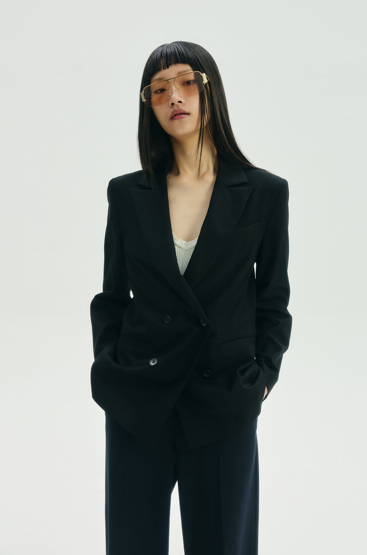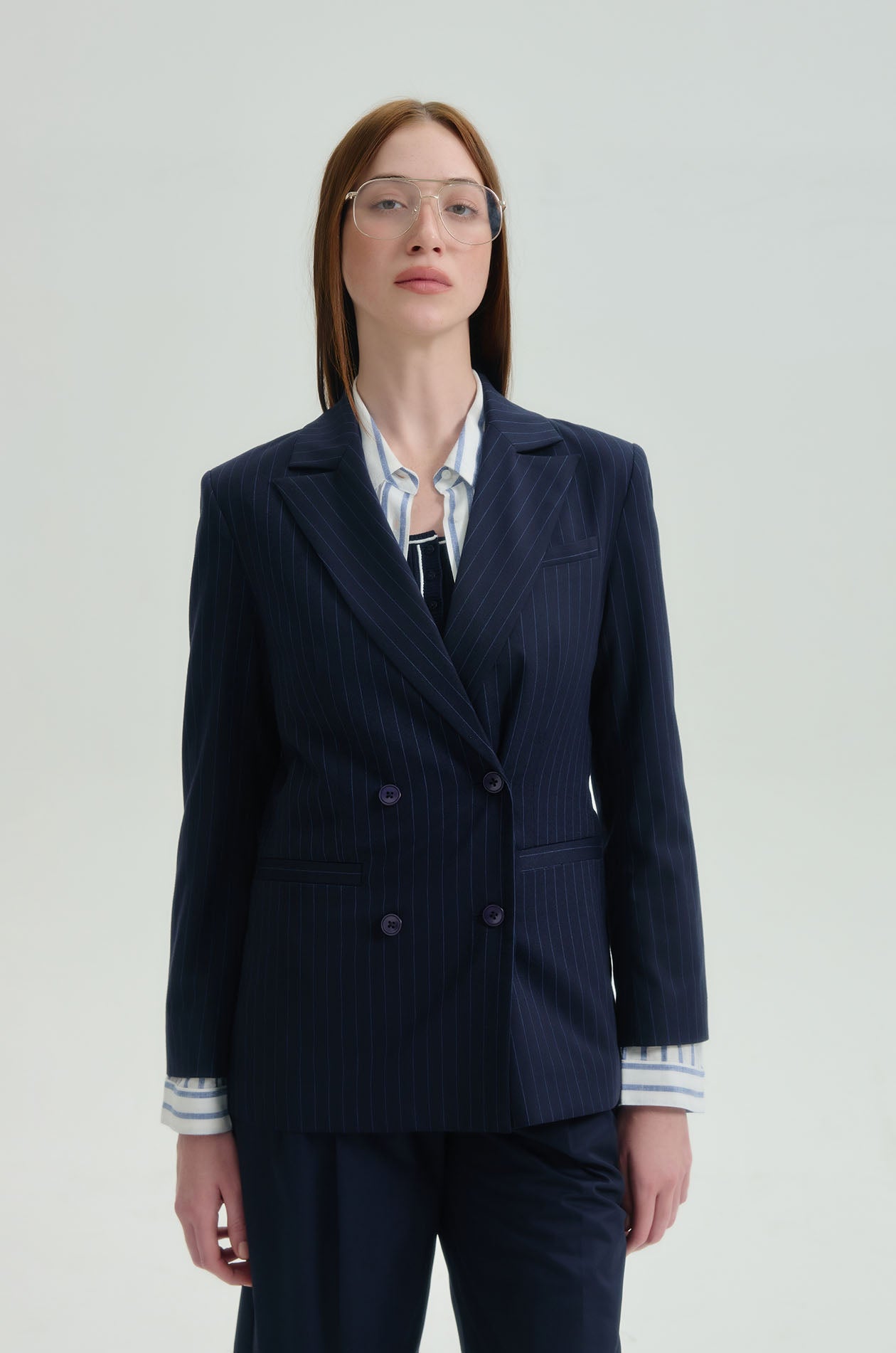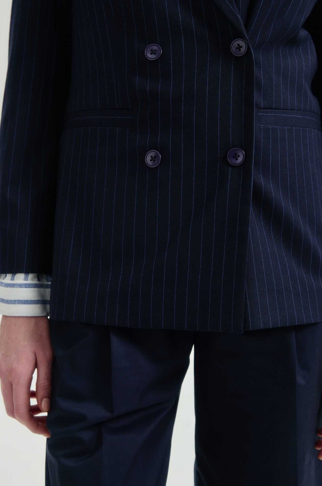 Double-breasted blazer in suiting fabric. Regular fit with peak lapel, padded shoulders, and front and chest pockets. Front button closure. Available in black and striped navy.