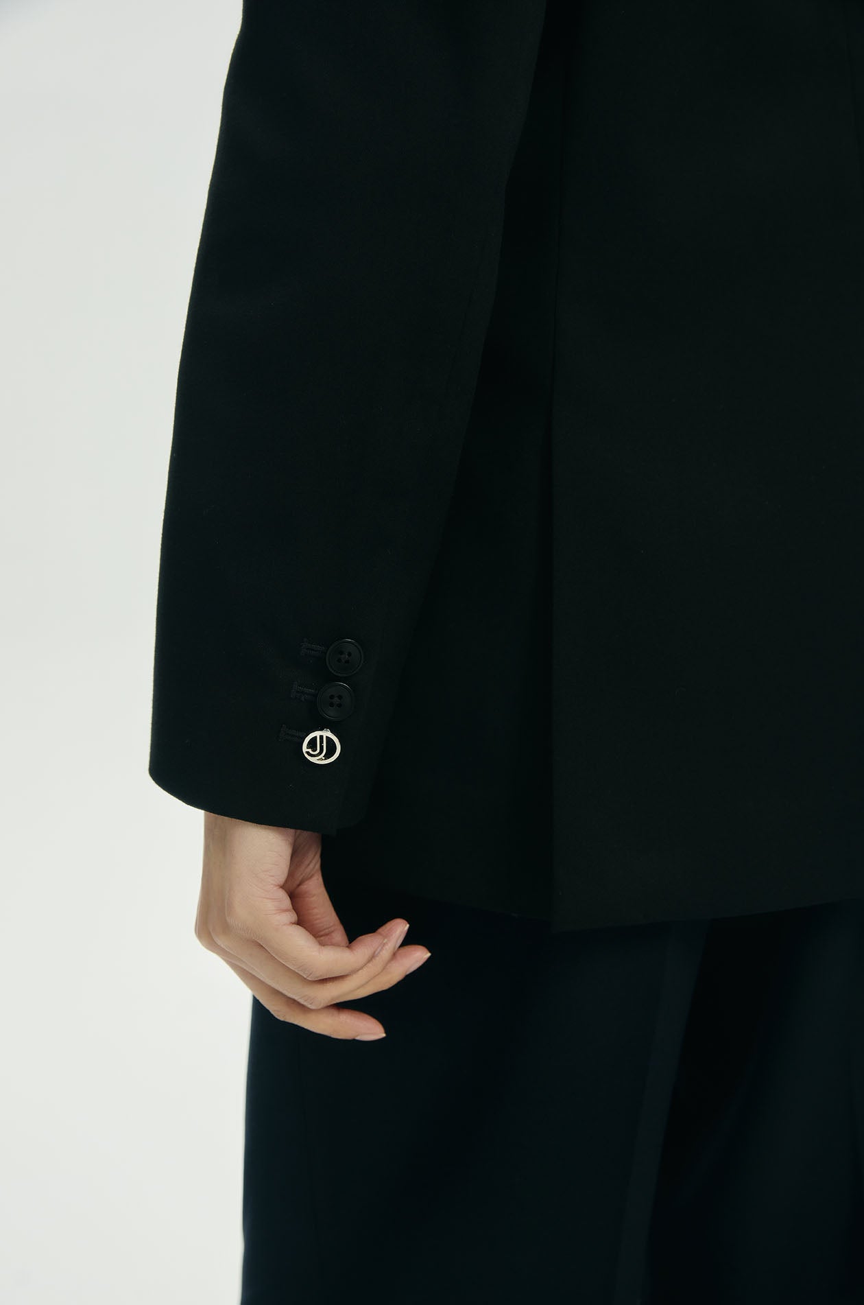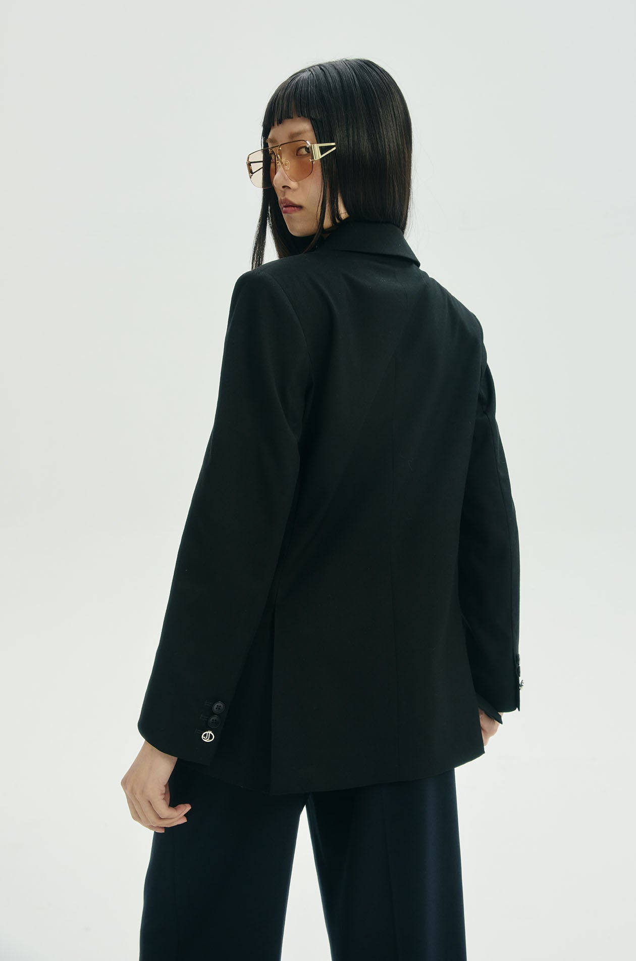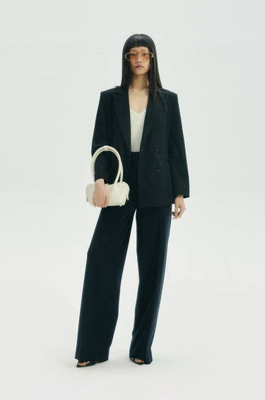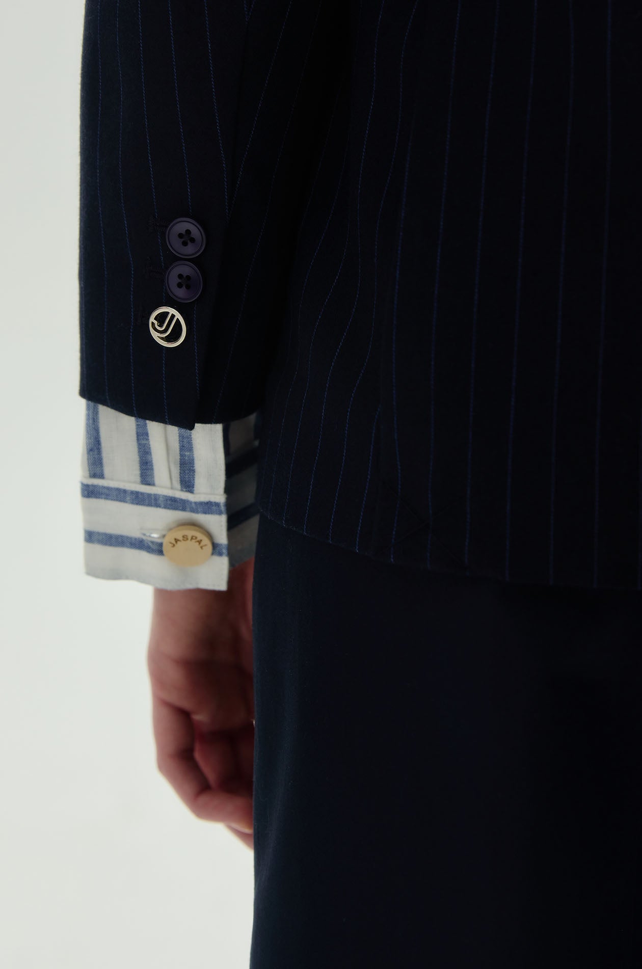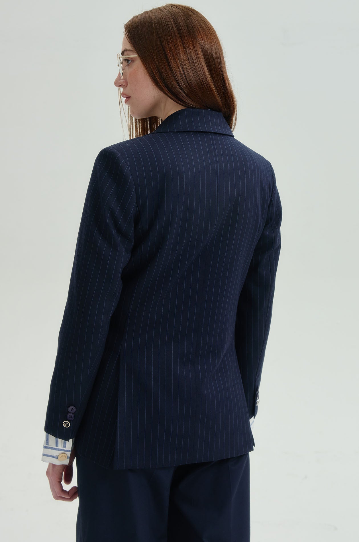Double-breasted blazer in suiting fabric. Regular fit with peak lapel, padded shoulders, and front and chest pockets. Front button closure. Available in black and striped navy.