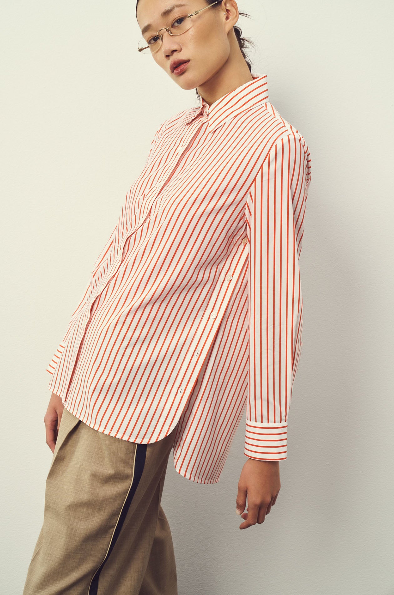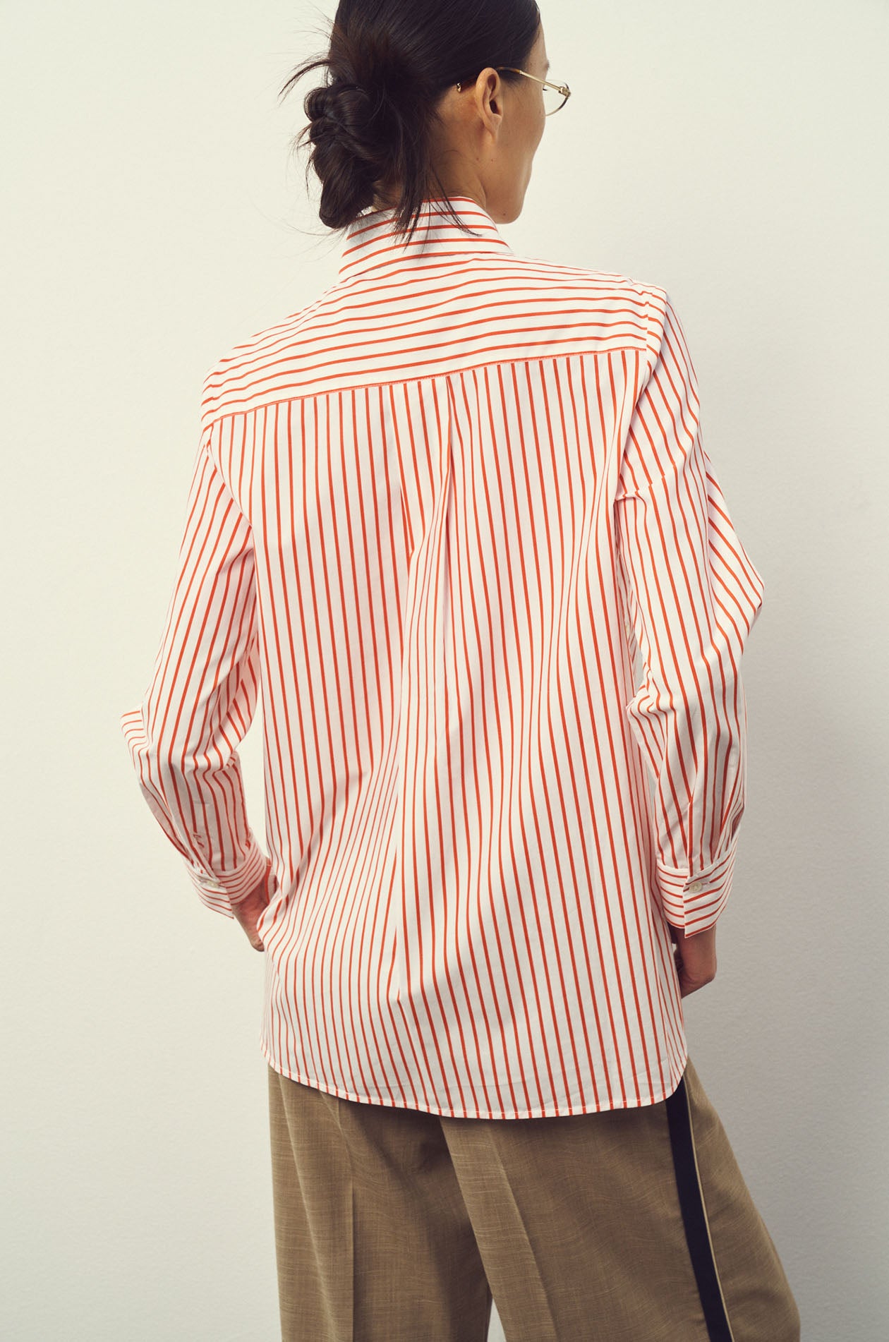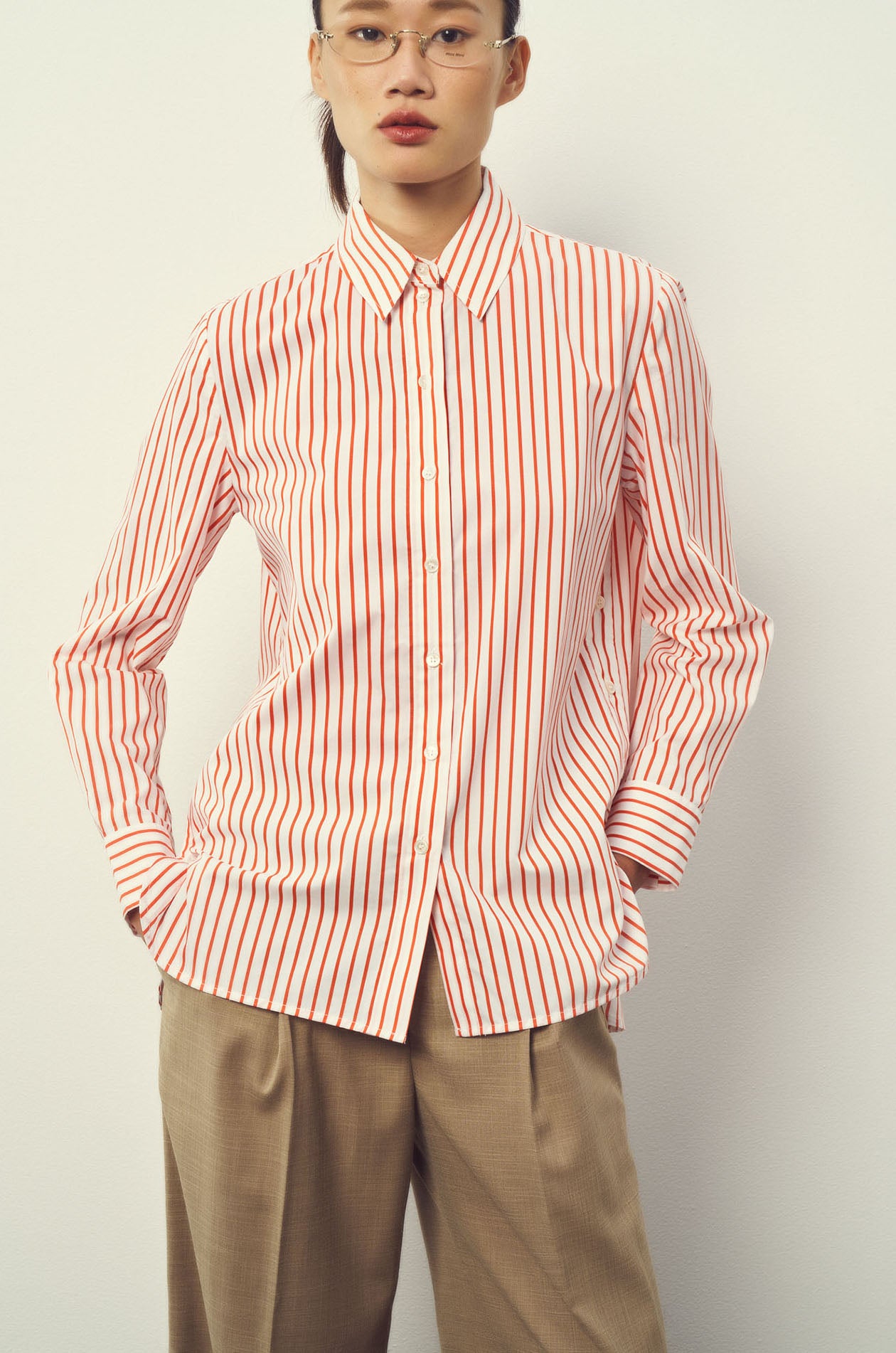 Long-sleeved shirt in poplin. Vertical stripes. High side slits with button detail. Regular fit. Front button closure. Available in striped navy and striped orange.