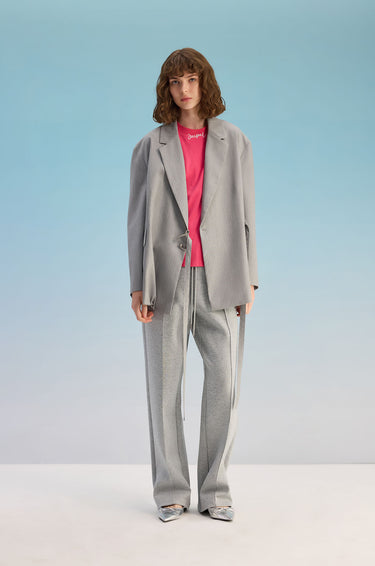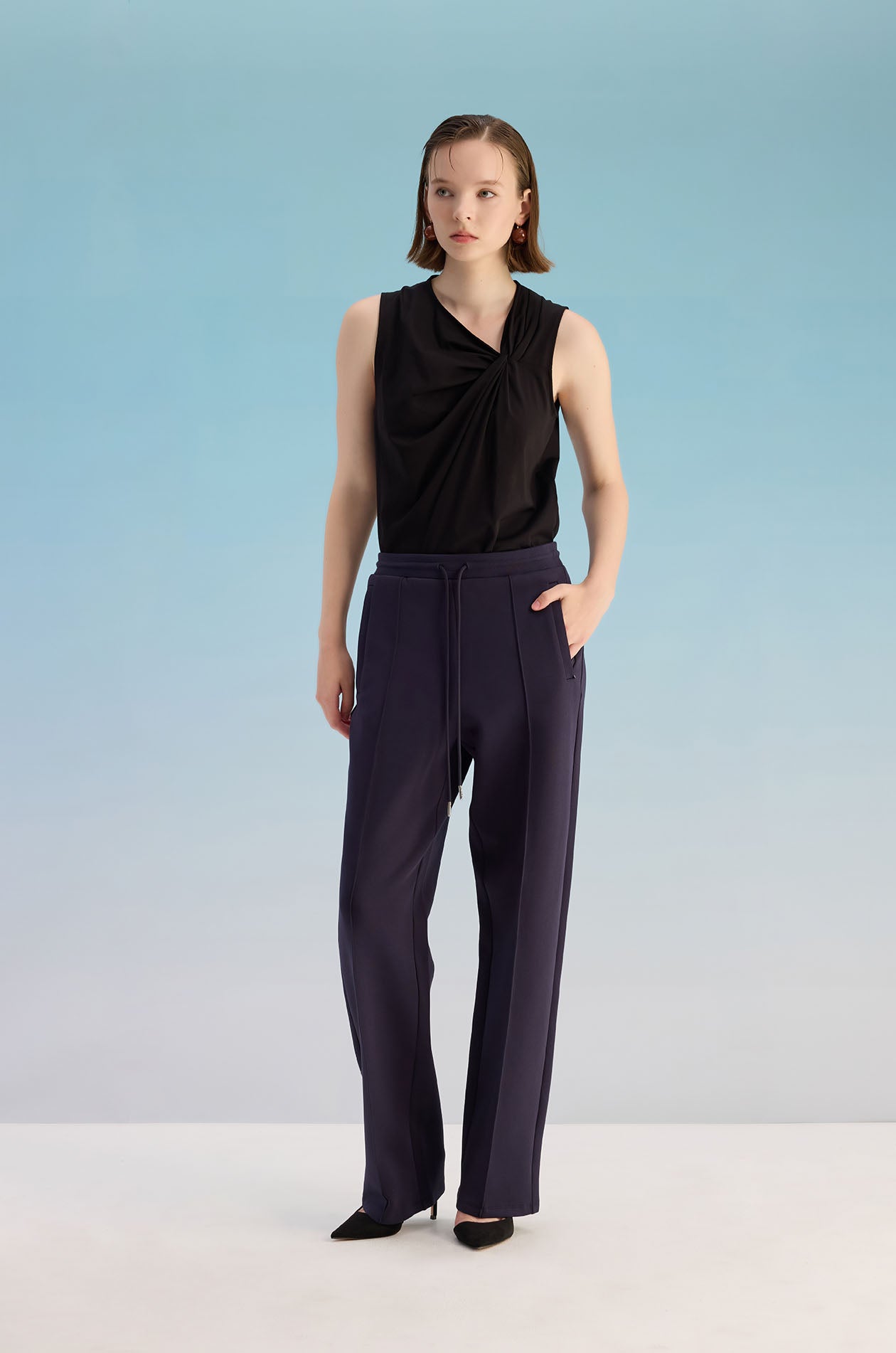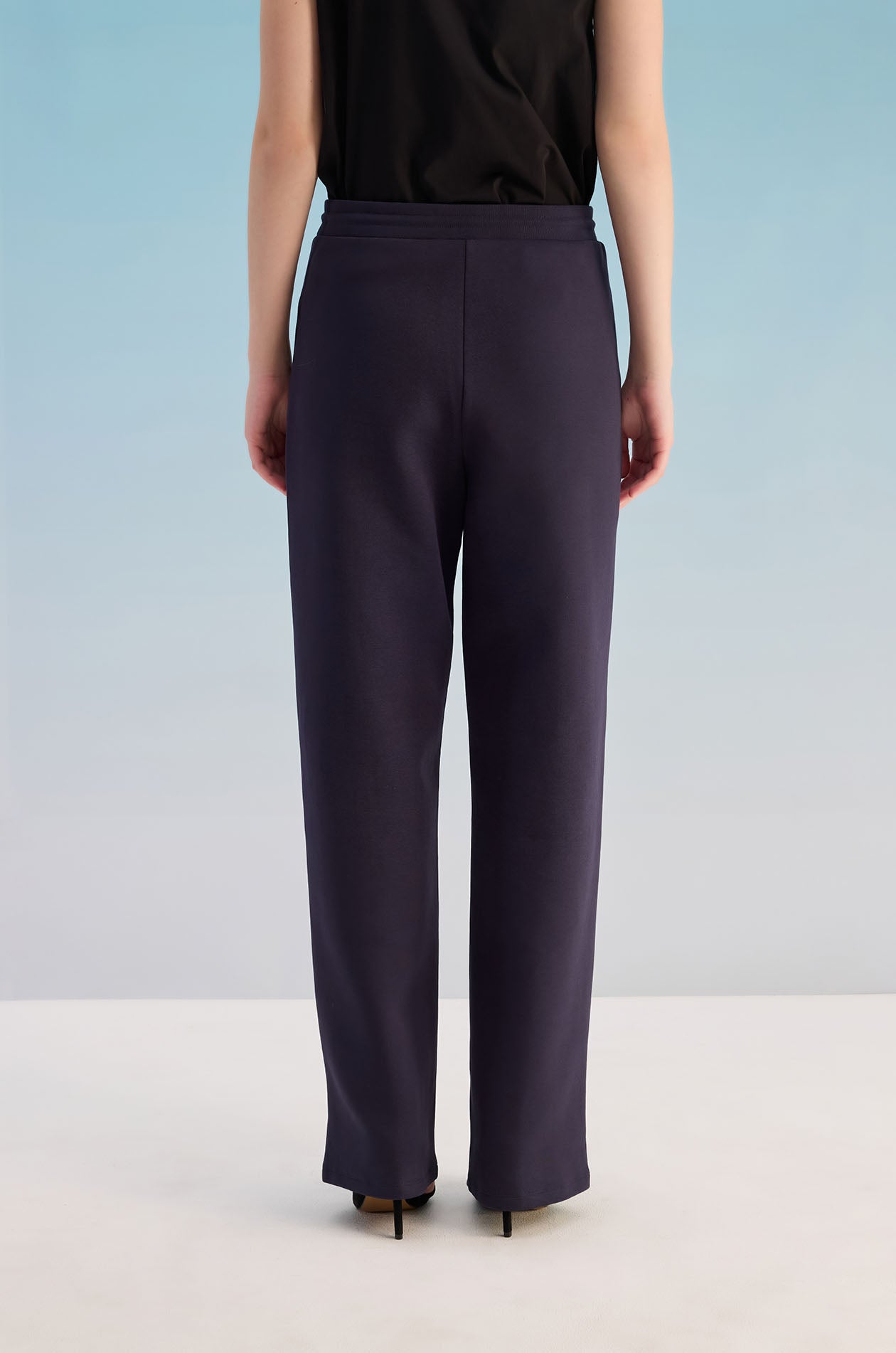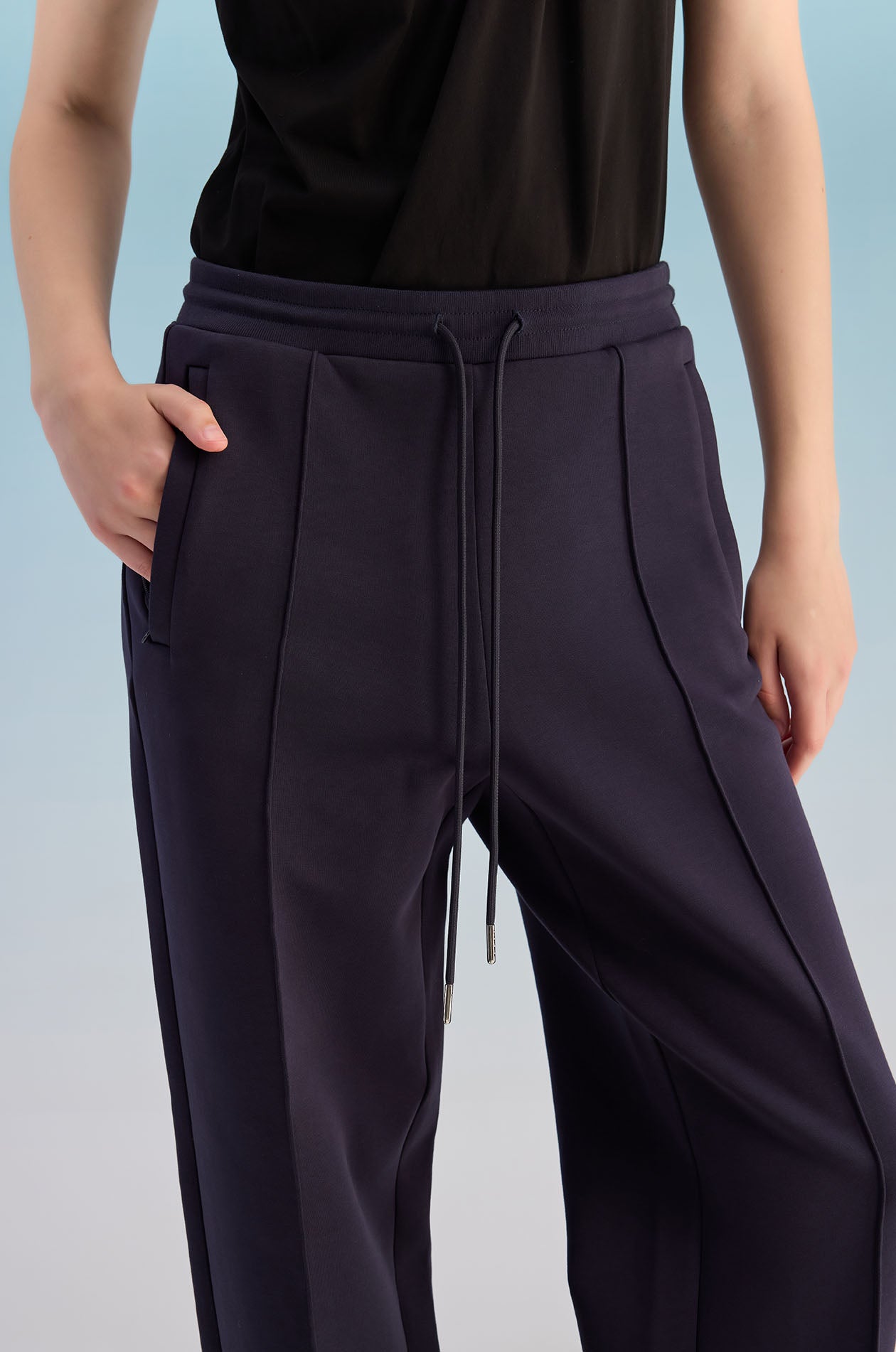 Mid-rise sweatpants in double jersey. Straight legs with front creases and side zip pockets. Elastic drawstring waistband. Available in grey and navy.