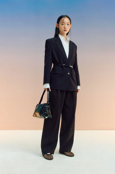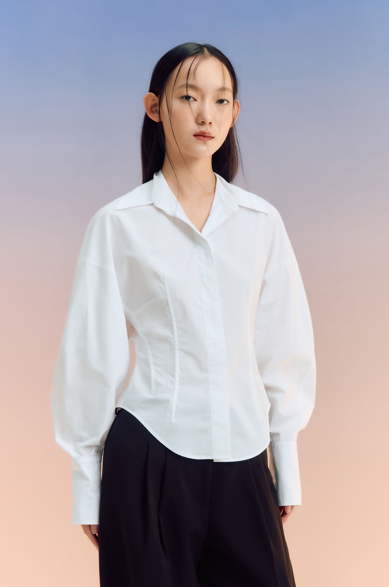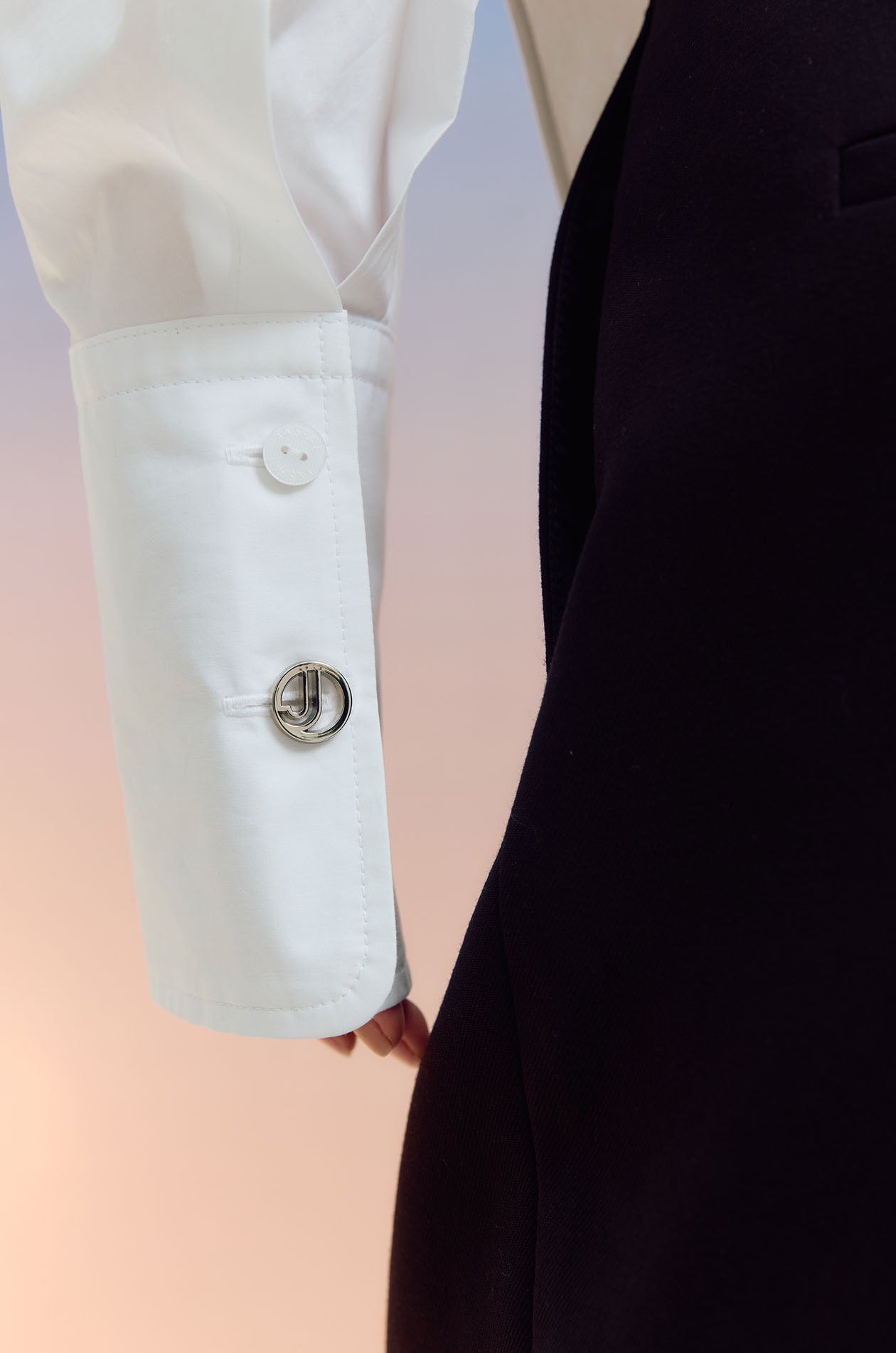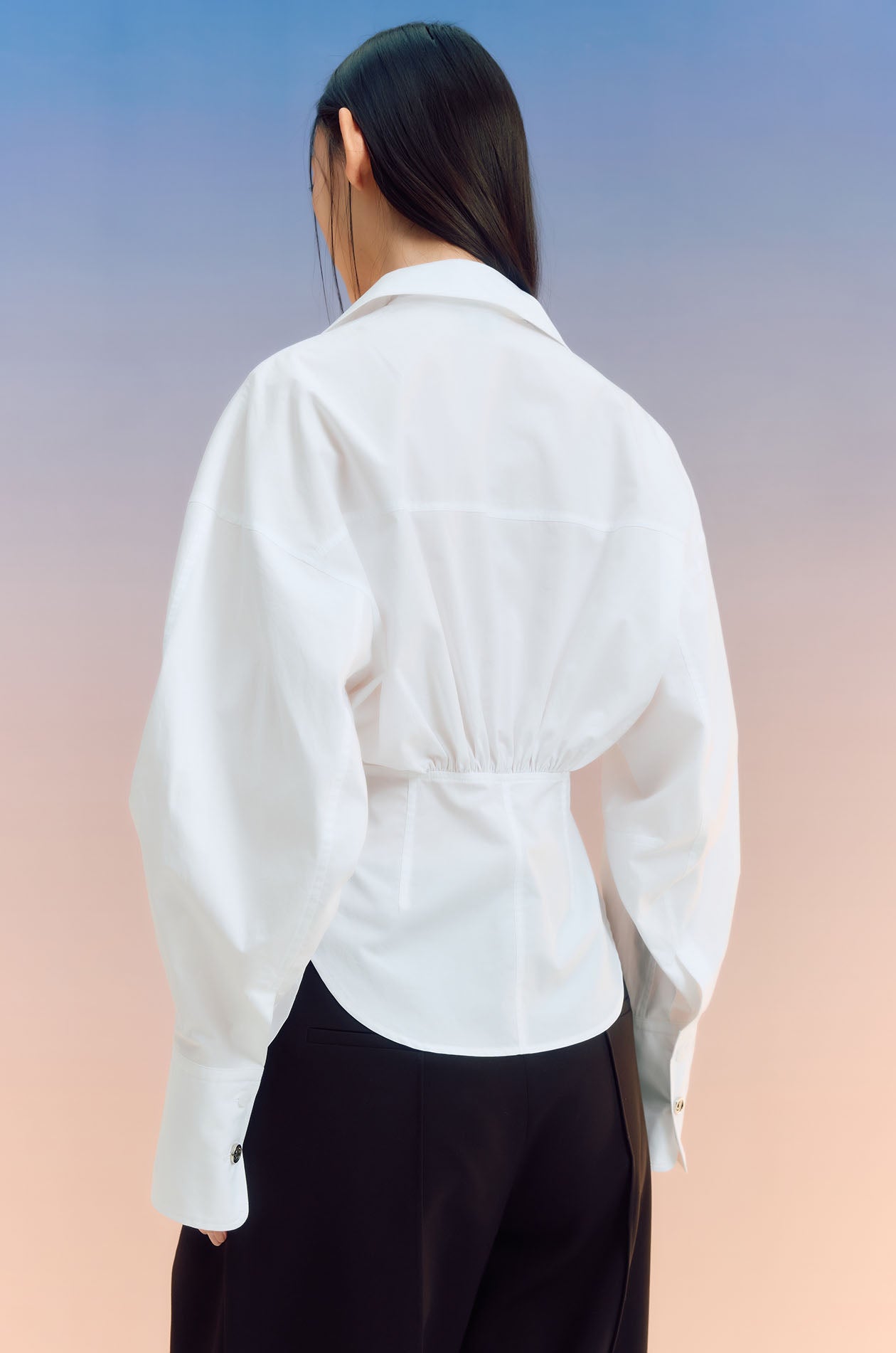 Drop-shoulder jacket in cotton poplin. Peplum silhouette with long-barrel sleeves. Spread collar, faux chest pockets, and oversized cuffs. Front button closure. Available in white.