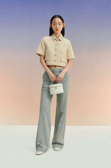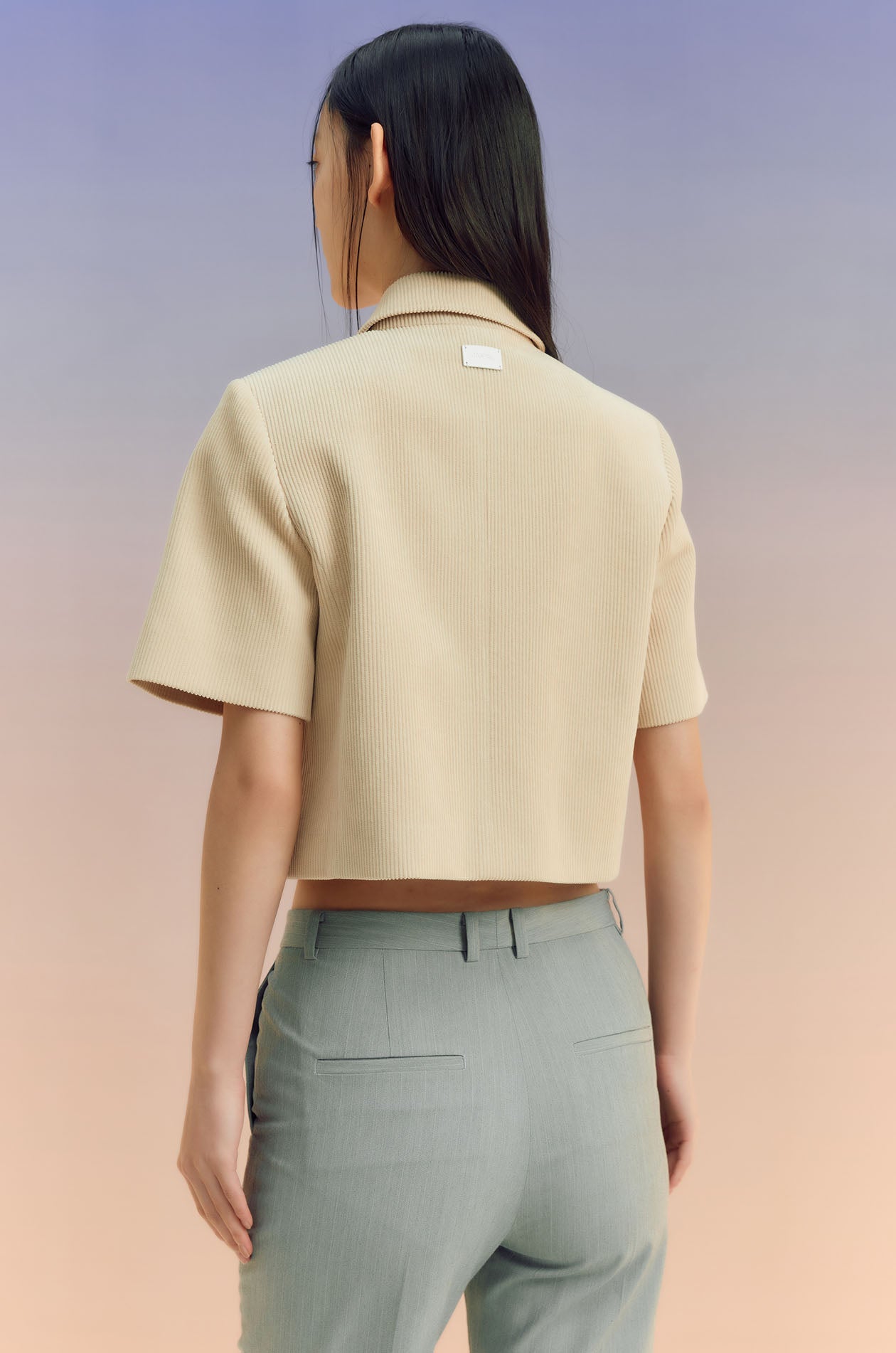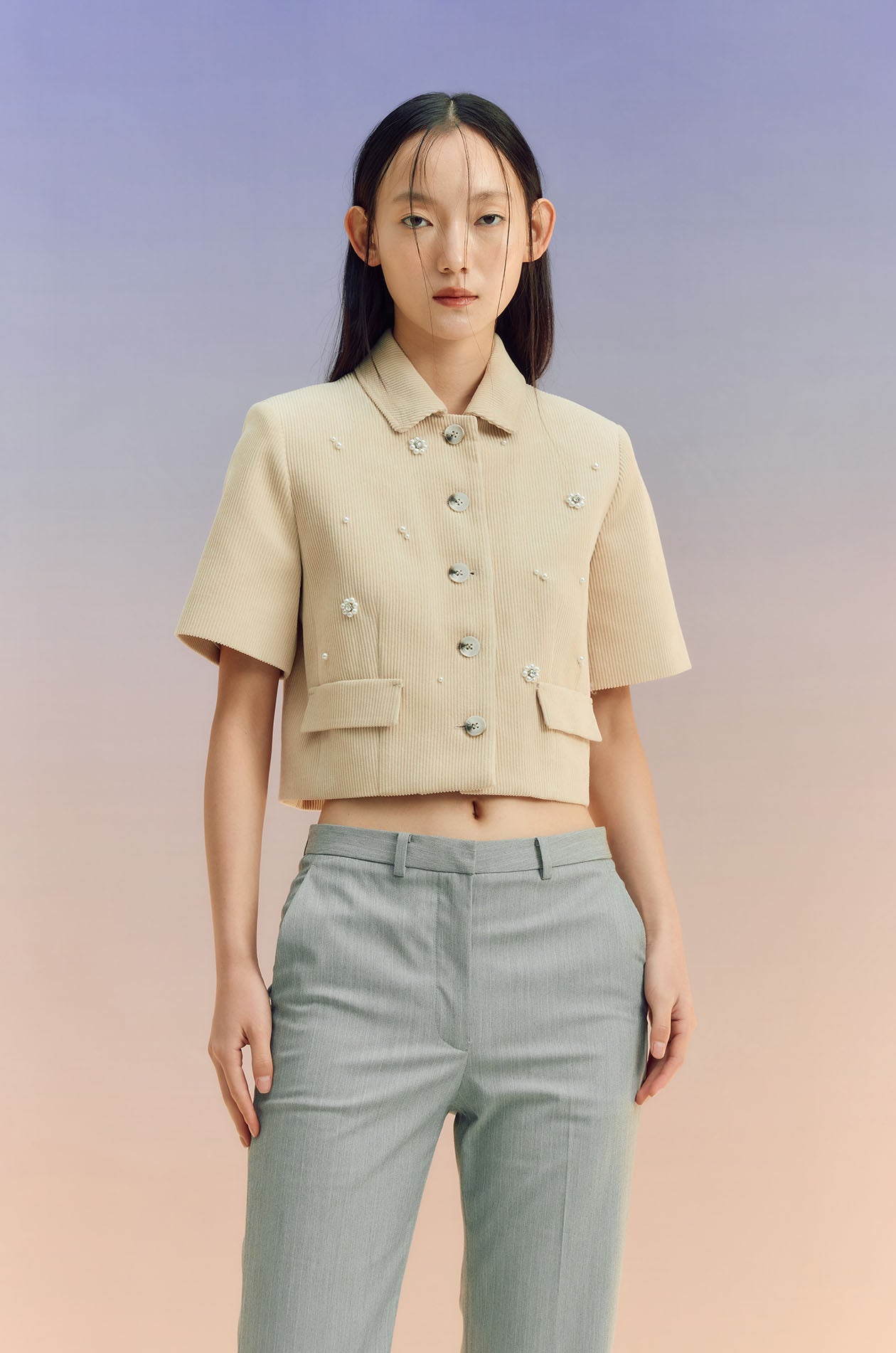 Short-sleeved cropped lady jacket in corduroy with faux jewel embellishment in a floral design. Regular fit with spread collar, padded shoulders, and faux pockets. Front button closure. Available in beige.